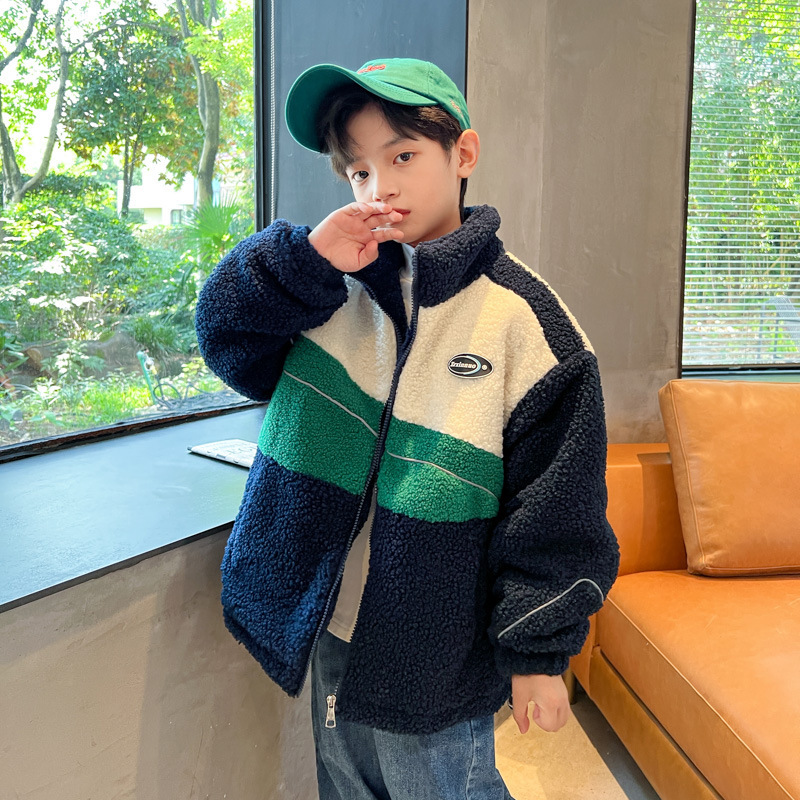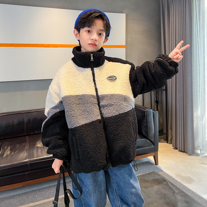 남학생 가을과 겨울 코트 두꺼운 코트 2024 미중 및 대형 어린이 잘 생긴 서양 스타일을위한 새로운 어린이 겨울 양고기 양털 스웨터스토어 가기