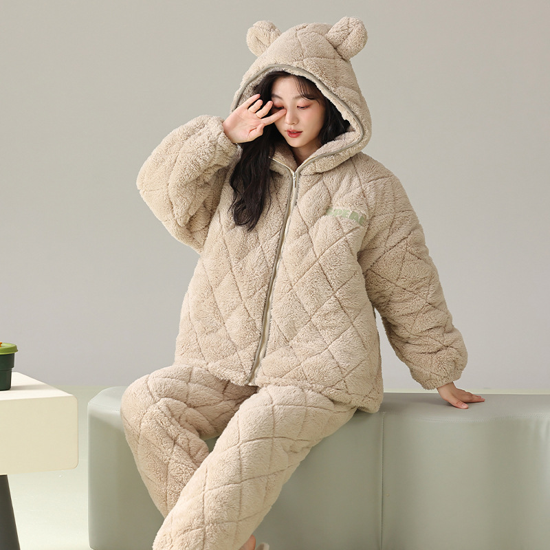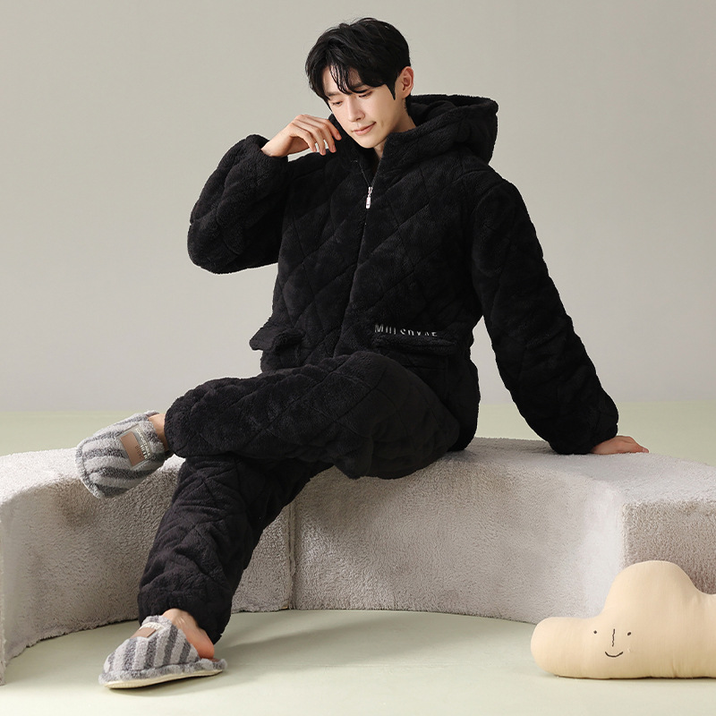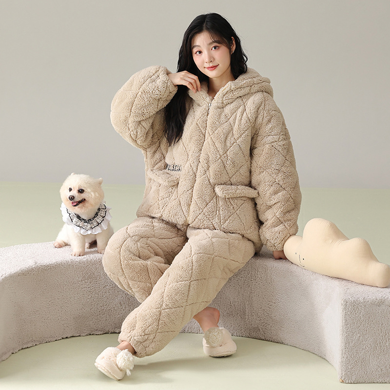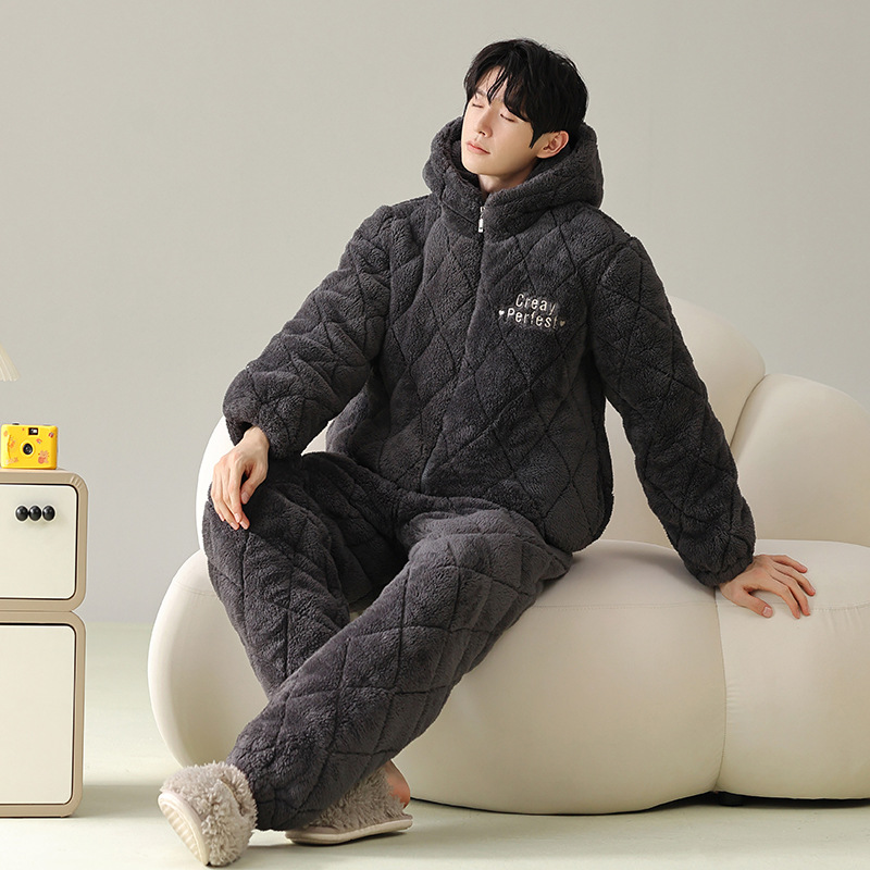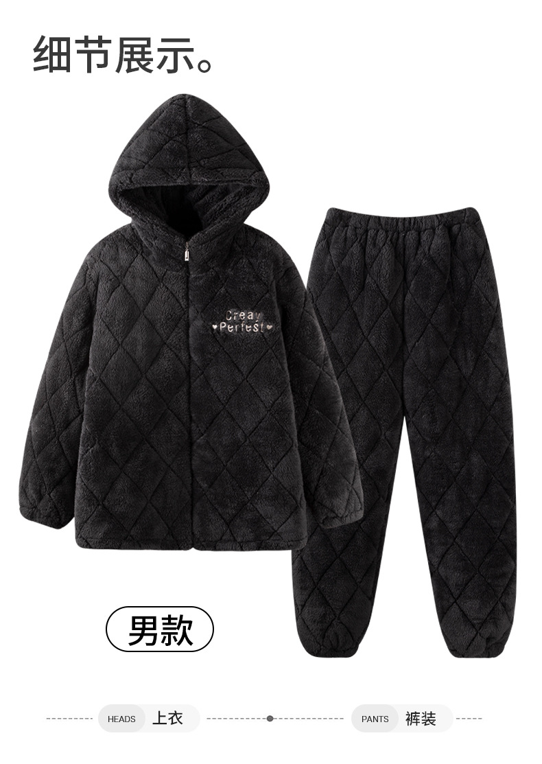 겨울 커플 잠옷 여성의 겨울 두꺼운 기모 따뜻한 3 층 산호 양털 퀼트 남성 긴팔 홈 의류 세트