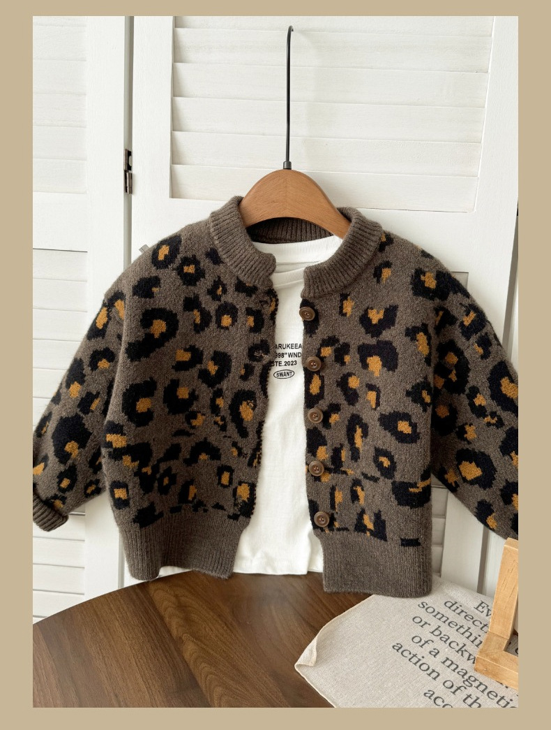 어린이 스웨터 카디건 2024 가을과 겨울 새로운 한국 스타일 서양식 어린이 레오파드 무늬 니트 한국 스타일 유행 탑스토어 가기