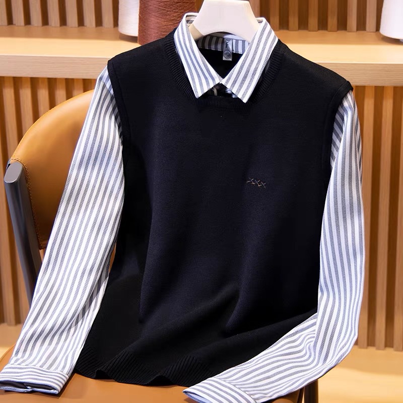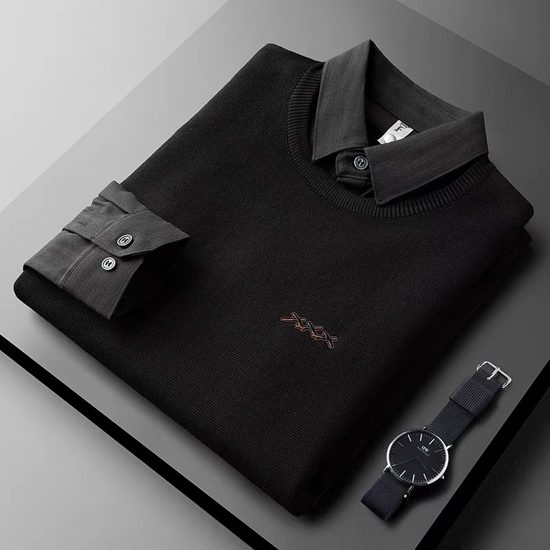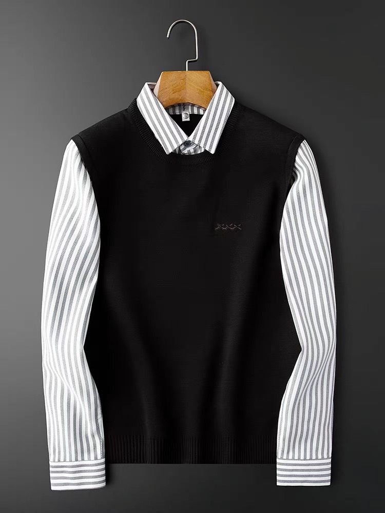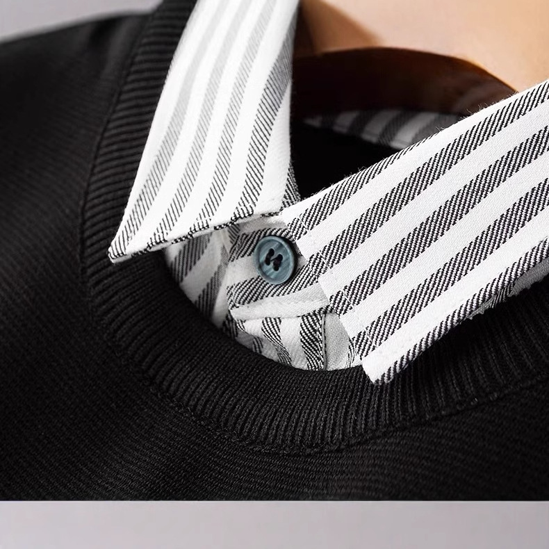 가을과 겨울 빛 럭셔리 스트라이프 셔츠 칼라 니트 셔츠 페이크 투피스 세트 남성용 슬림핏 하이 엔드 비즈니스 캐주얼 콘트라스트 스웨터