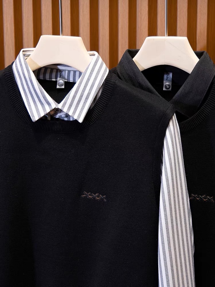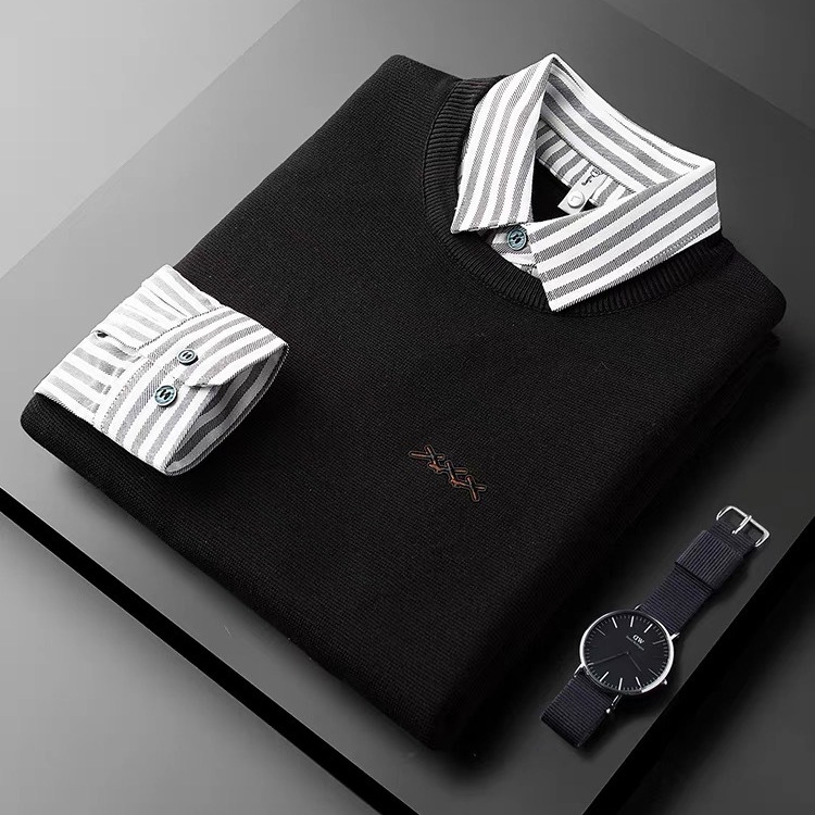 가을과 겨울 빛 럭셔리 스트라이프 셔츠 칼라 니트 셔츠 페이크 투피스 세트 남성용 슬림핏 하이 엔드 비즈니스 캐주얼 콘트라스트 스웨터스토어 가기
