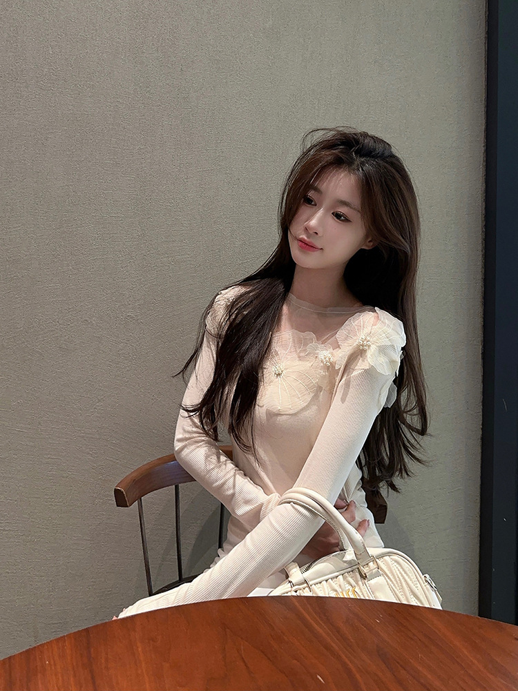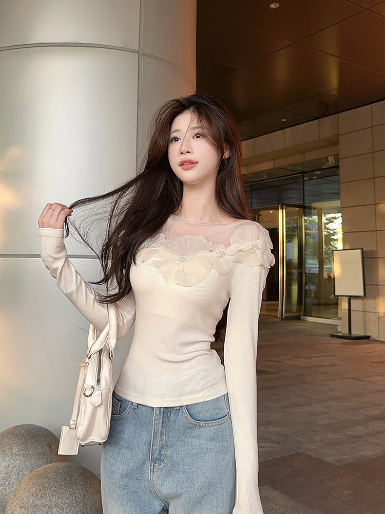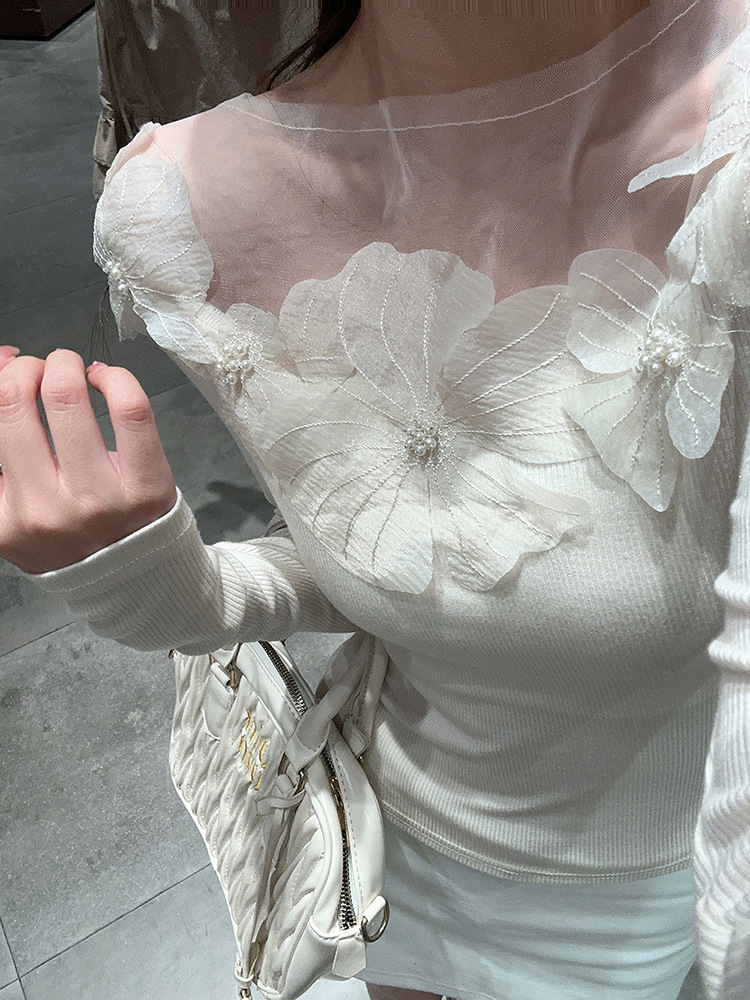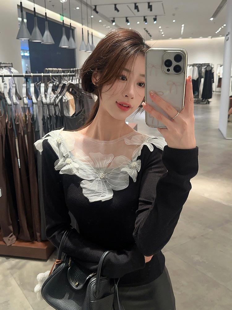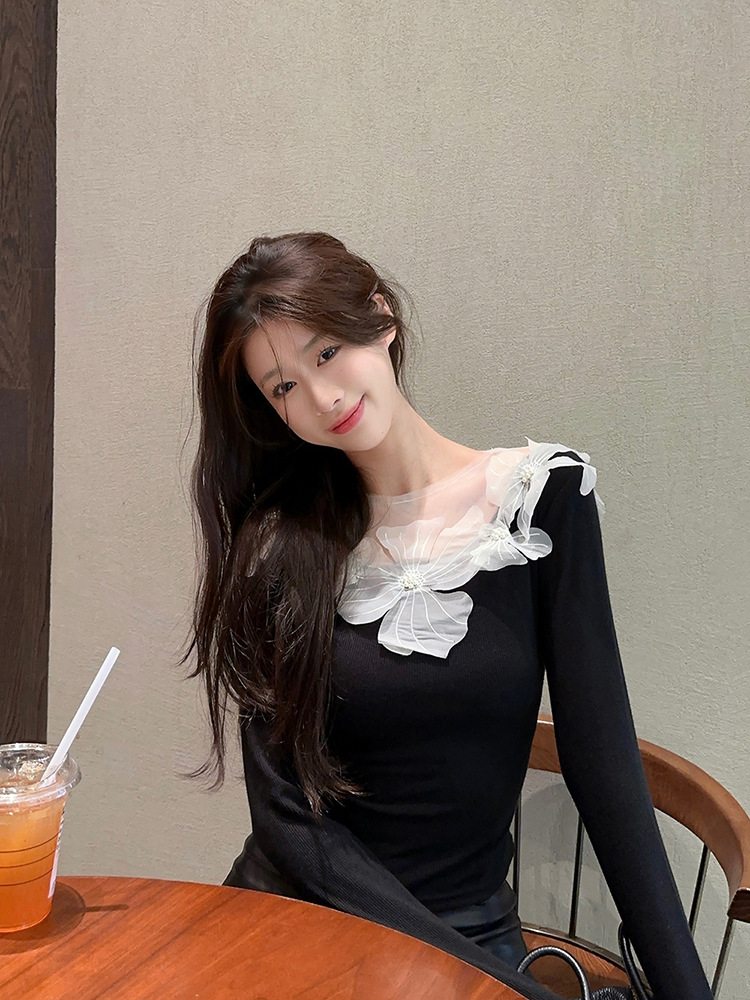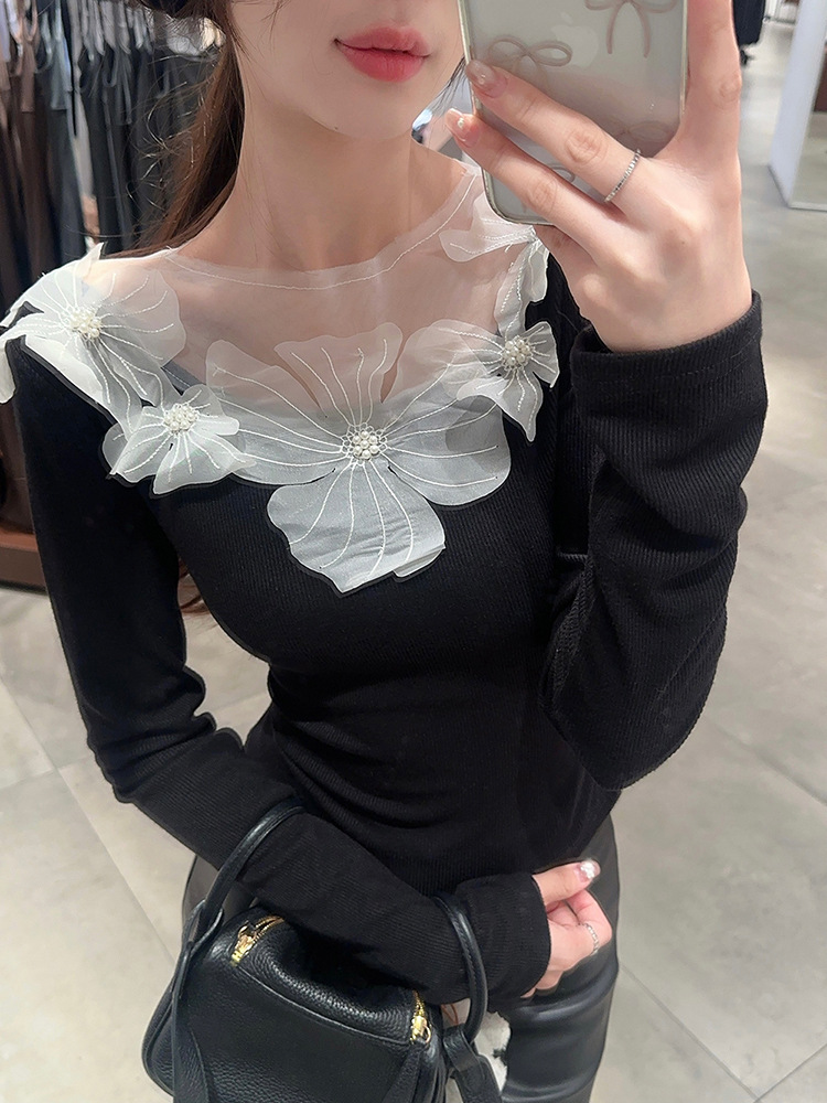 프랑스 스타일 3 차원 꽃 긴팔 티셔츠 여성의 초가을 새로운 디자인 센스 슬림 핏 슬리밍 아름다운 트렌디 탑
