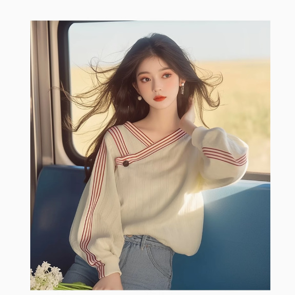 초가을 2024 새로운 한국 스타일 게으른 스타일 슈퍼 잘 생긴 작은 느슨한 어깨 살구색 줄무늬 긴 소매 스웨트 셔츠