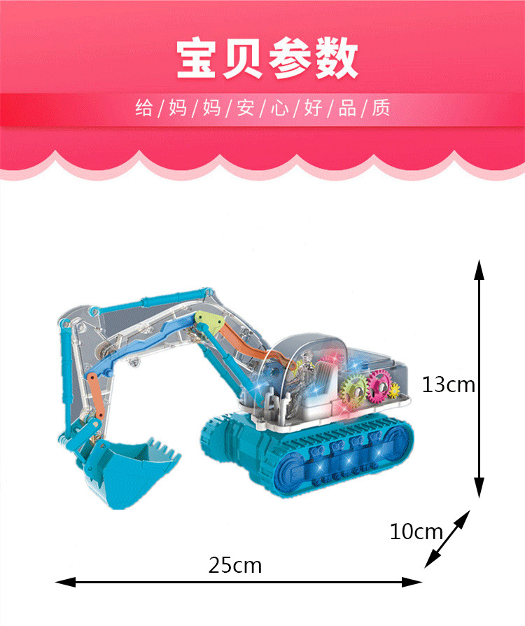 유니버설 투명 기어 굴삭기 전기 퍼즐 시뮬레이션 모델 엔지니어링 차량 조명 장난감 생일 6 월 1 일 선물