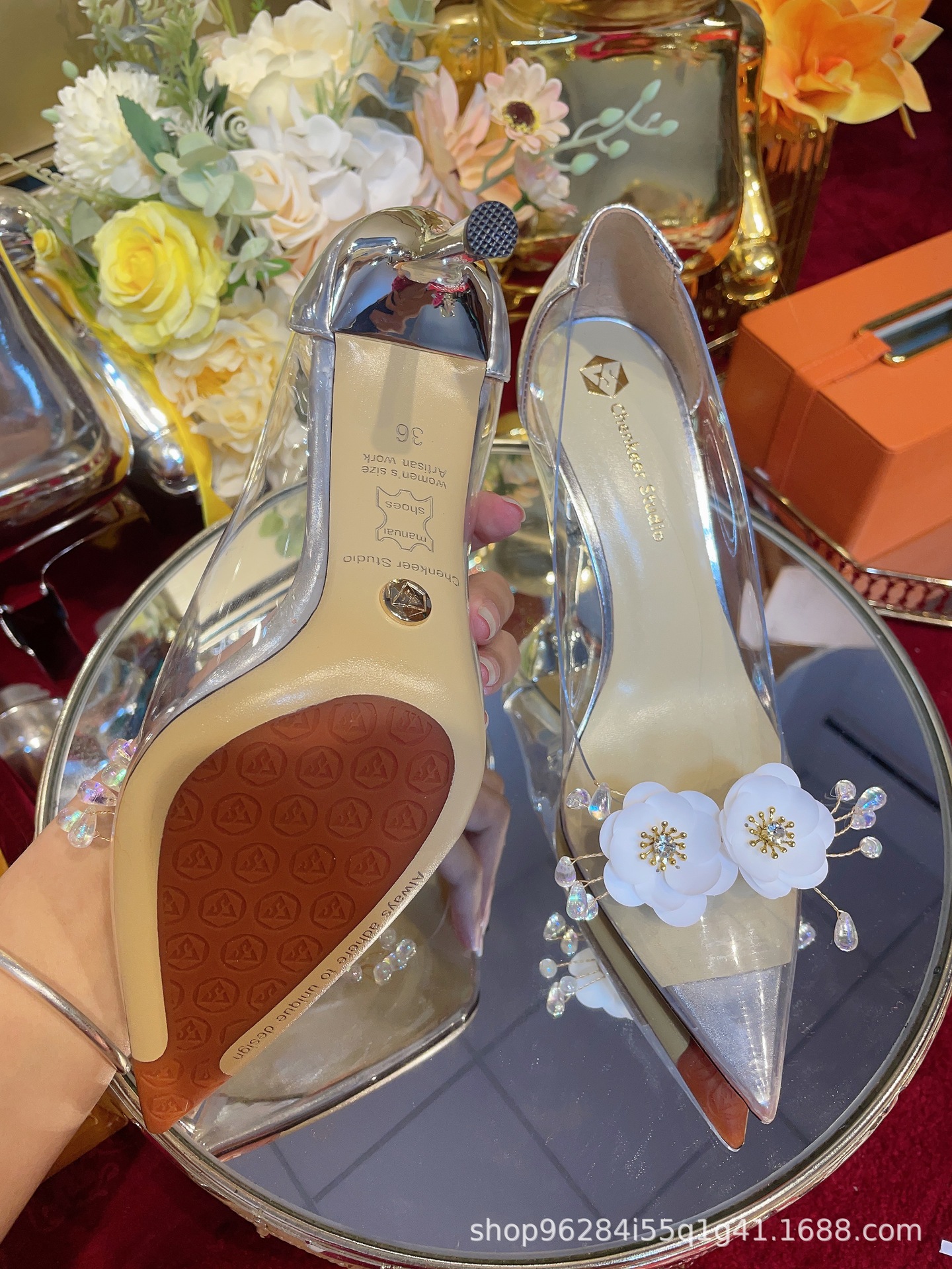 프랑스 투명 하이힐 여성용 스틸레토 힐 2024 여름 새로운 도착 아름다운 크리스탈 웨딩 신발 라인스톤 포인팅 신발스토어 가기