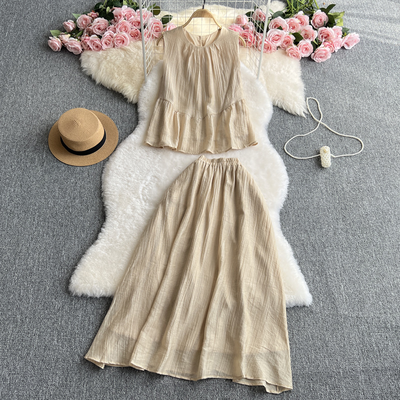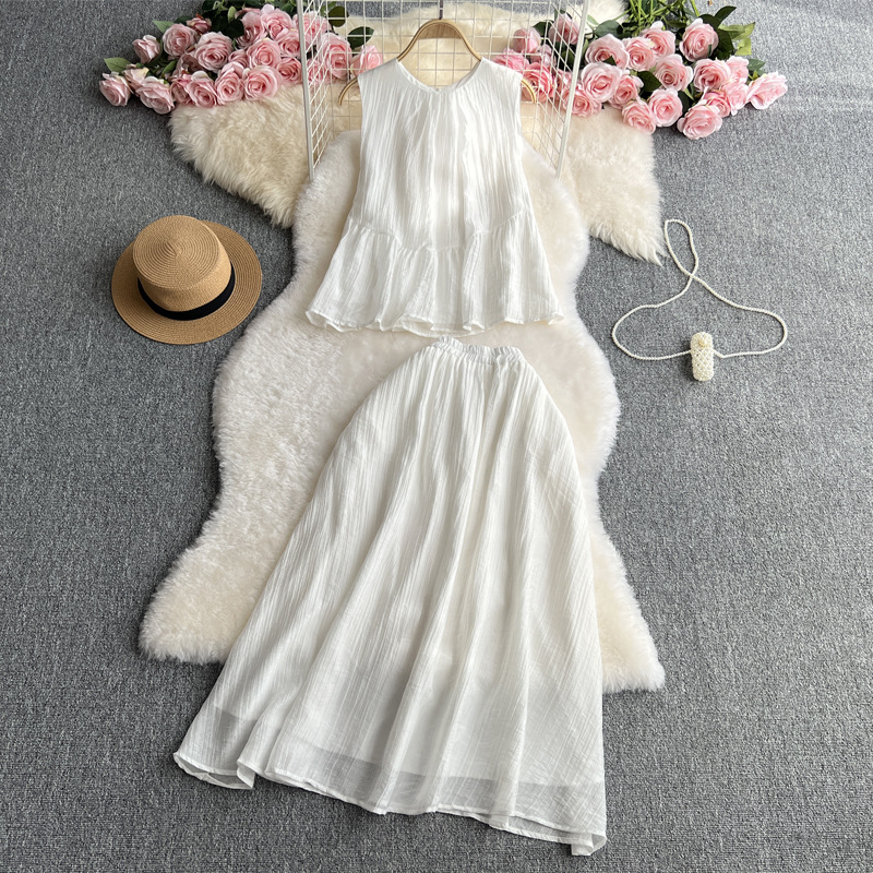 부드러운 스타일 원피스 여성 프랑스 스타일 달콤한 느슨한 민소매 탑 높은 허리 슬리밍 대형 스윙 스커트 투피스 세트