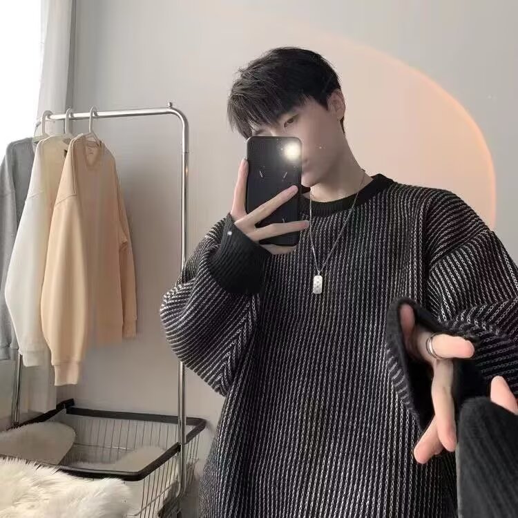 2024 가을과 겨울 줄무늬 크루 넥 스웨터 스웨터 남자 새로운 흑백 패션 레트로 느슨한 올 매치 스웨터 재킷스토어 가기