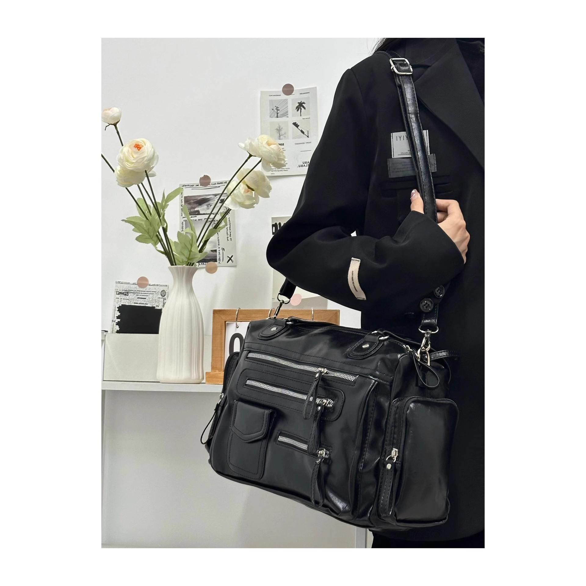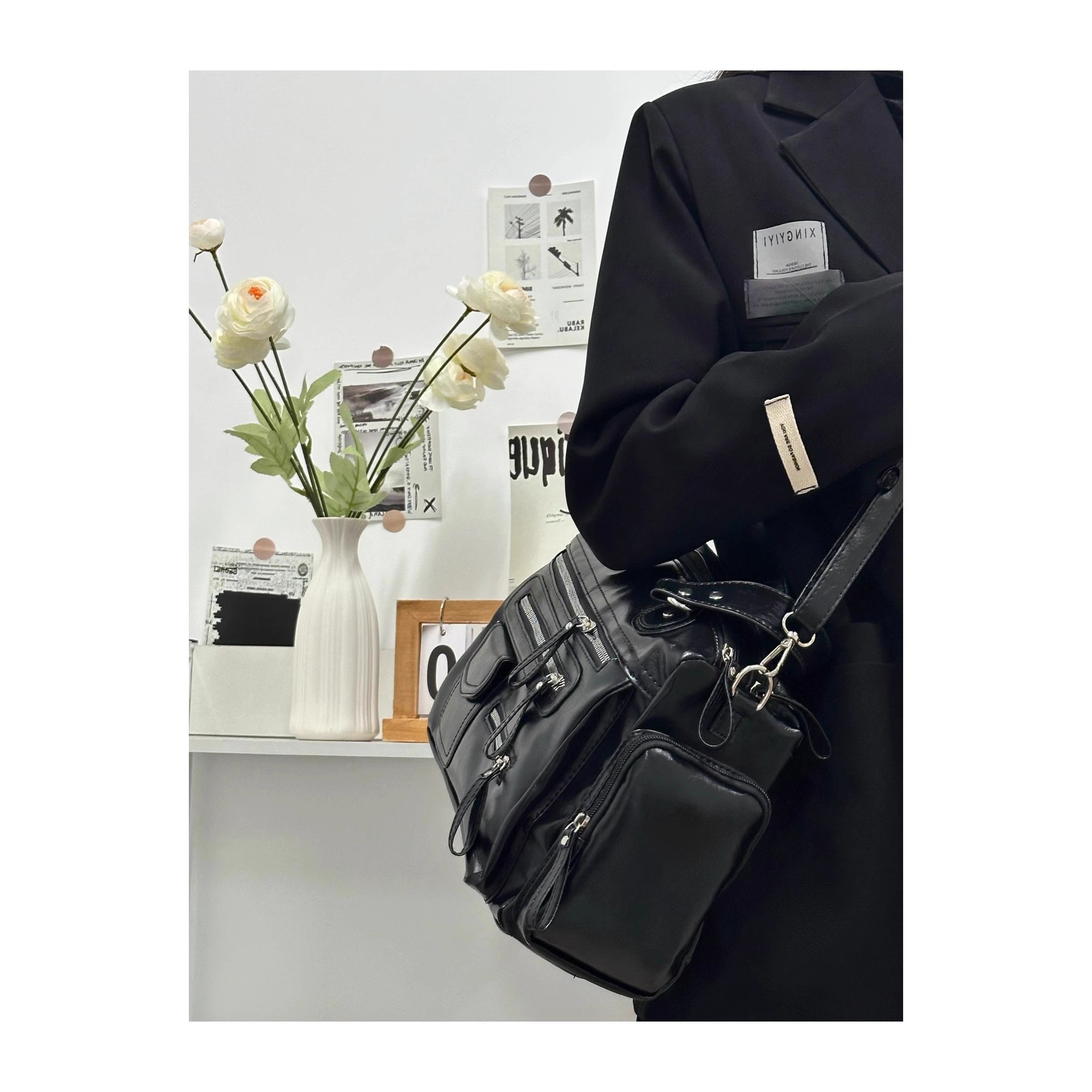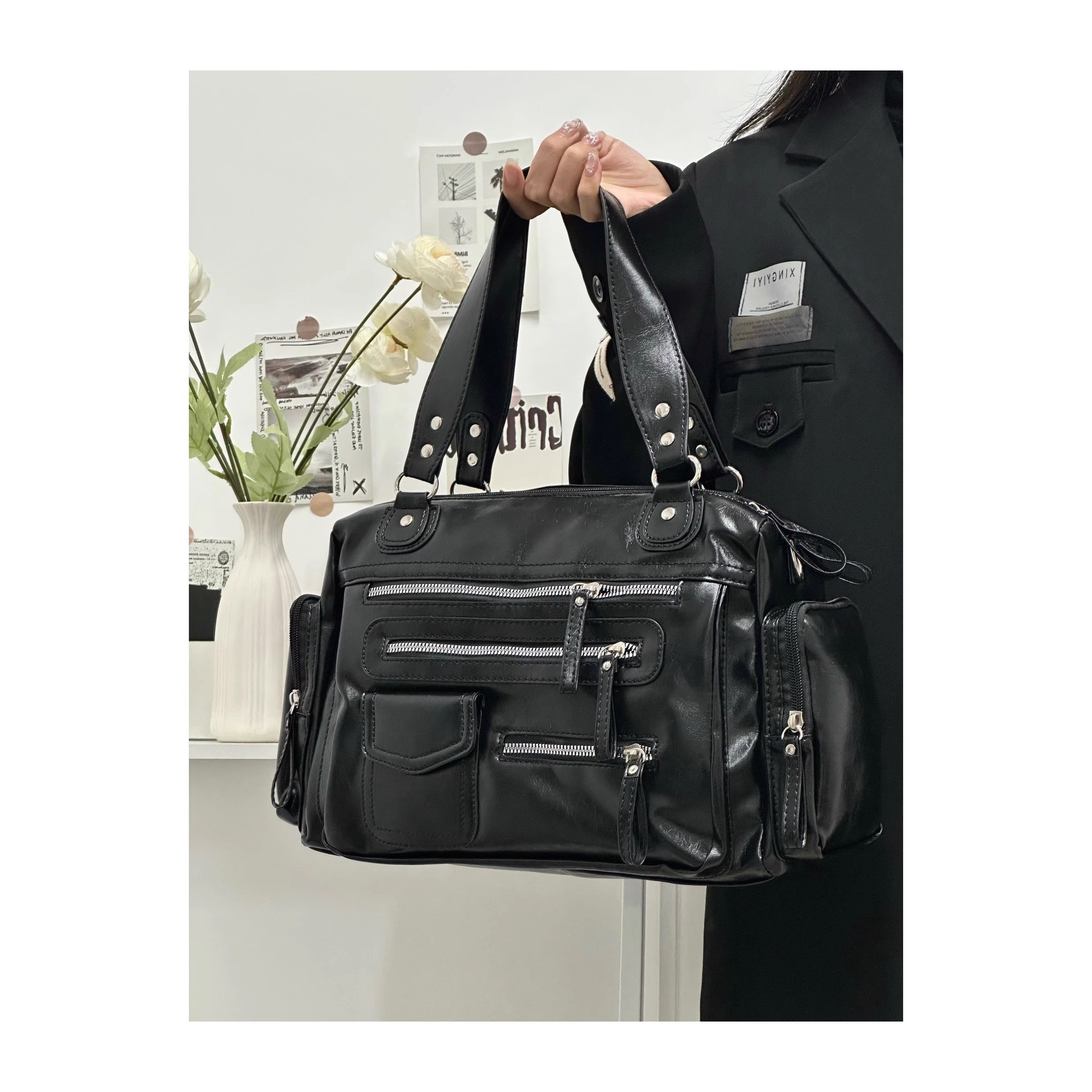 CDIWRI & KARI 틈새 디자인 새로운 펑크 블랙 대용량 토트 어깨 크로스 바디 백 핸드백