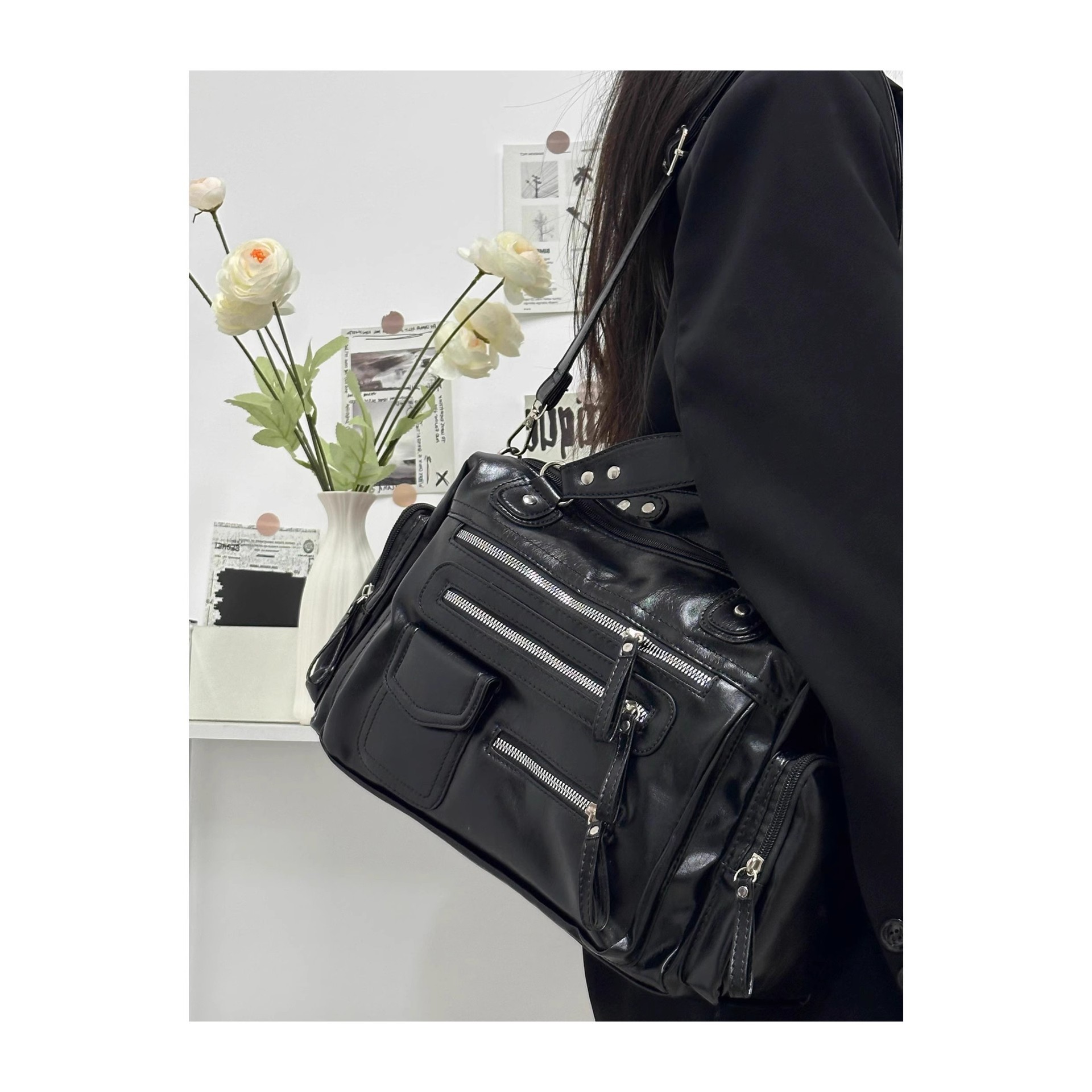 CDIWRI & KARI 틈새 디자인 새로운 펑크 블랙 대용량 토트 어깨 크로스 바디 백 핸드백스토어 가기