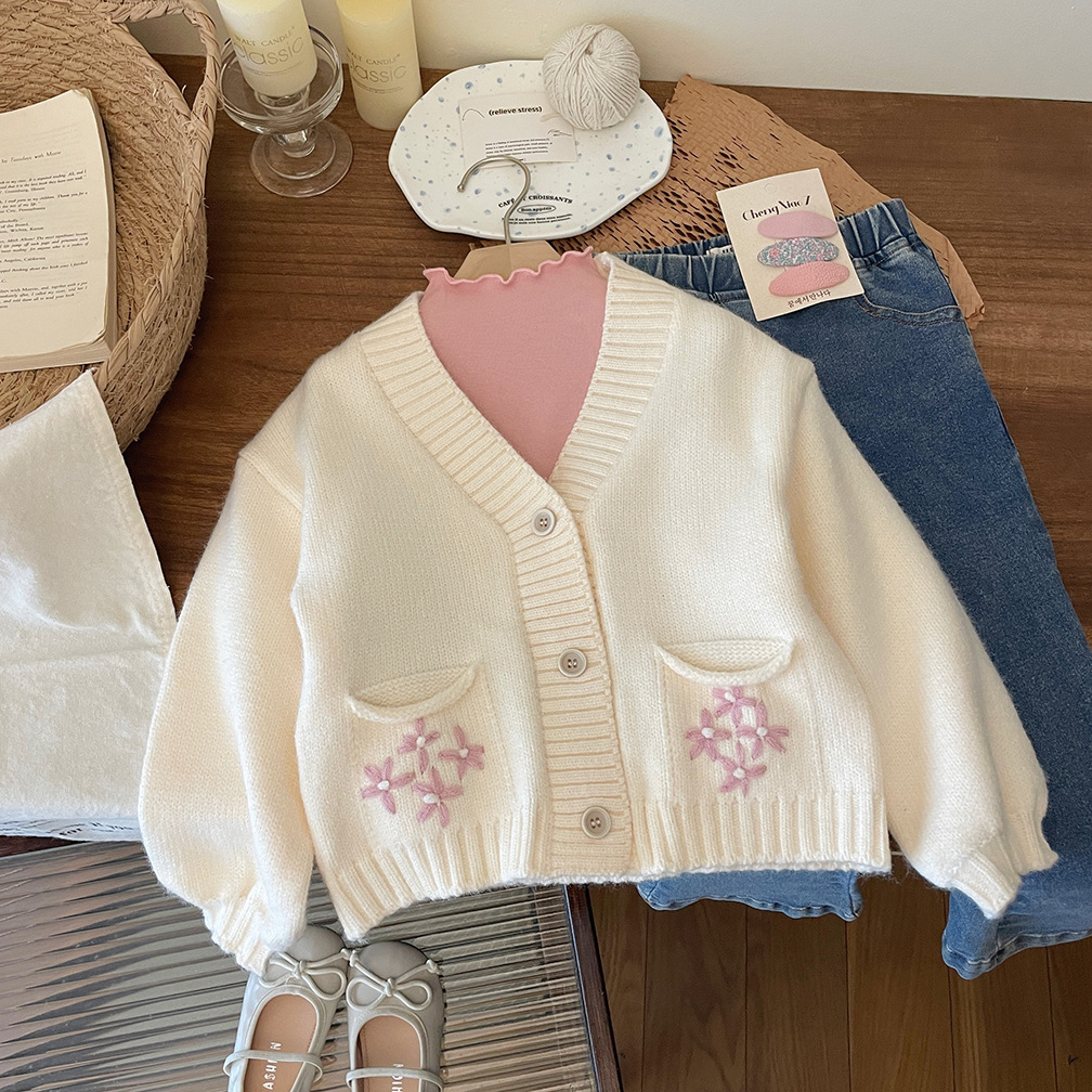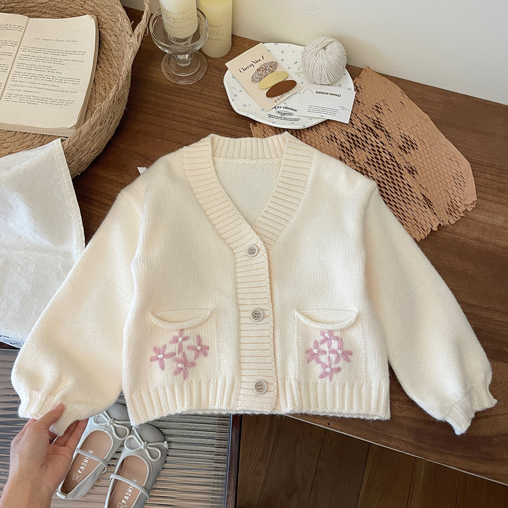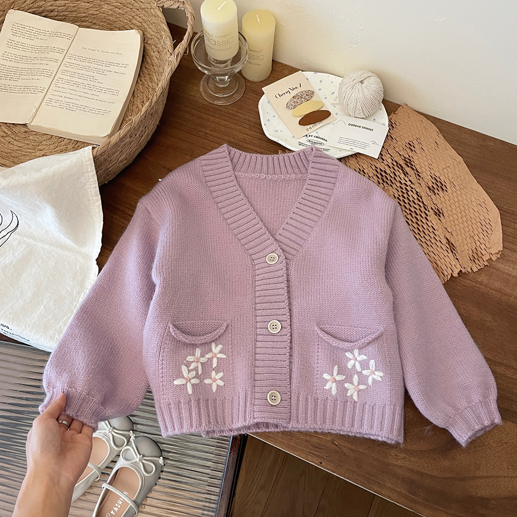 한국 스타일 아동 의류 소녀 스웨터 재킷 2025 가을, 겨울 새로운 어린이 수제 크로 셰 뜨개질 V 넥 니트 카디건 탑