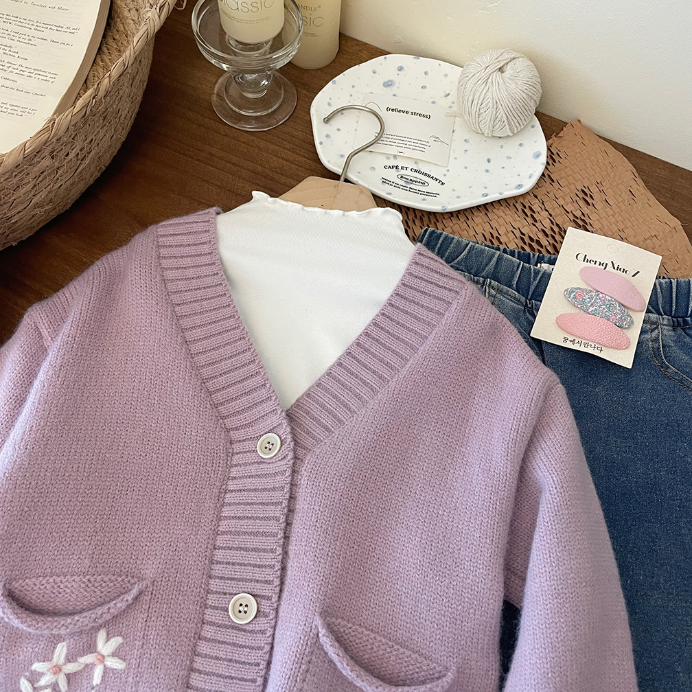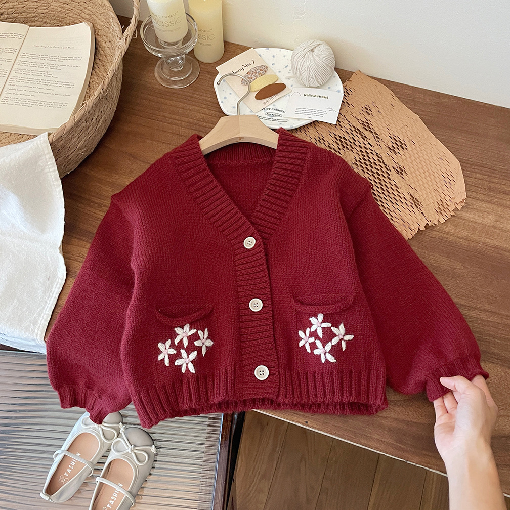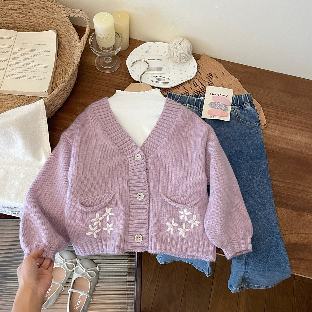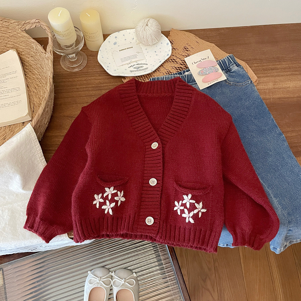 한국 스타일 아동 의류 소녀 스웨터 재킷 2025 가을, 겨울 새로운 어린이 수제 크로 셰 뜨개질 V 넥 니트 카디건 탑