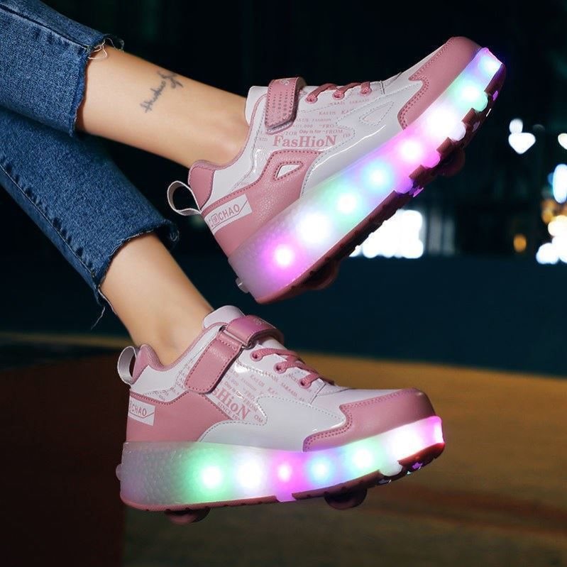 롤러 스케이트를 가진 소녀 운동화 스케이트로 바꿀 수있는 신발 소녀는 바퀴로 걸을 수 있습니다.