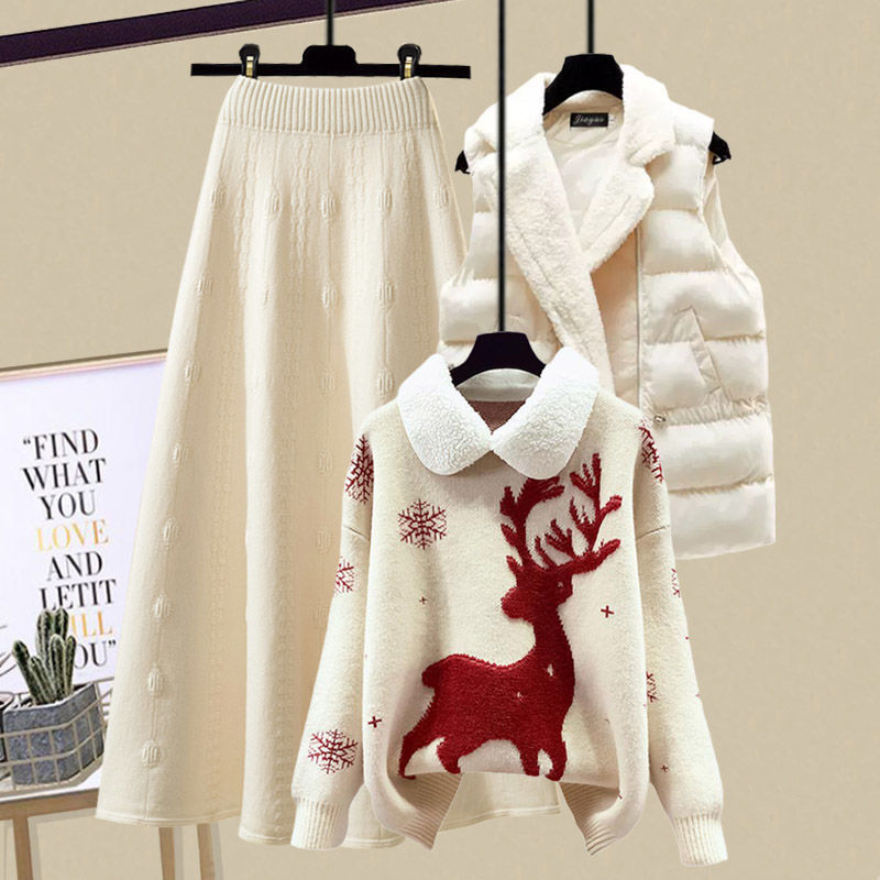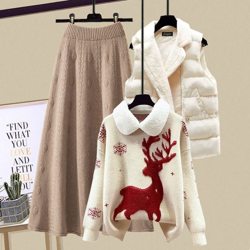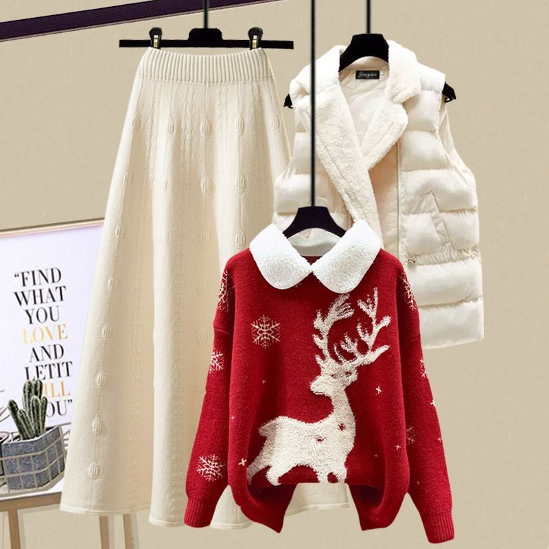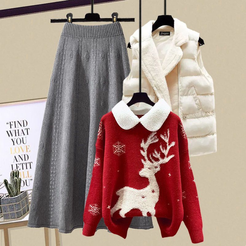 2024 가을/겨울 세트 여성의 새로운 크리스마스 분위기 레드 스웨터 조커 조끼 슬림 스커트 3 피스 세트스토어 가기