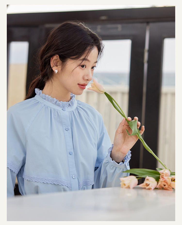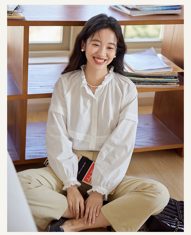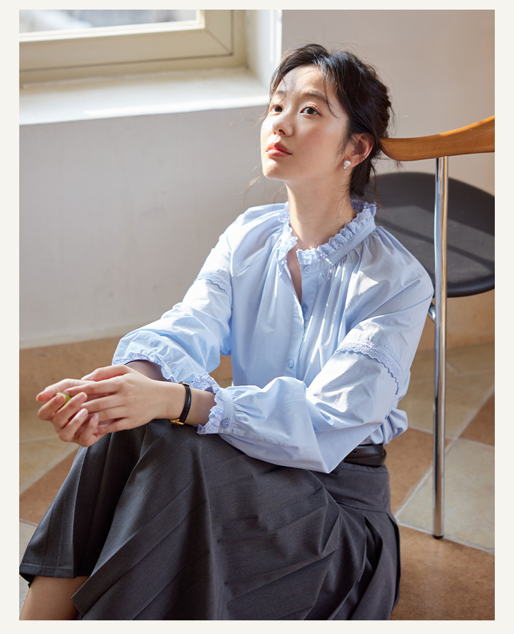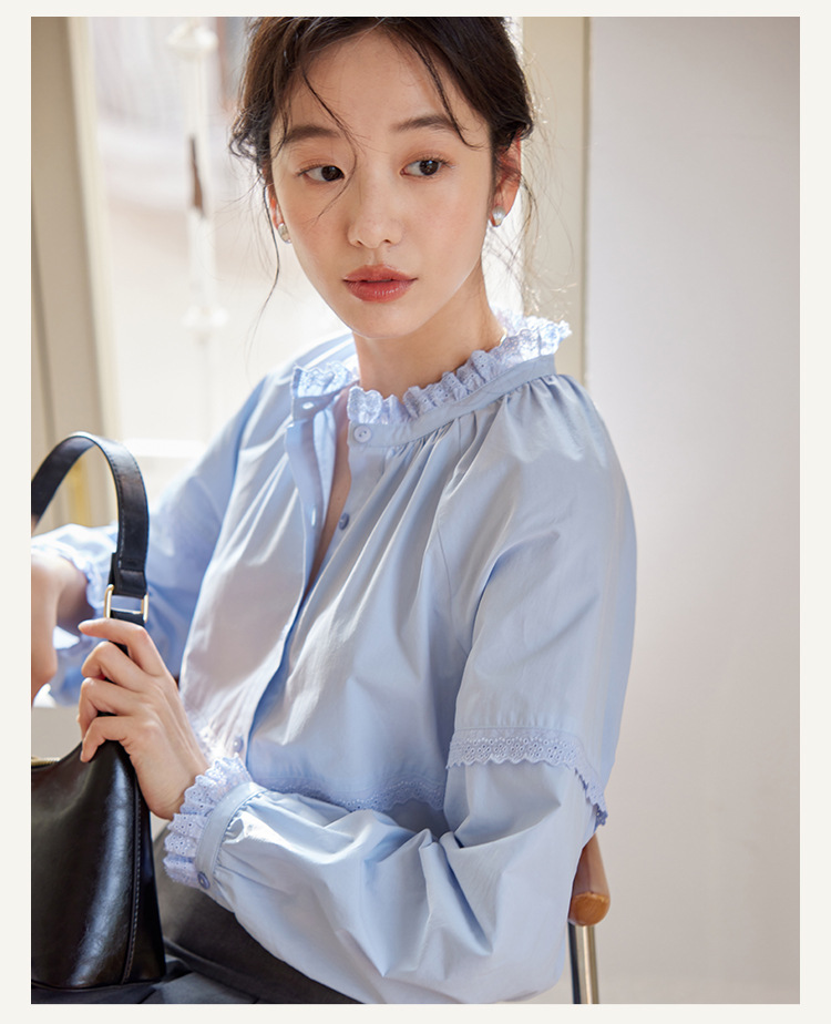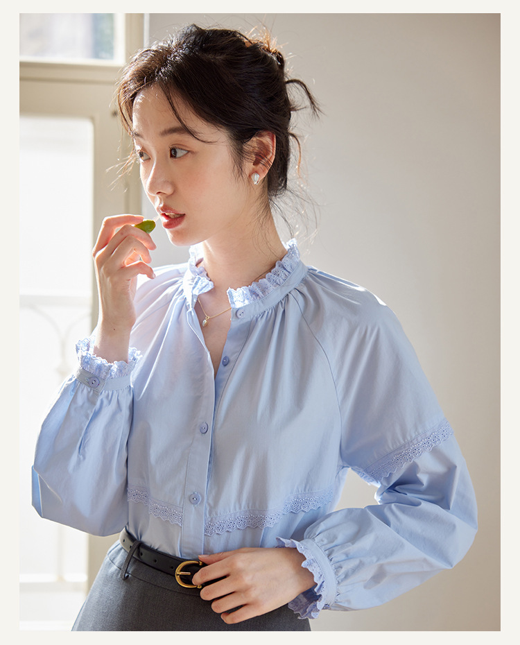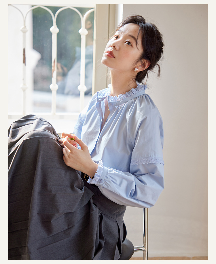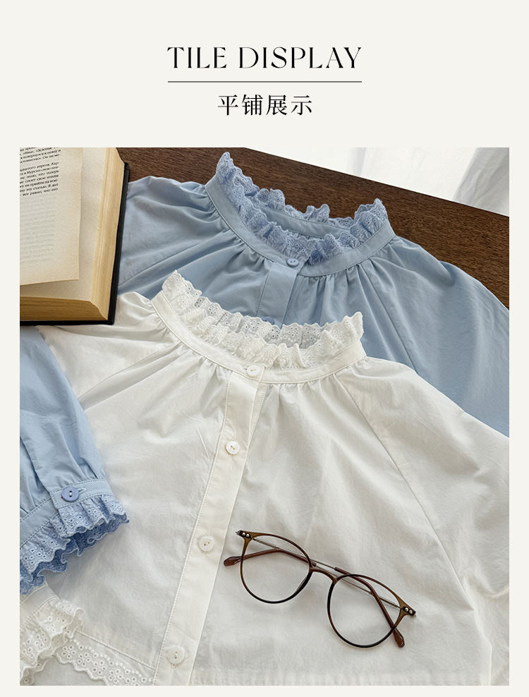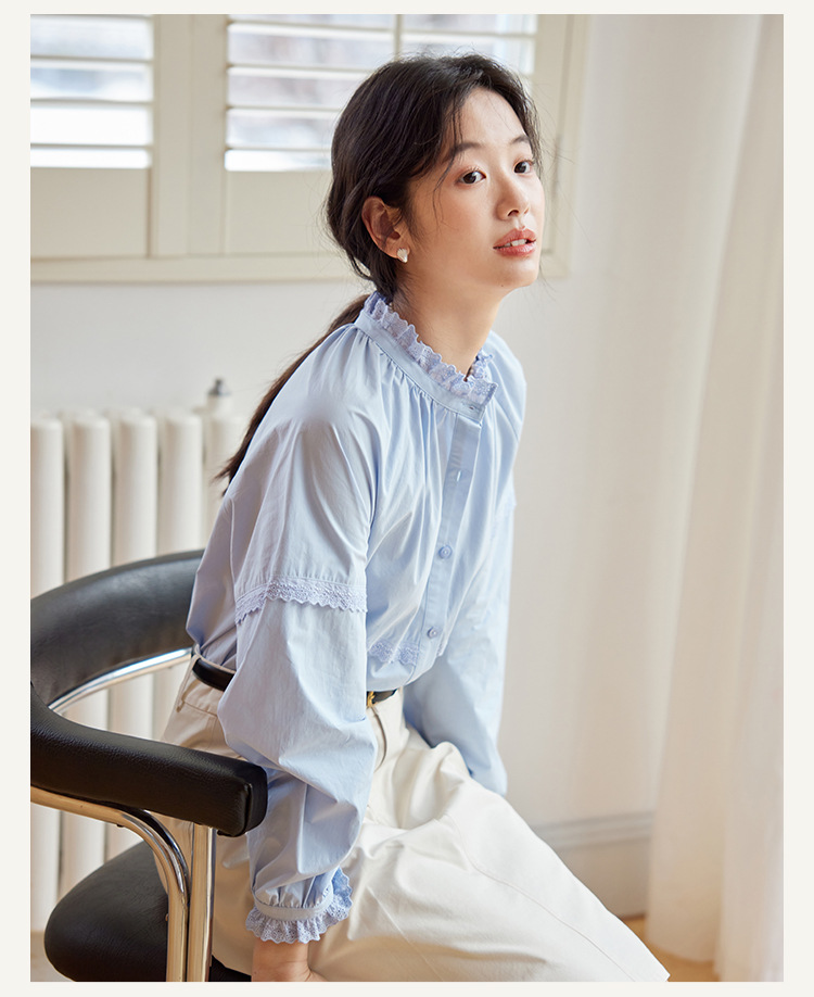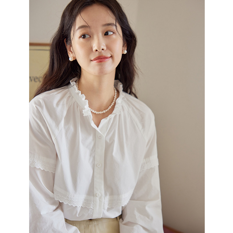 Moriirose 화이트/블루 레이스 셔츠 수직 칼라 여성 가을 프랑스 긴 소매 느슨한 우아한 탑스토어 가기