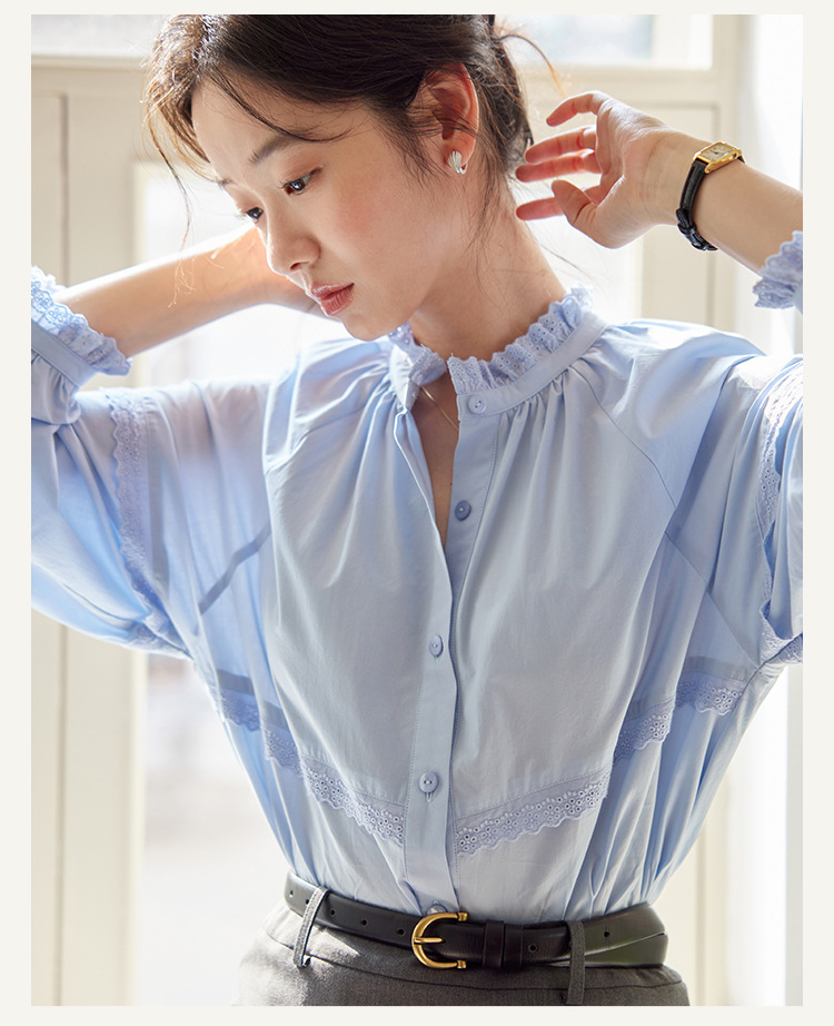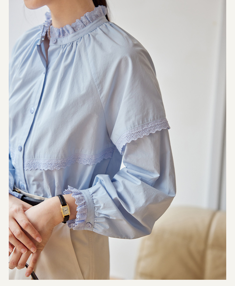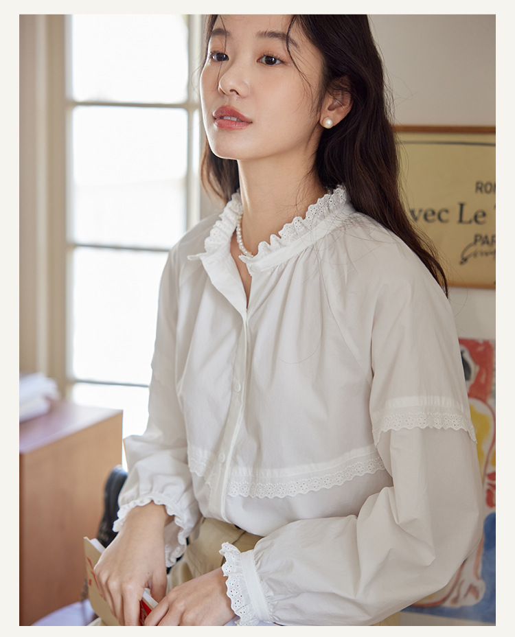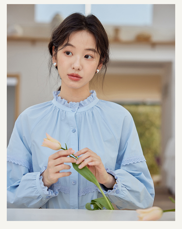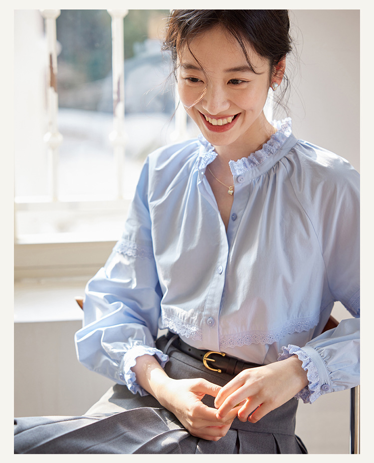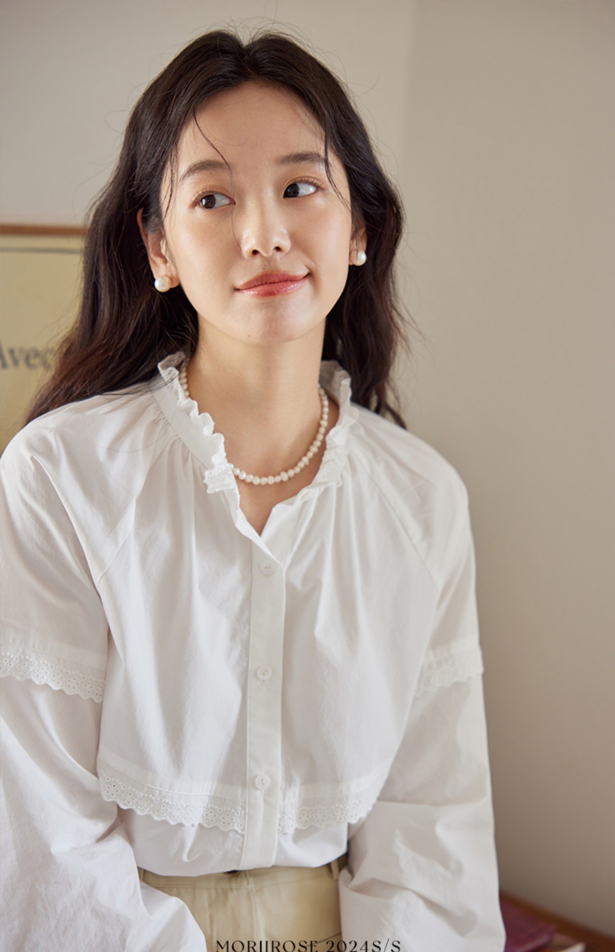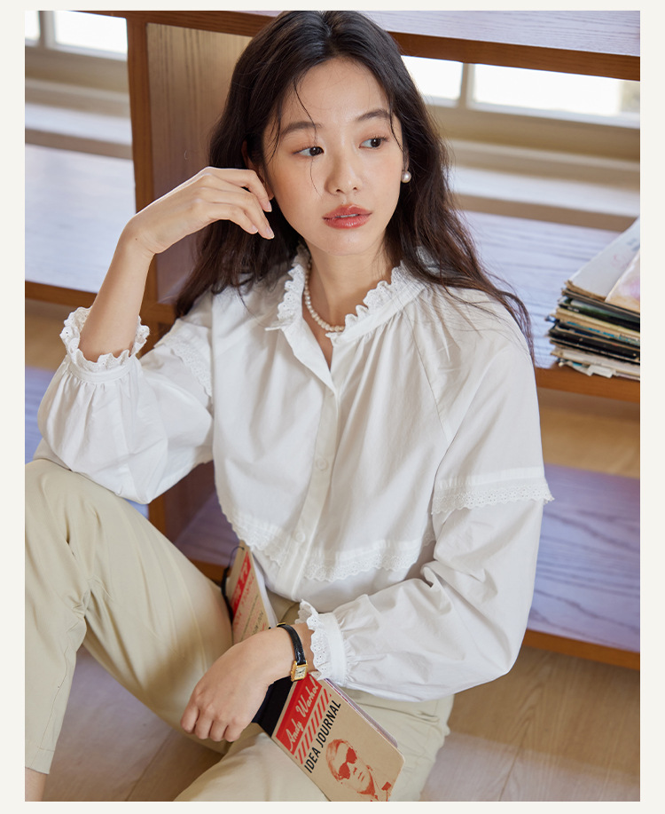 Moriirose 화이트/블루 레이스 셔츠 수직 칼라 여성 가을 프랑스 긴 소매 느슨한 우아한 탑스토어 가기