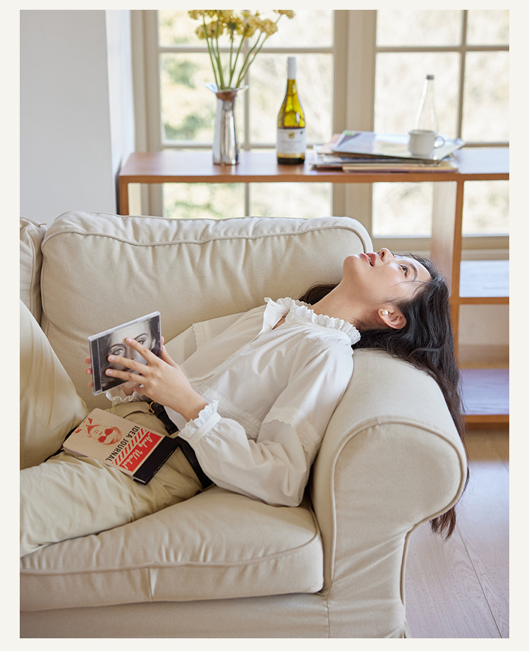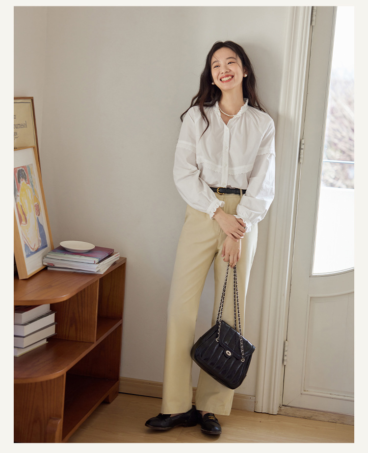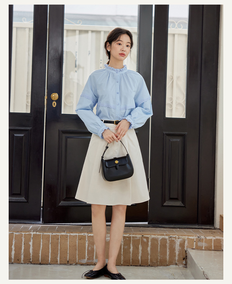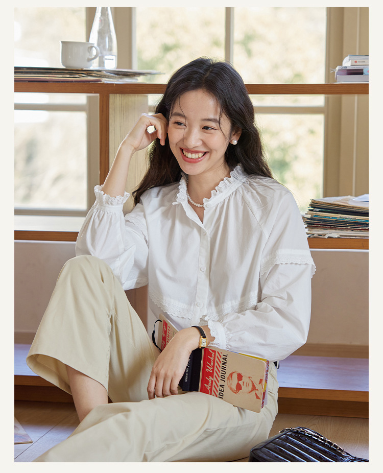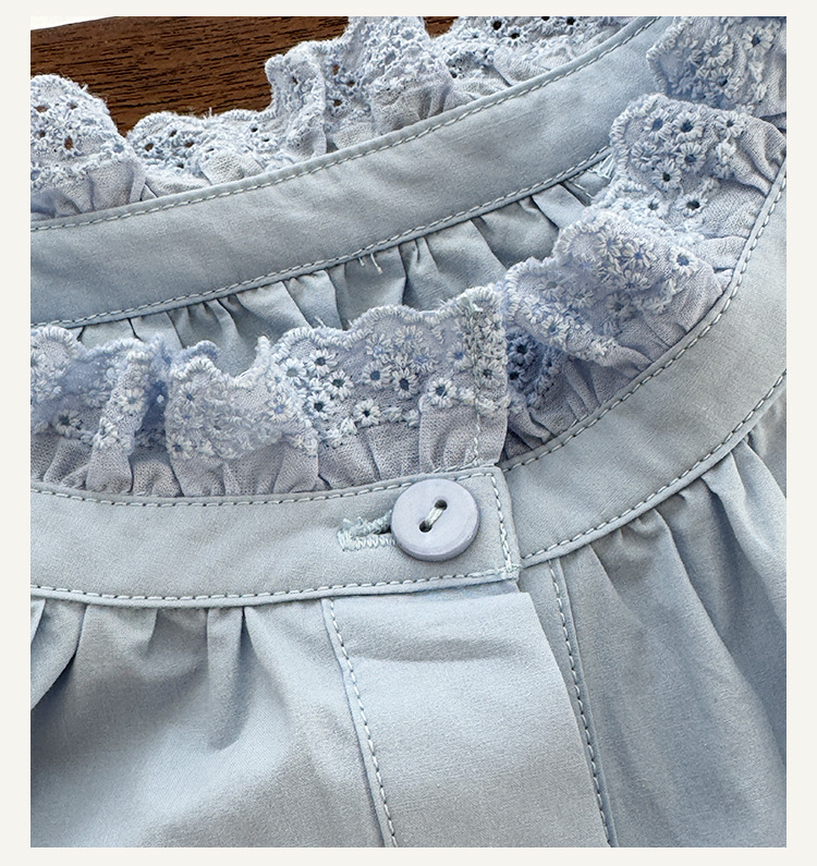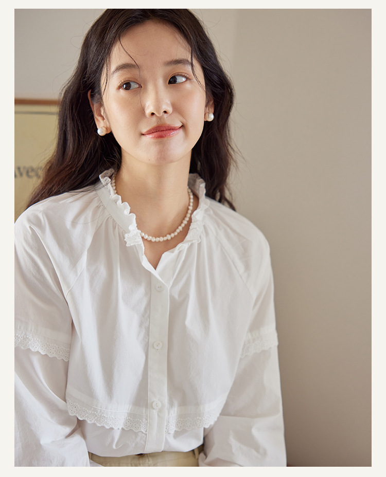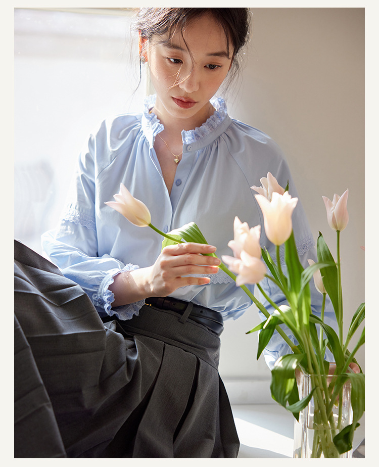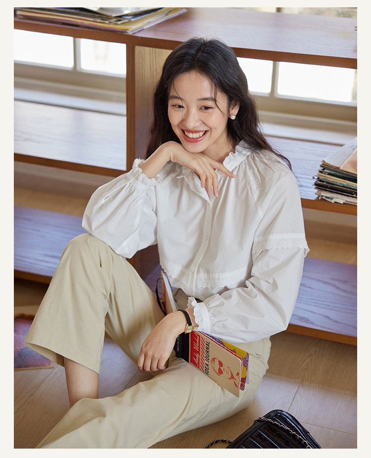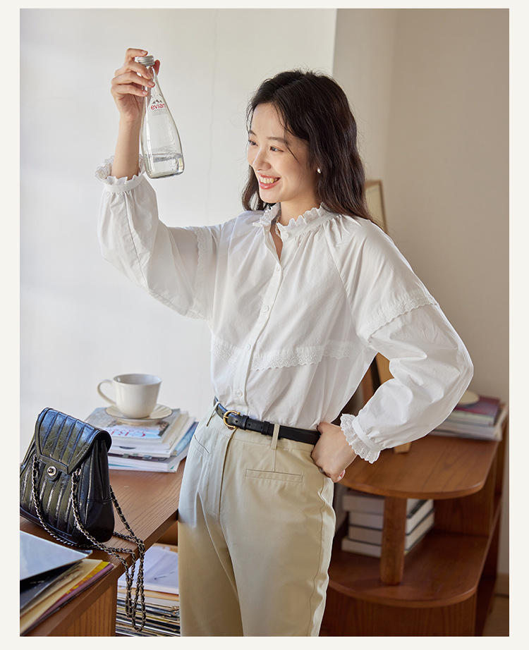 Moriirose 화이트/블루 레이스 셔츠 수직 칼라 여성 가을 프랑스 긴 소매 느슨한 우아한 탑스토어 가기