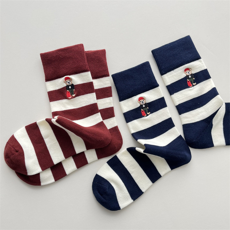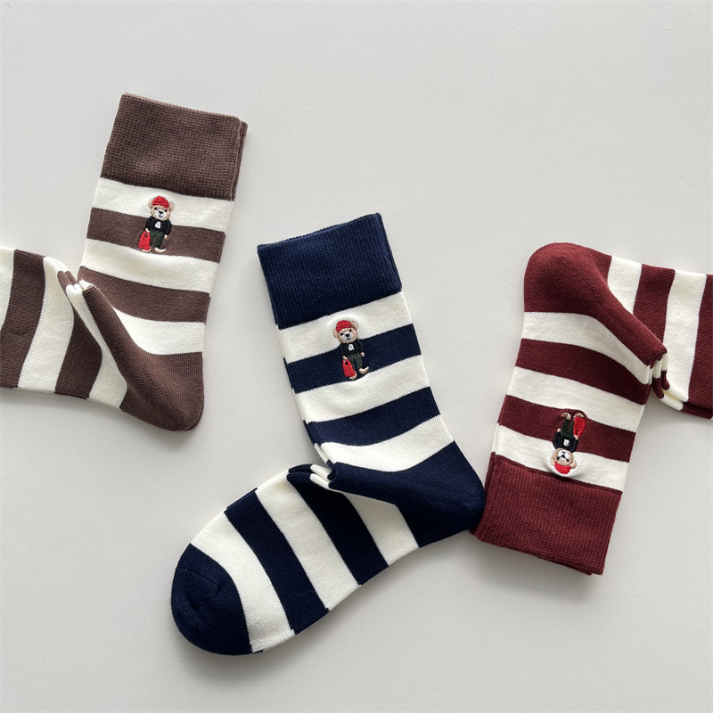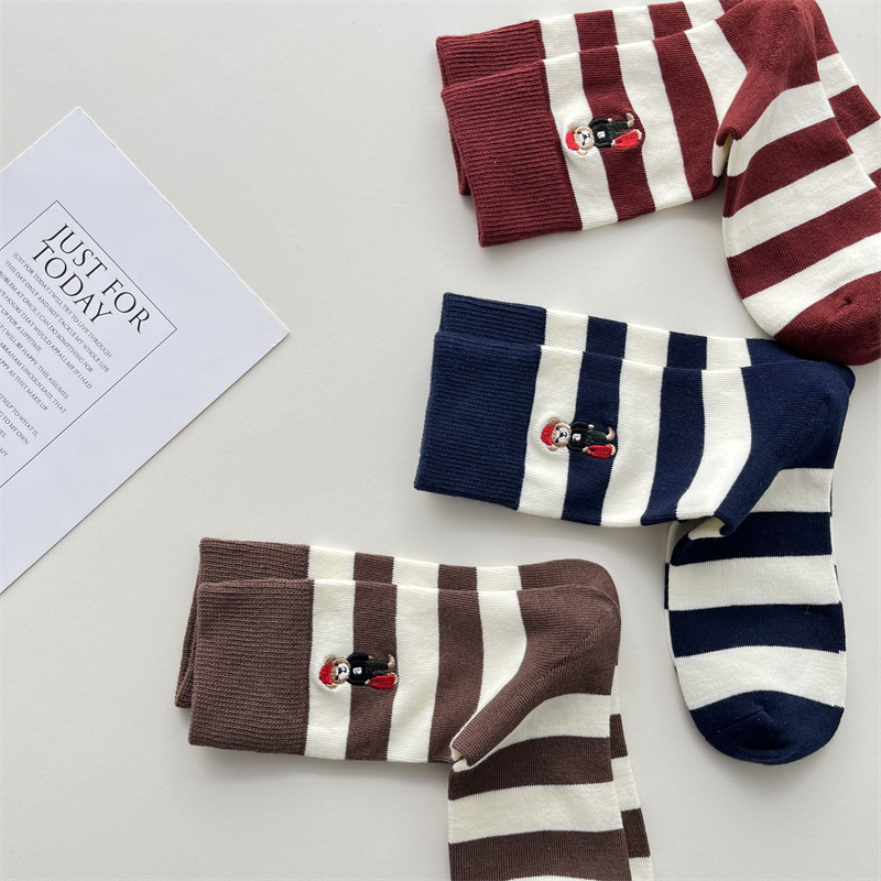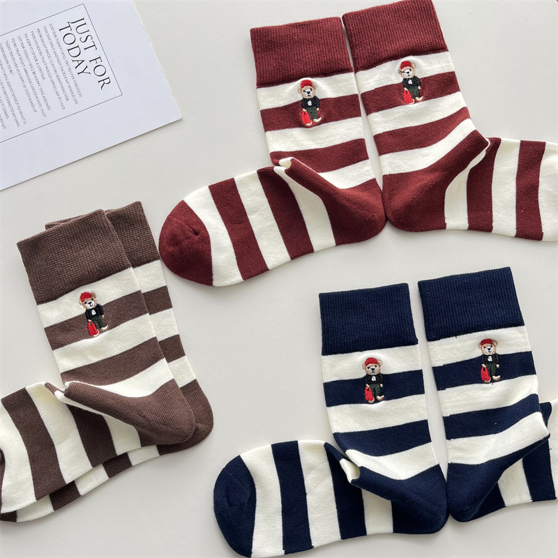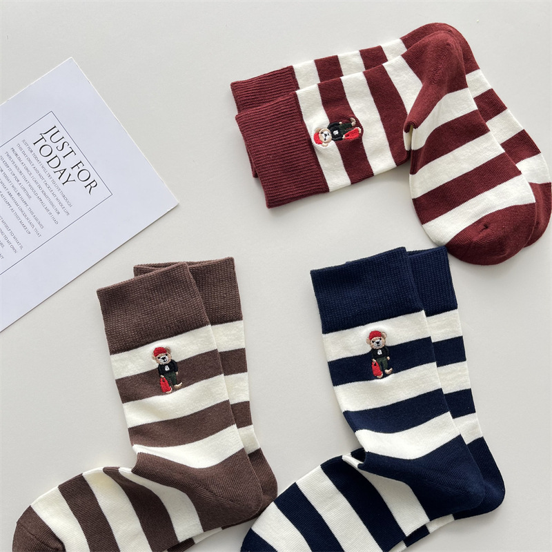 한국 패션 만화 곰 자수 양말 여성 가을 겨울 대비 중간 길이 양말 학술 스타일 색상 일치 면 양말