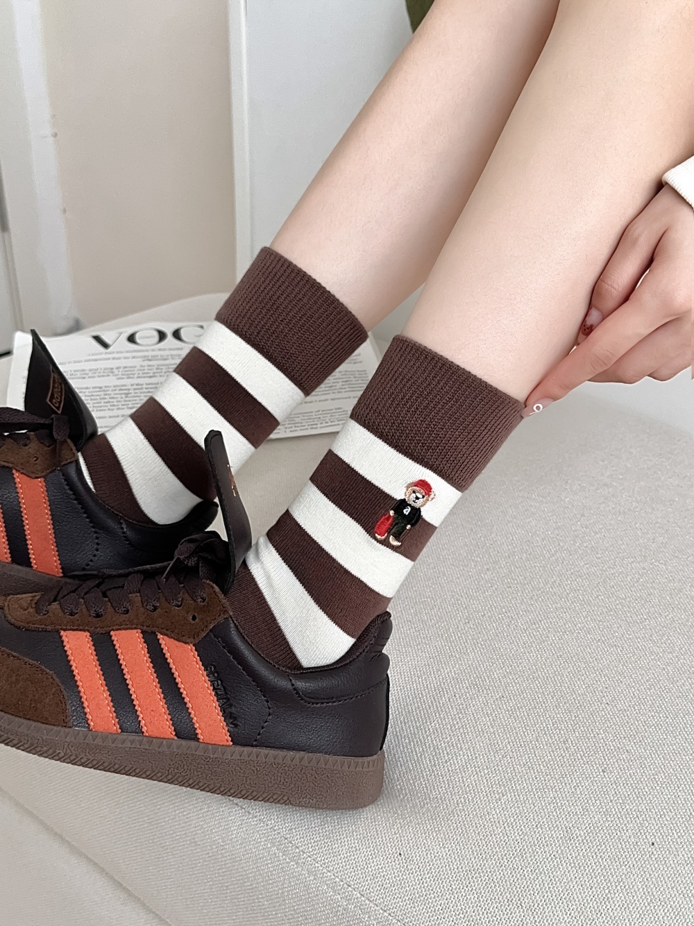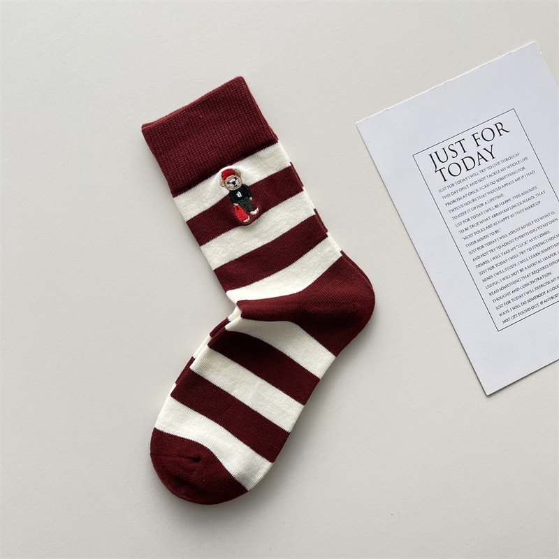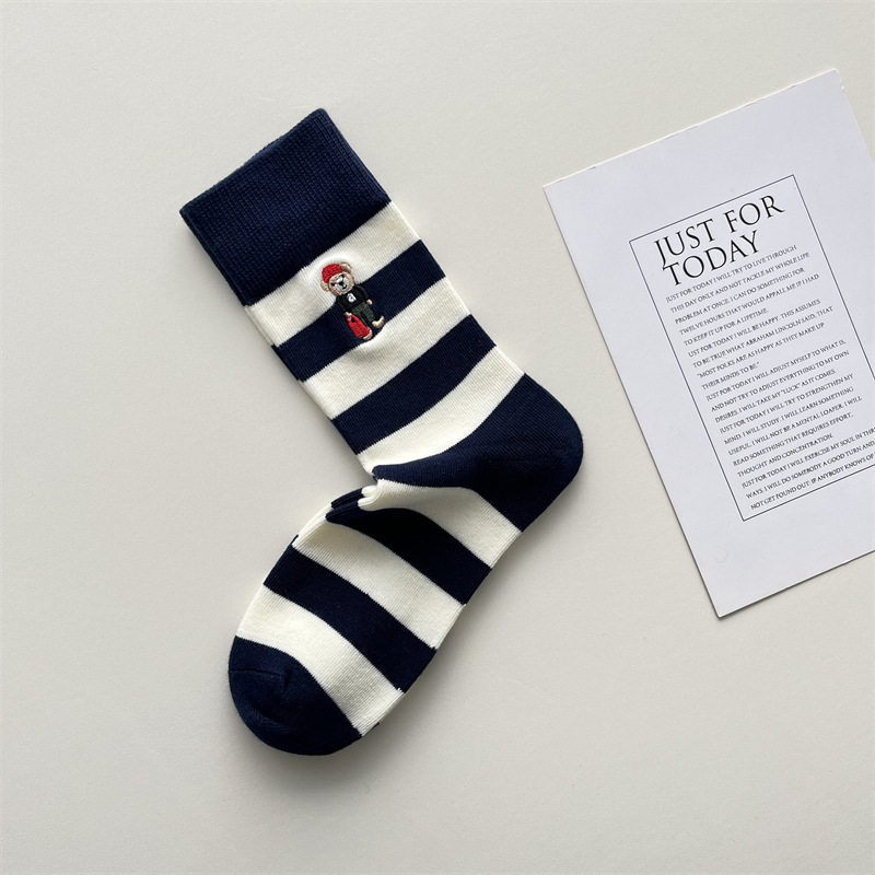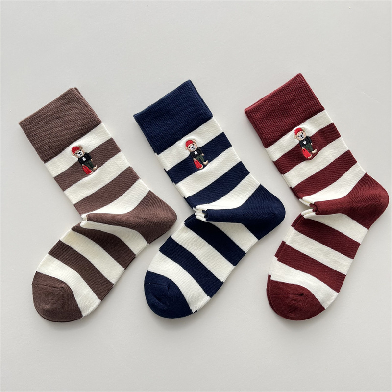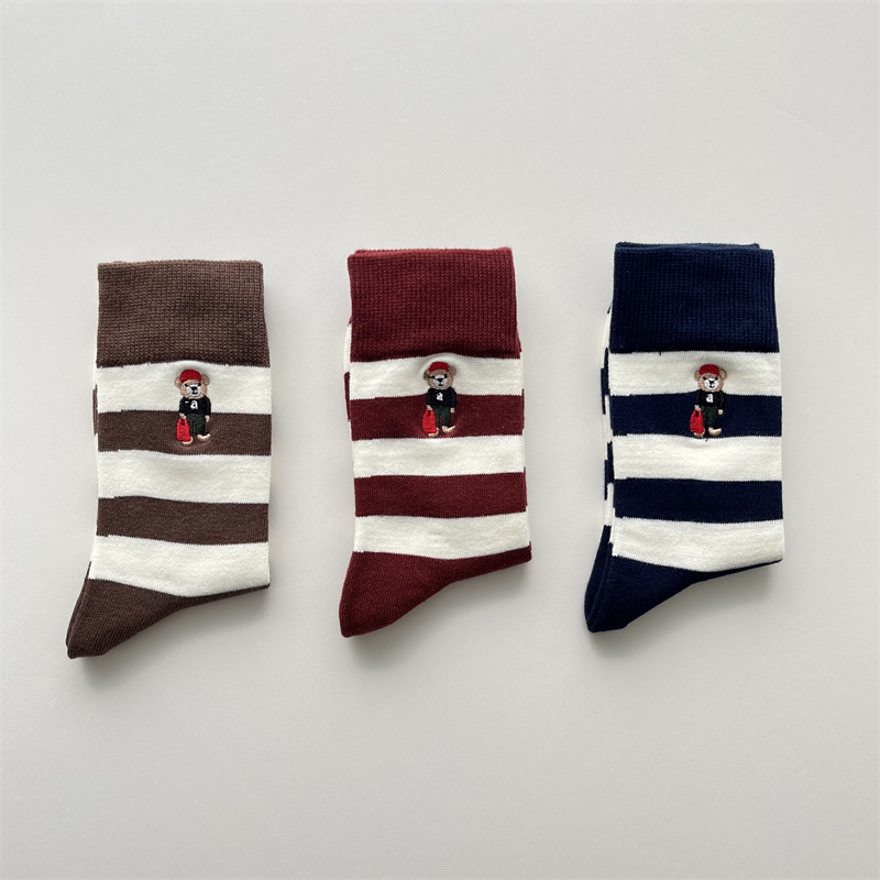 한국 패션 만화 곰 자수 양말 여성 가을 겨울 대비 중간 길이 양말 학술 스타일 색상 일치 면 양말