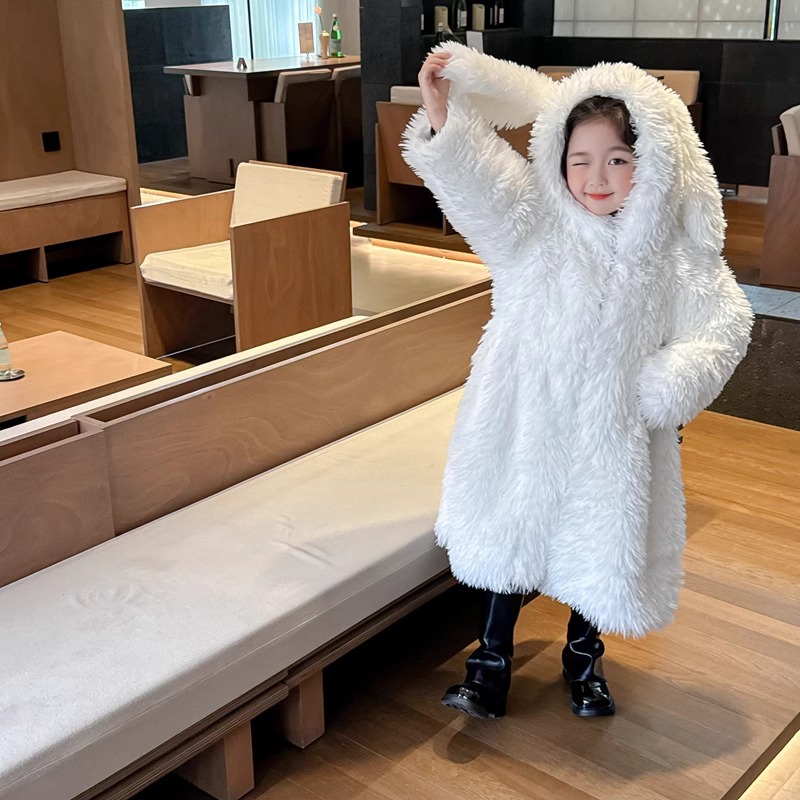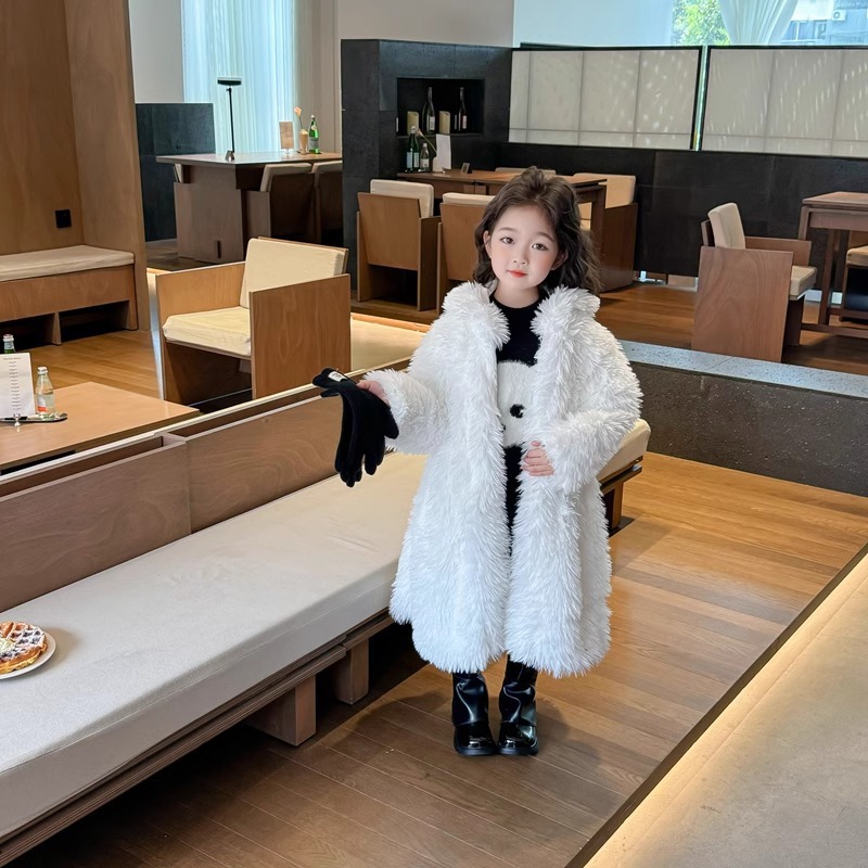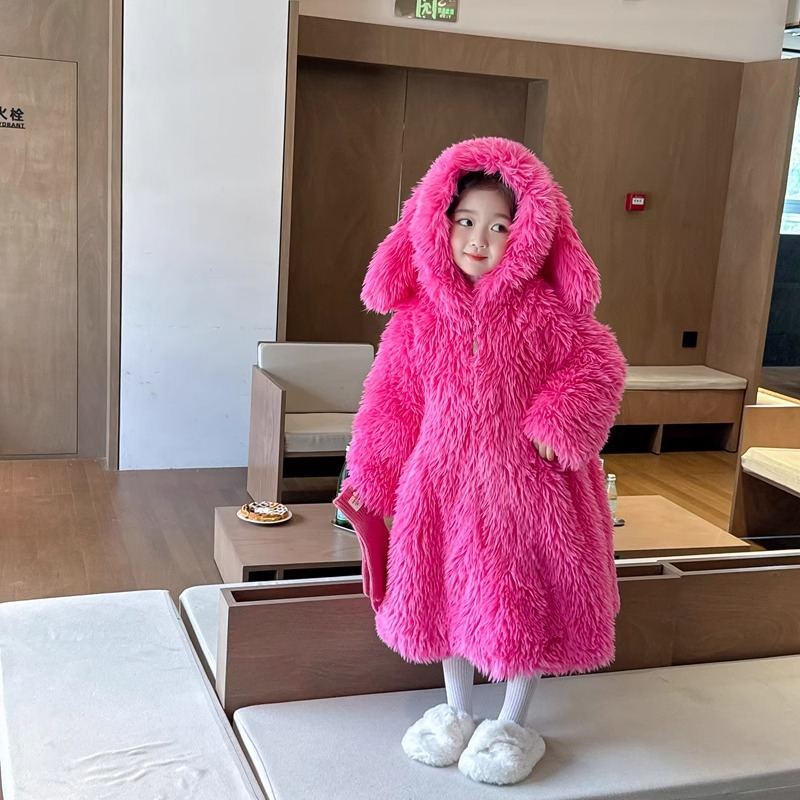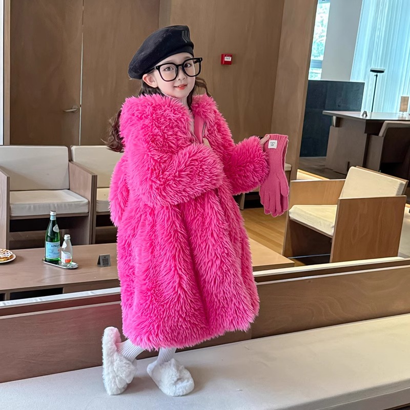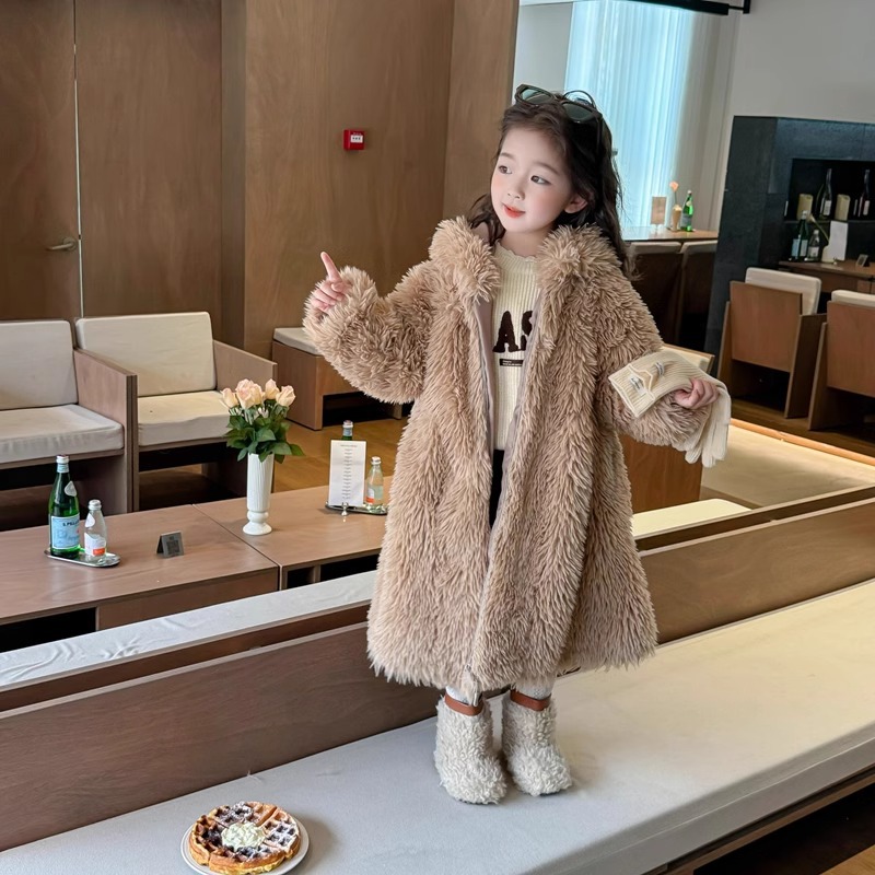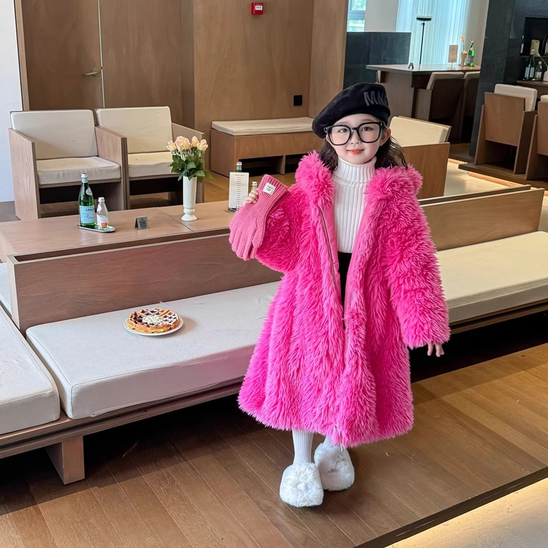 2025 겨울 신상 여아 인조 모피 코트 아동 중간 길이 두꺼운 면 코트 귀여운 털 코트