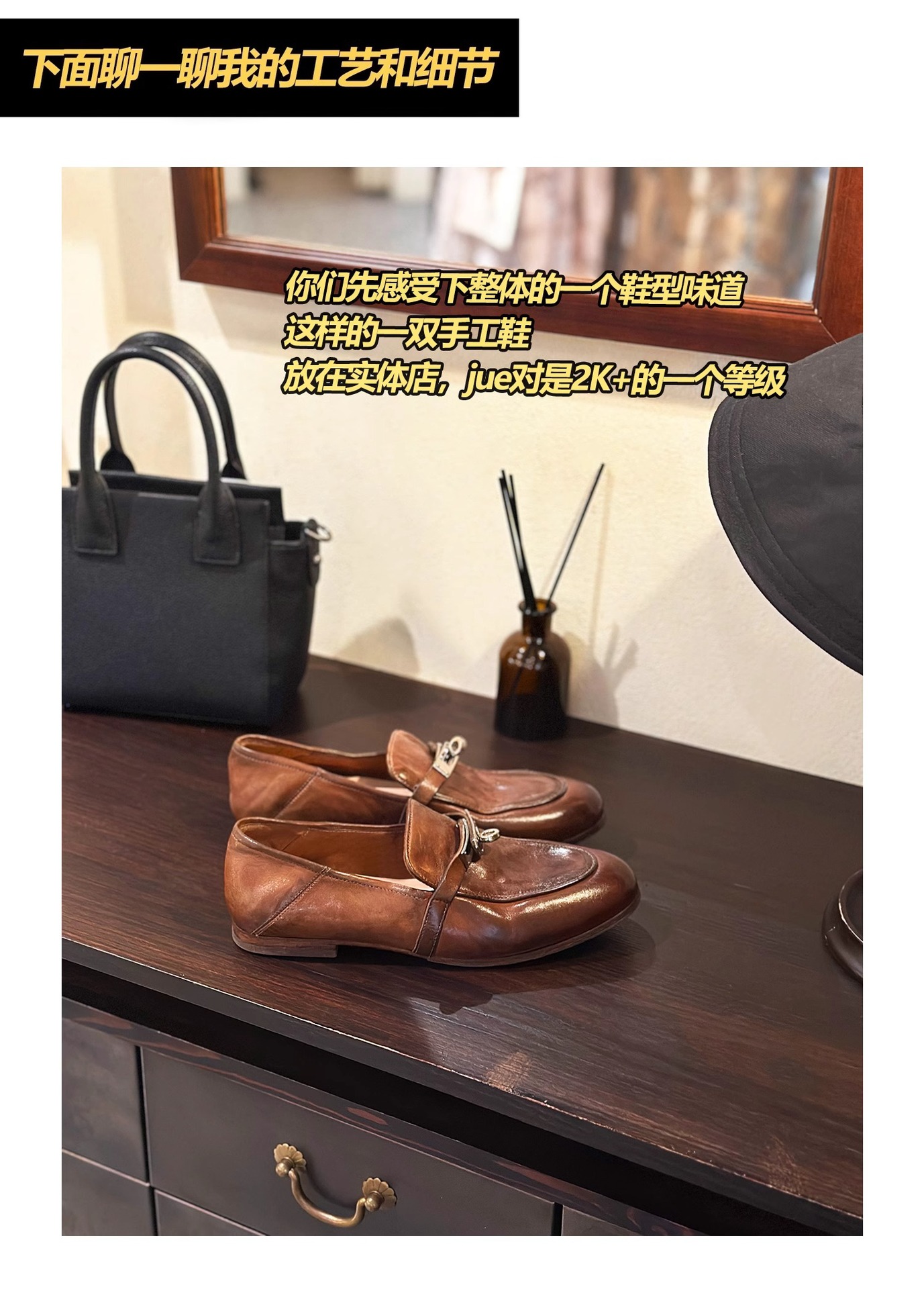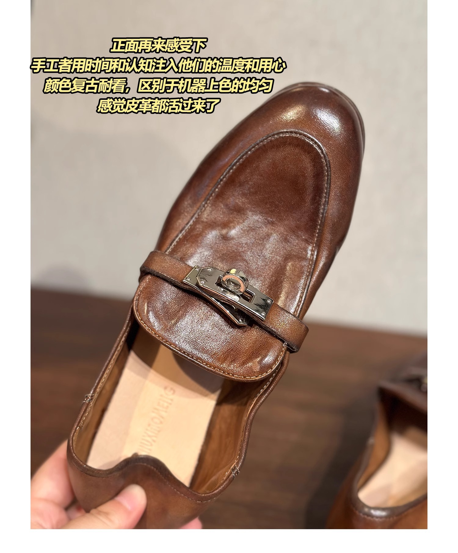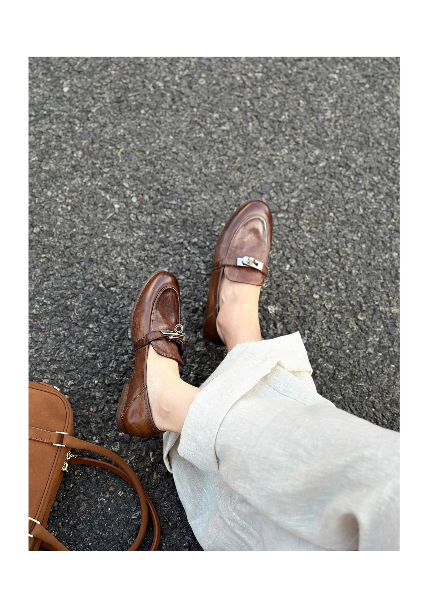 Cowhide 버전 빈티지 세척 말 가죽 수제 로퍼 여성 클래식 버클 작은 가죽 신발 오래 된 낮은 뒤꿈치 정품 가죽 신발스토어 가기