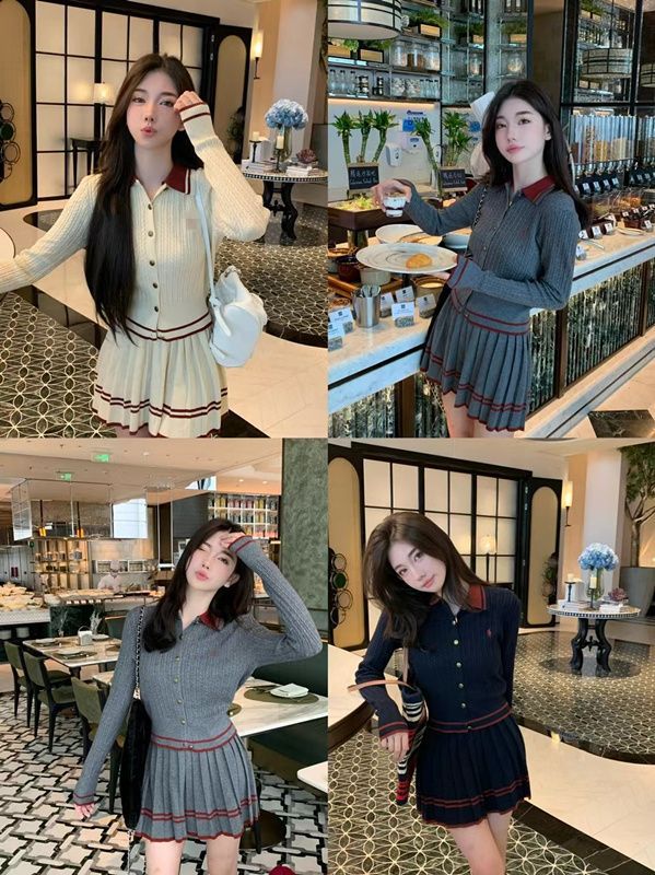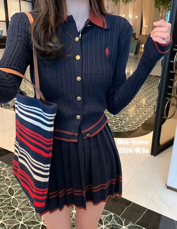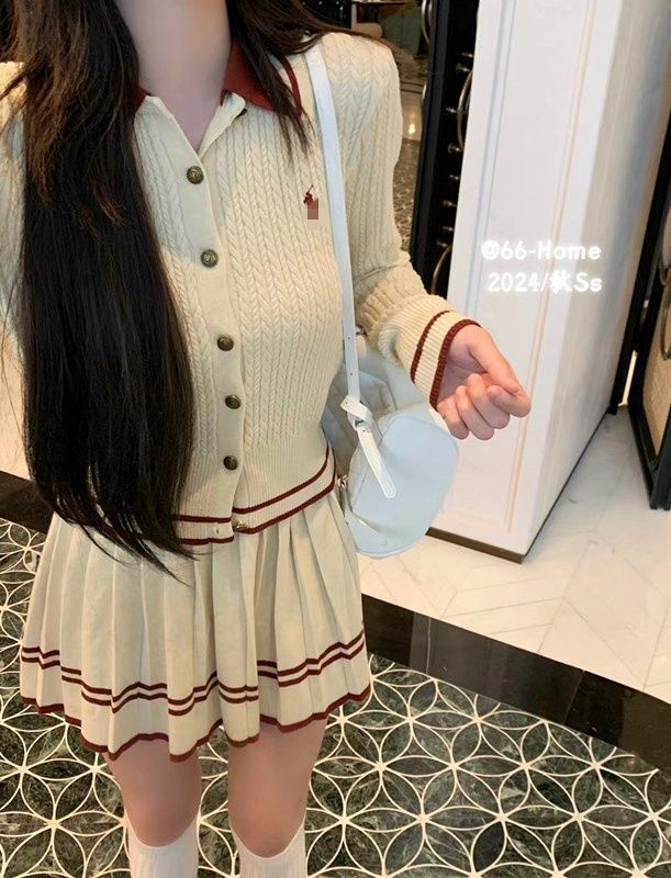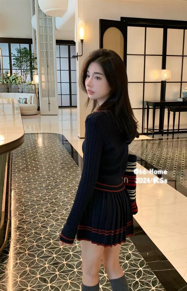 가을 세트 여성의 2024 새로운 폭발 작은 착용 슬림 핏 아카데미 스타일 니트 주름 치마 투피스 세트 DD스토어 가기
