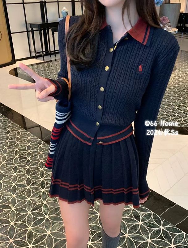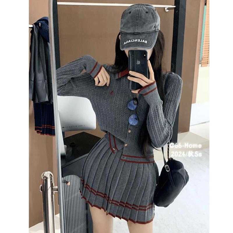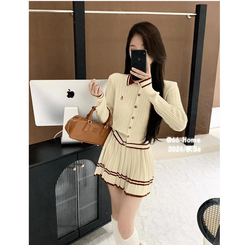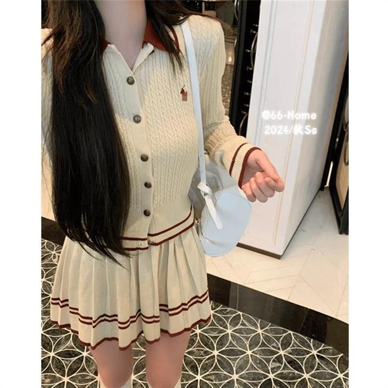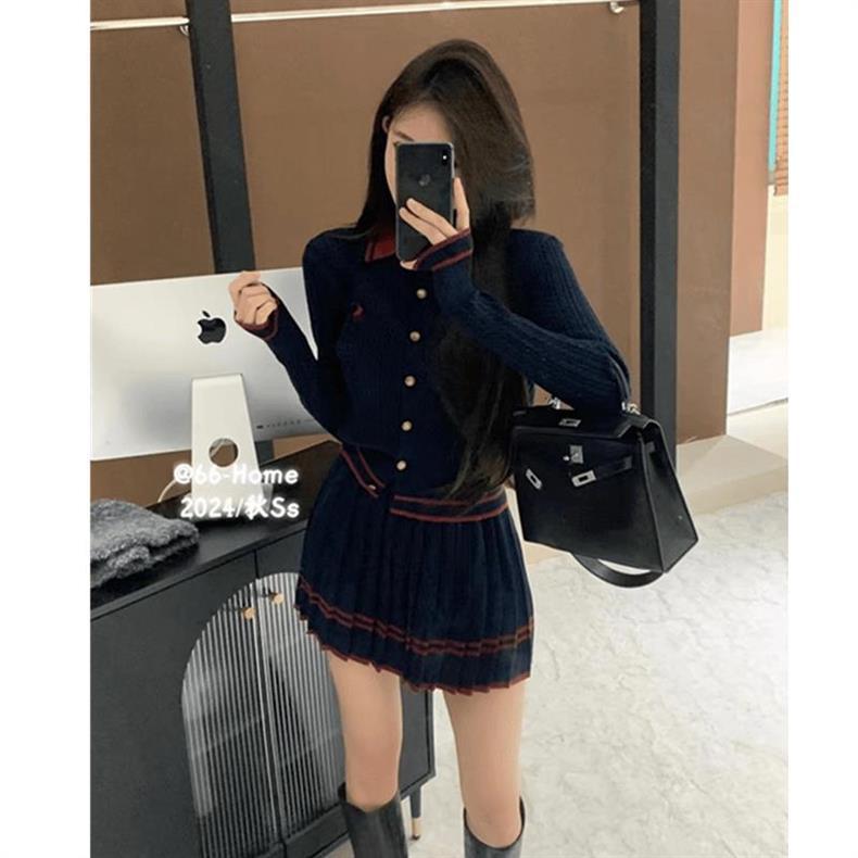 가을 세트 여성의 2024 새로운 폭발 작은 착용 슬림 핏 아카데미 스타일 니트 주름 치마 투피스 세트 DD