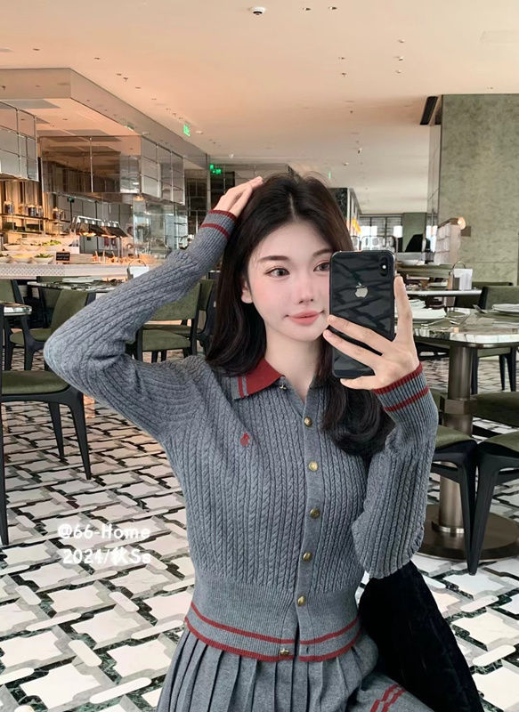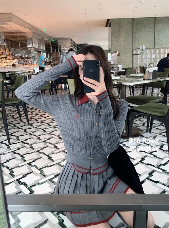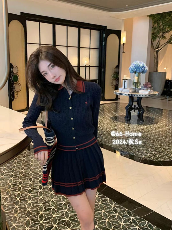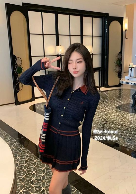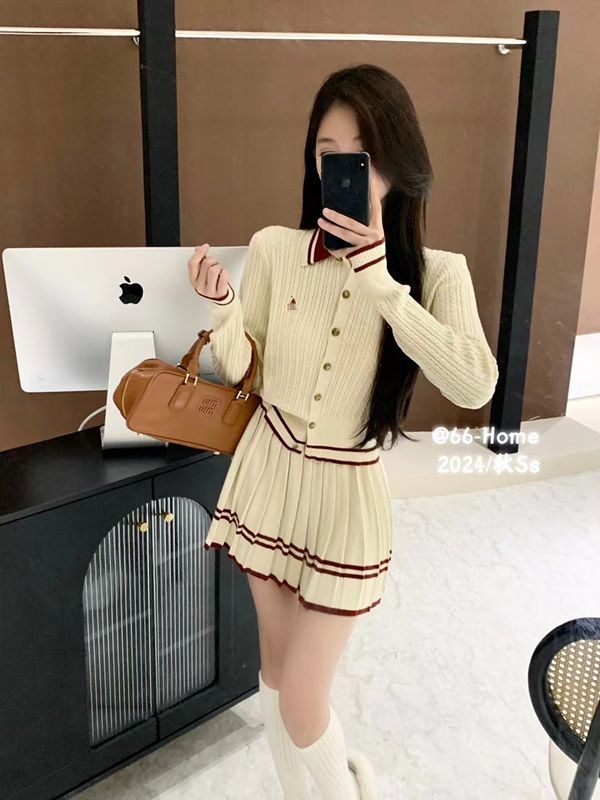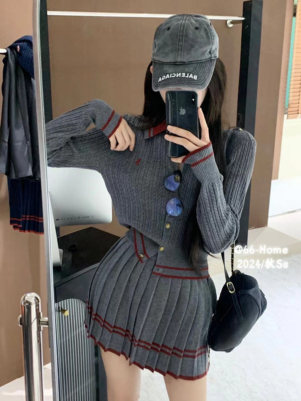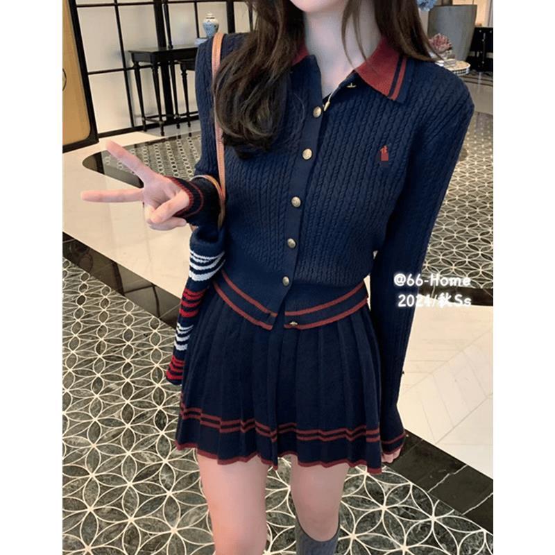 가을 세트 여성의 2024 새로운 폭발 작은 착용 슬림 핏 아카데미 스타일 니트 주름 치마 투피스 세트 DD