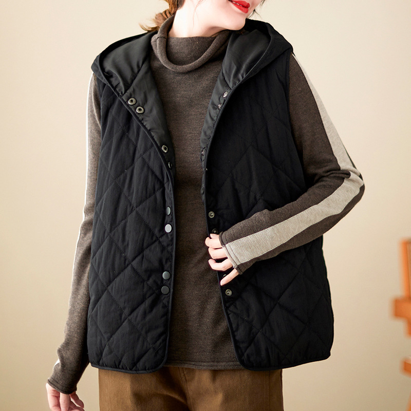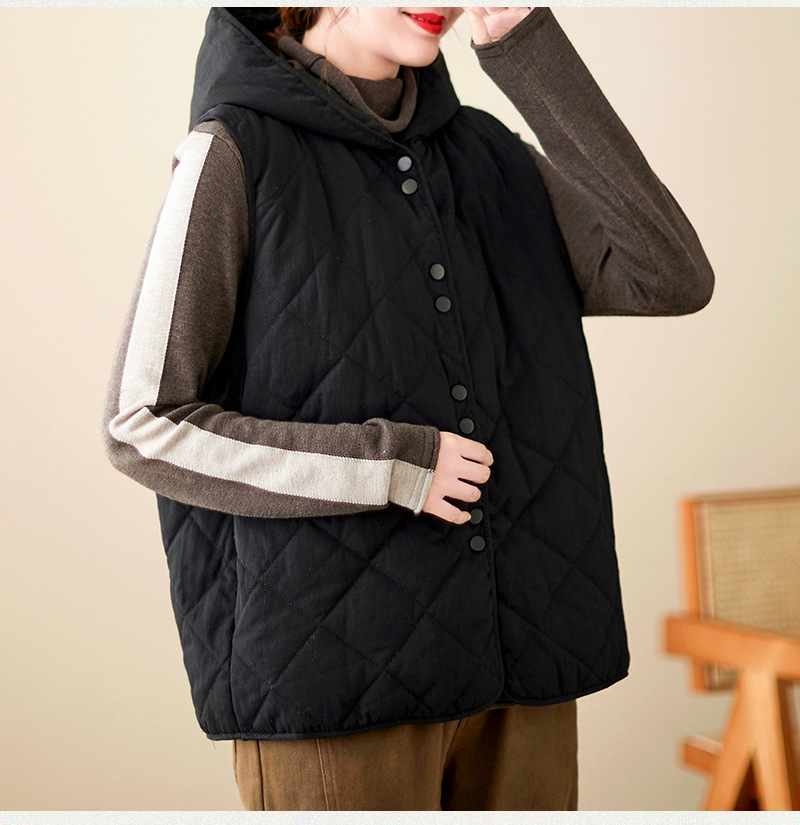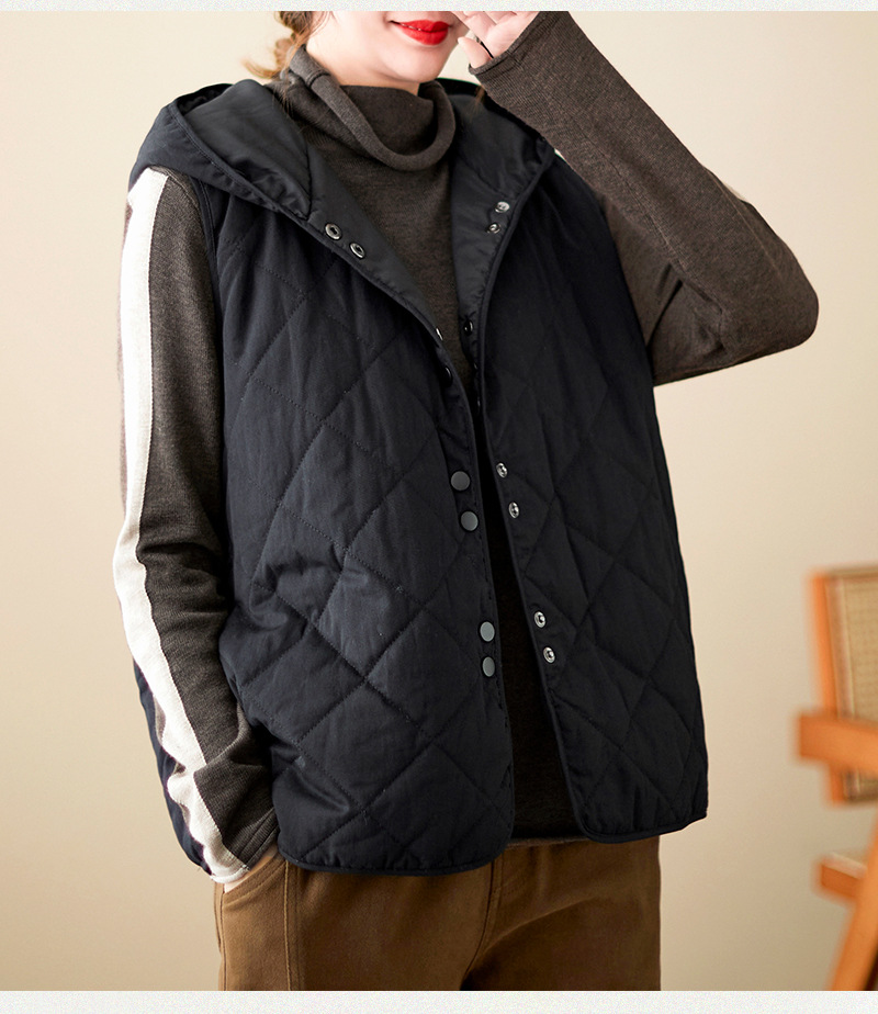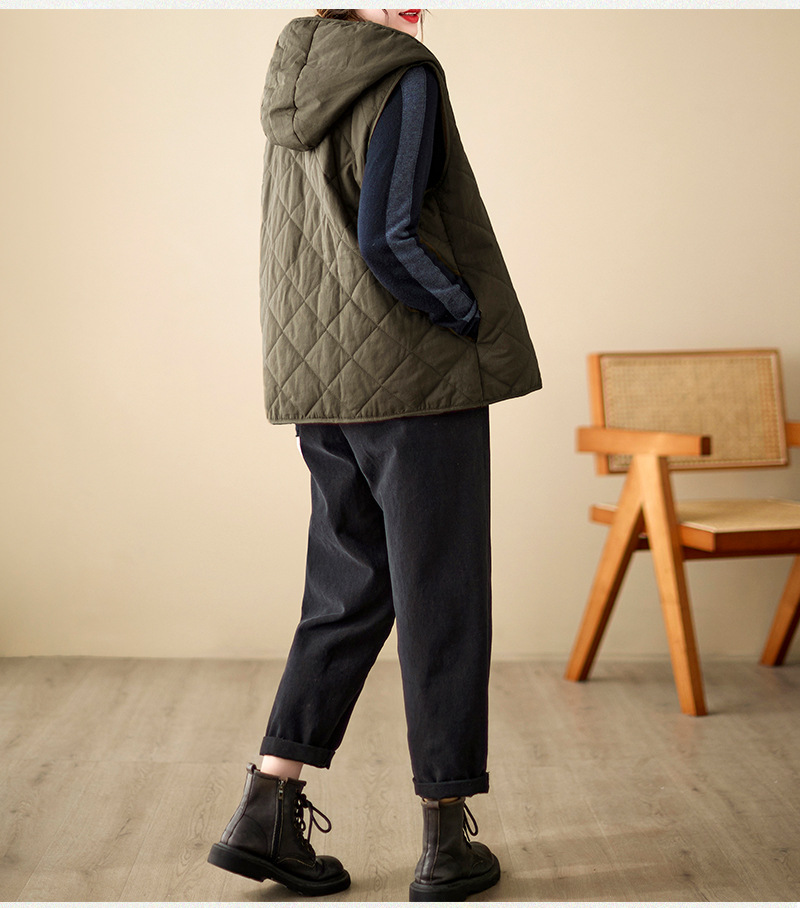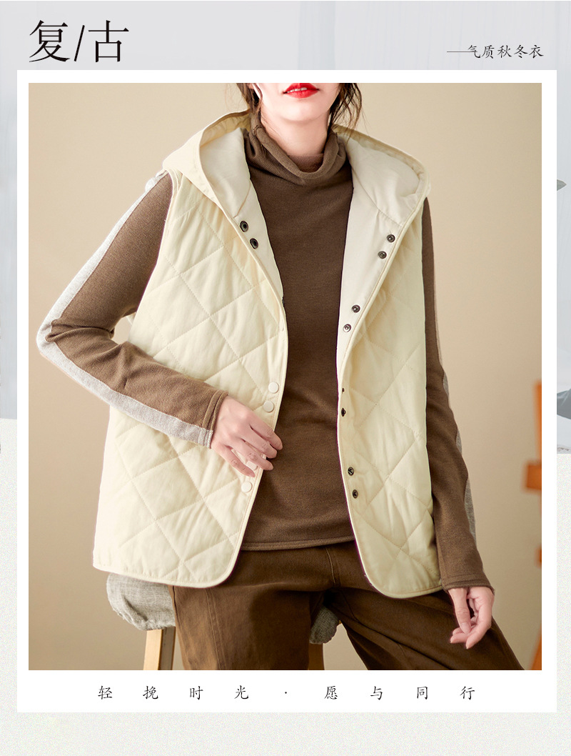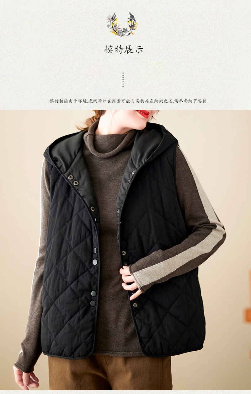 리얼 샷 2024 겨울 새 아티스트 스타일 후드 조끼 여성용 루즈 슬림 핏 다이아몬드 모양의 체크 무늬 조끼 재킷 탑