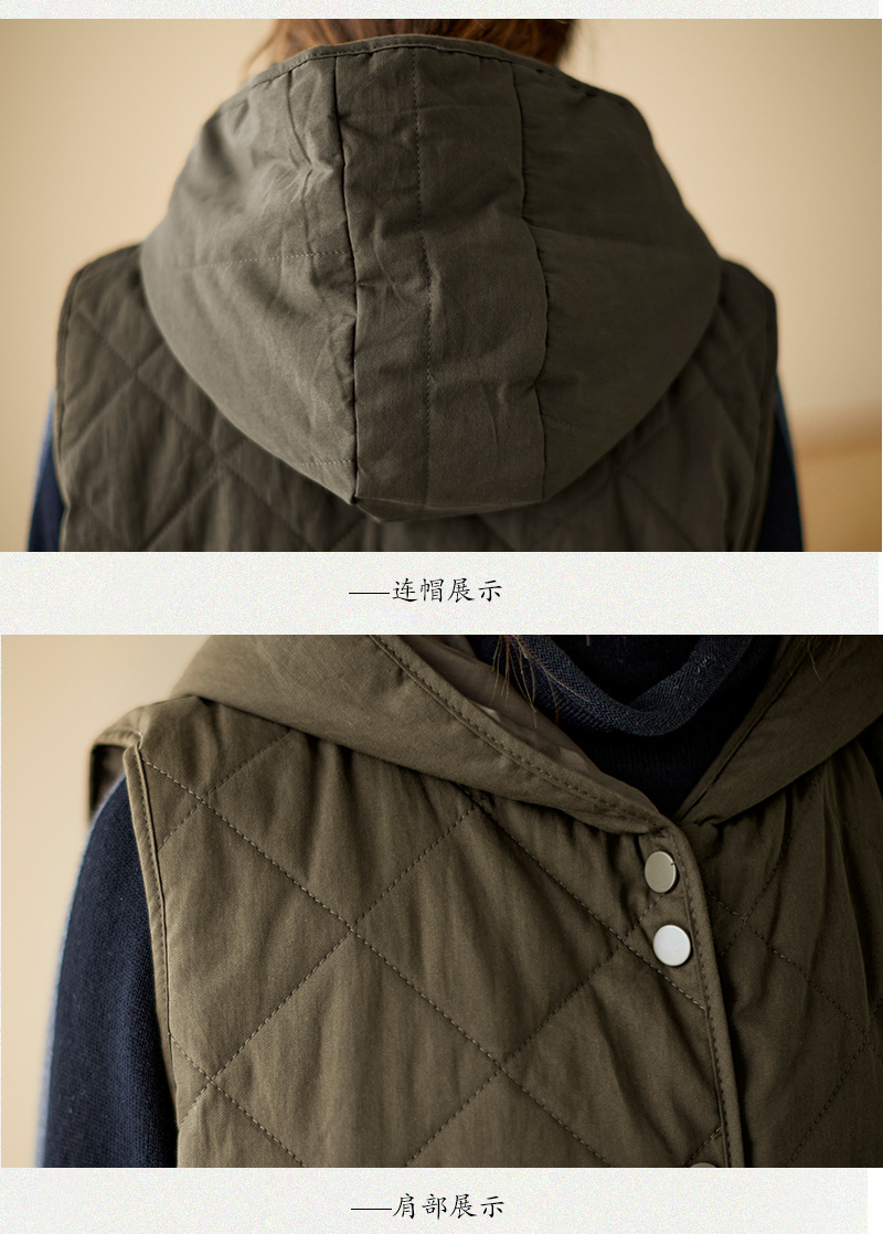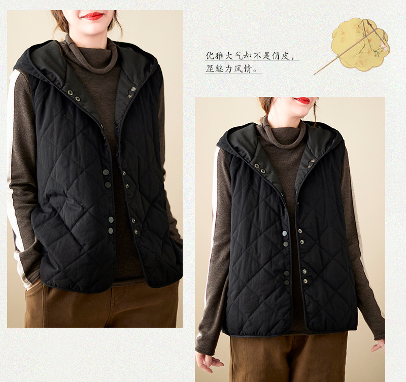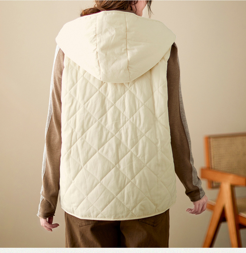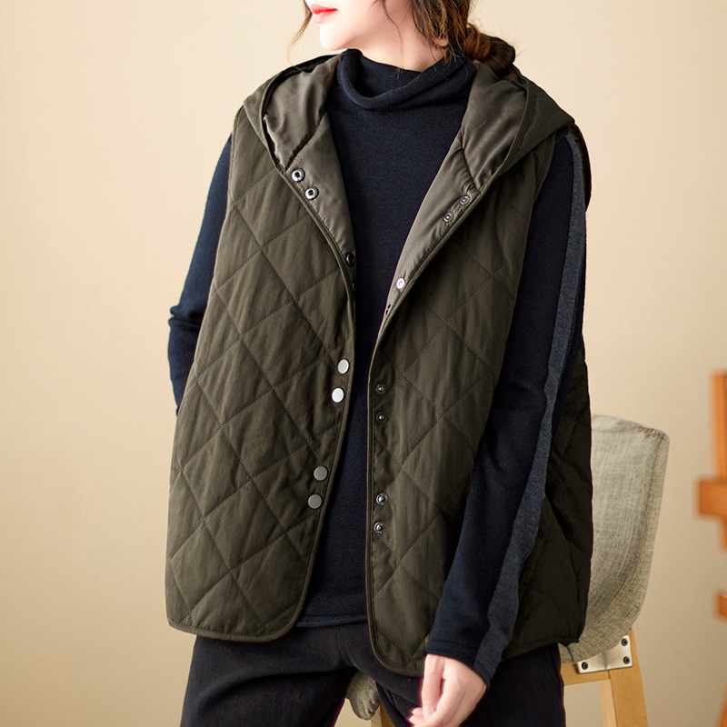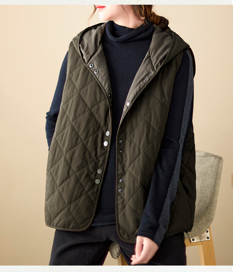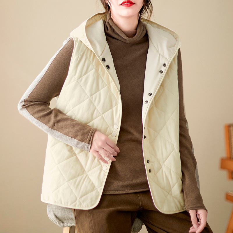 리얼 샷 2024 겨울 새 아티스트 스타일 후드 조끼 여성용 루즈 슬림 핏 다이아몬드 모양의 체크 무늬 조끼 재킷 탑