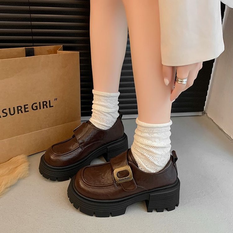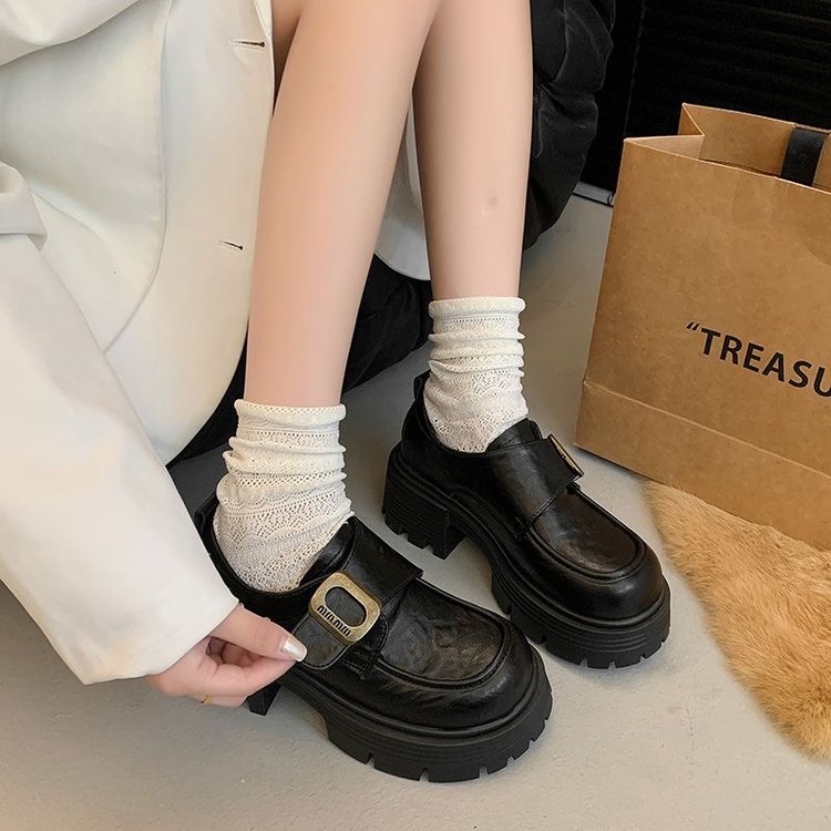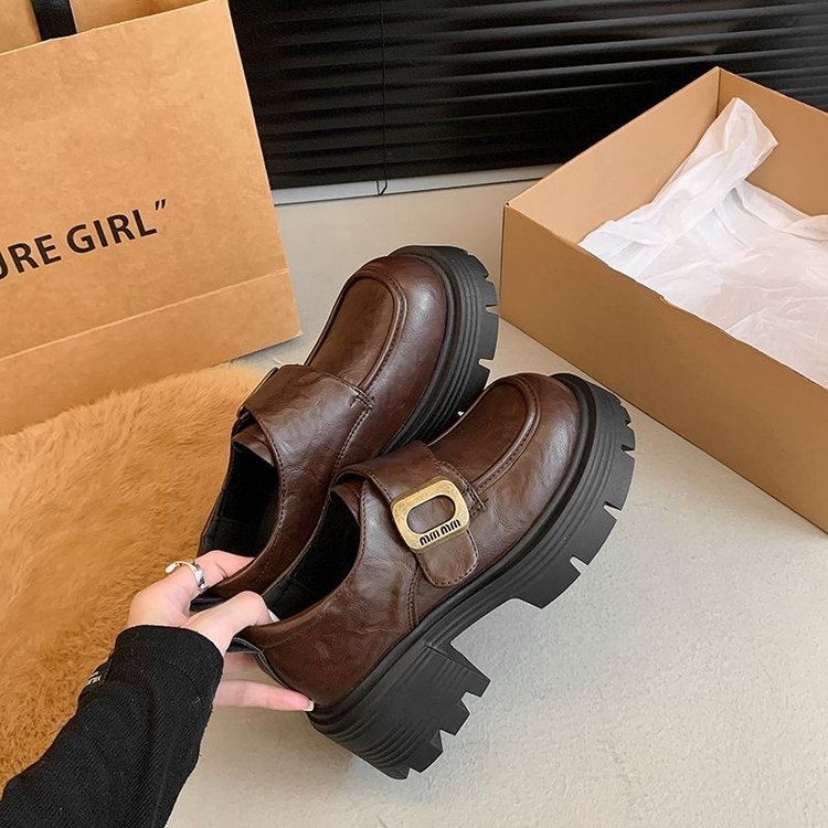 두꺼운 밑창 두꺼운 힐 후크와 루프 싱글 레이어 신발 여성의 2024 가을 새로운 패션 올 매치 영국 스타일의 작은 가죽 신발 로퍼 증가스토어 가기