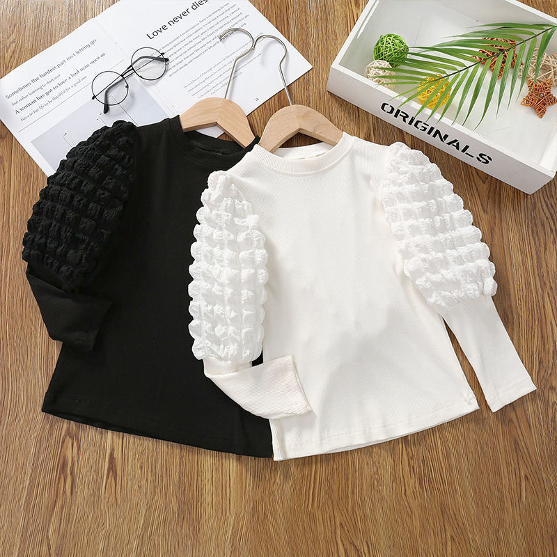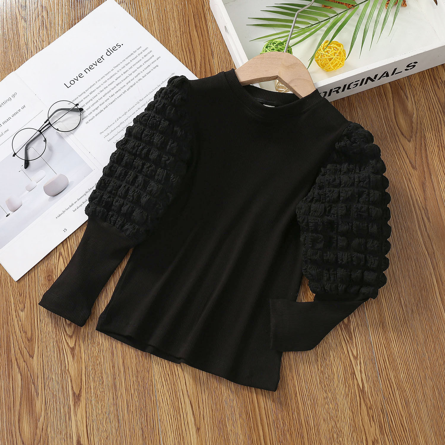 소녀 버블 슬리브 바닥 셔츠 가을 새 여자 크루 넥 티셔츠 어린이 패션 아동복 헤어 세대