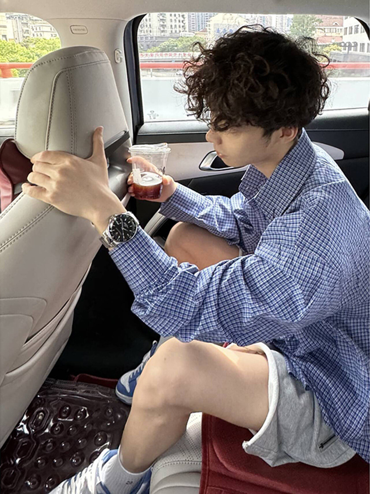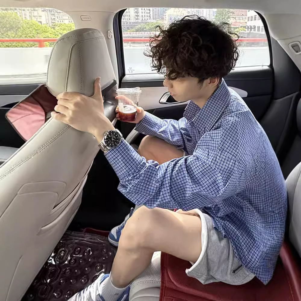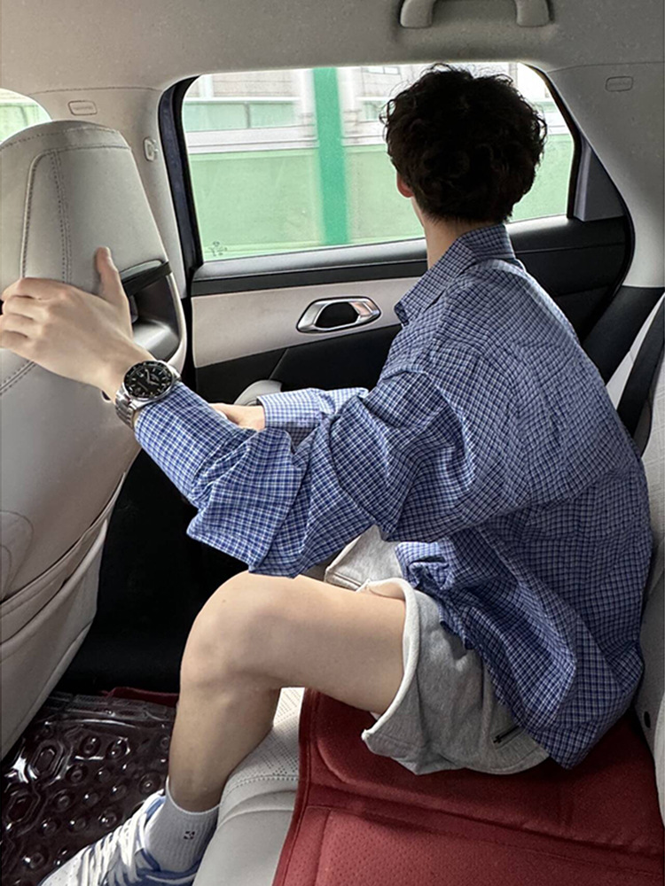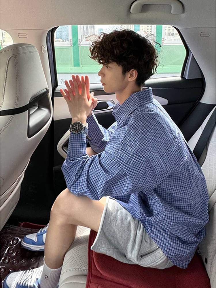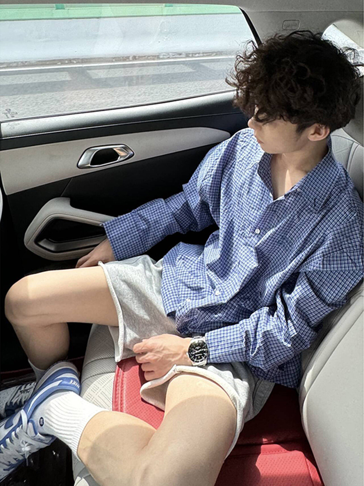 2024 미국 레트로 블루 격자 무늬 셔츠 봄과 가을 청결한 디자인 면 긴 소매 셔츠 남성용 재킷스토어 가기