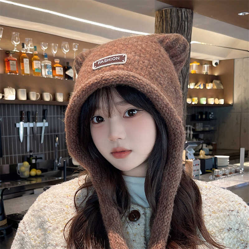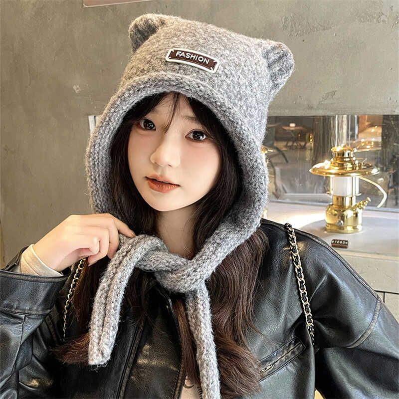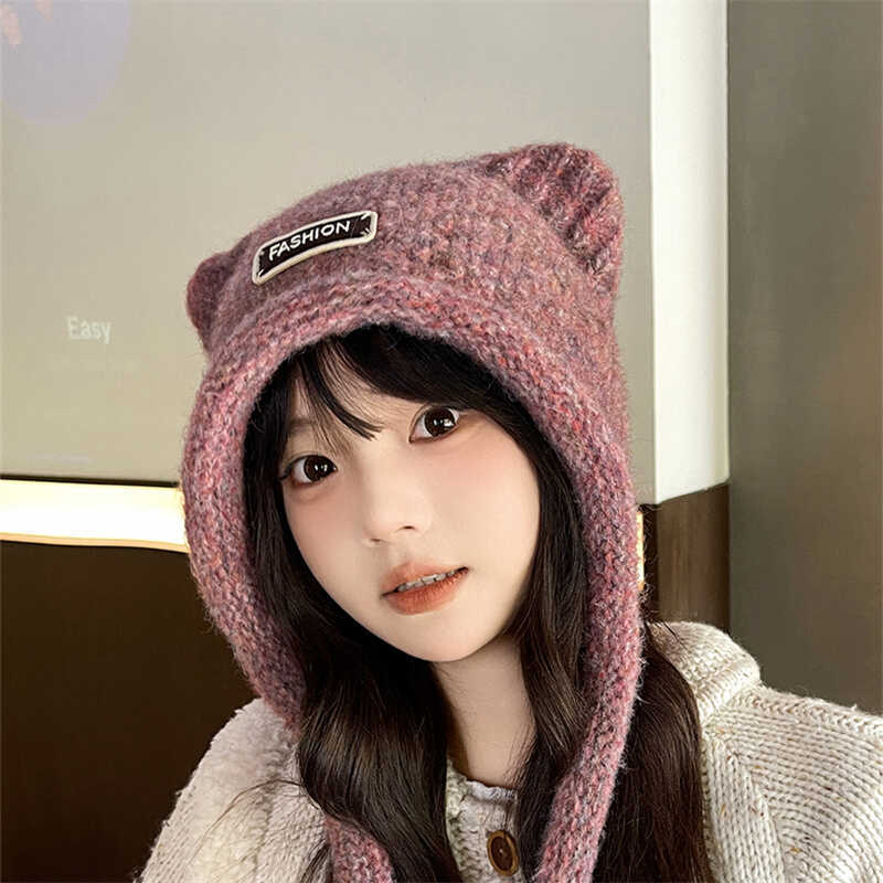 양모 모자 여성의 달콤한 귀여운 고양이 귀 머리띠 차가운 모자 가을과 겨울 따뜻한 두꺼운 귀 보호 캡 2024 새로운