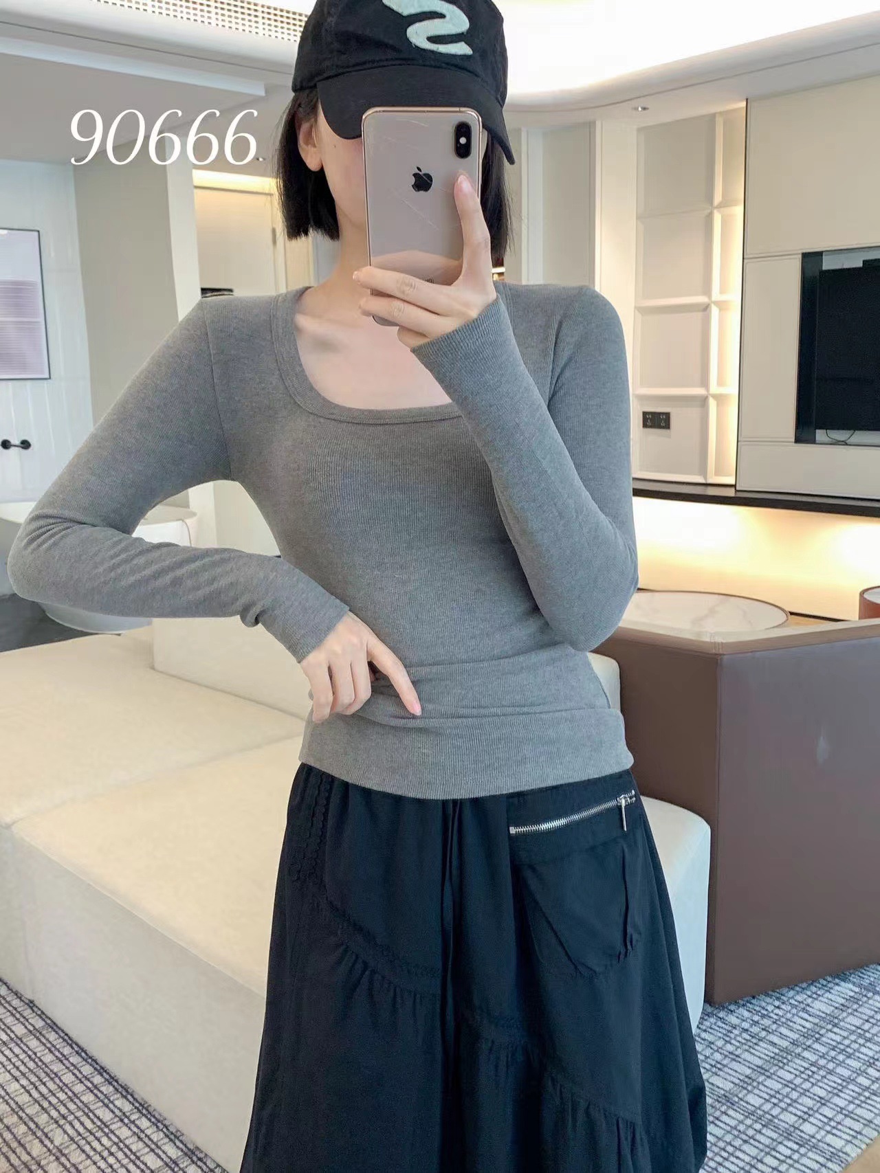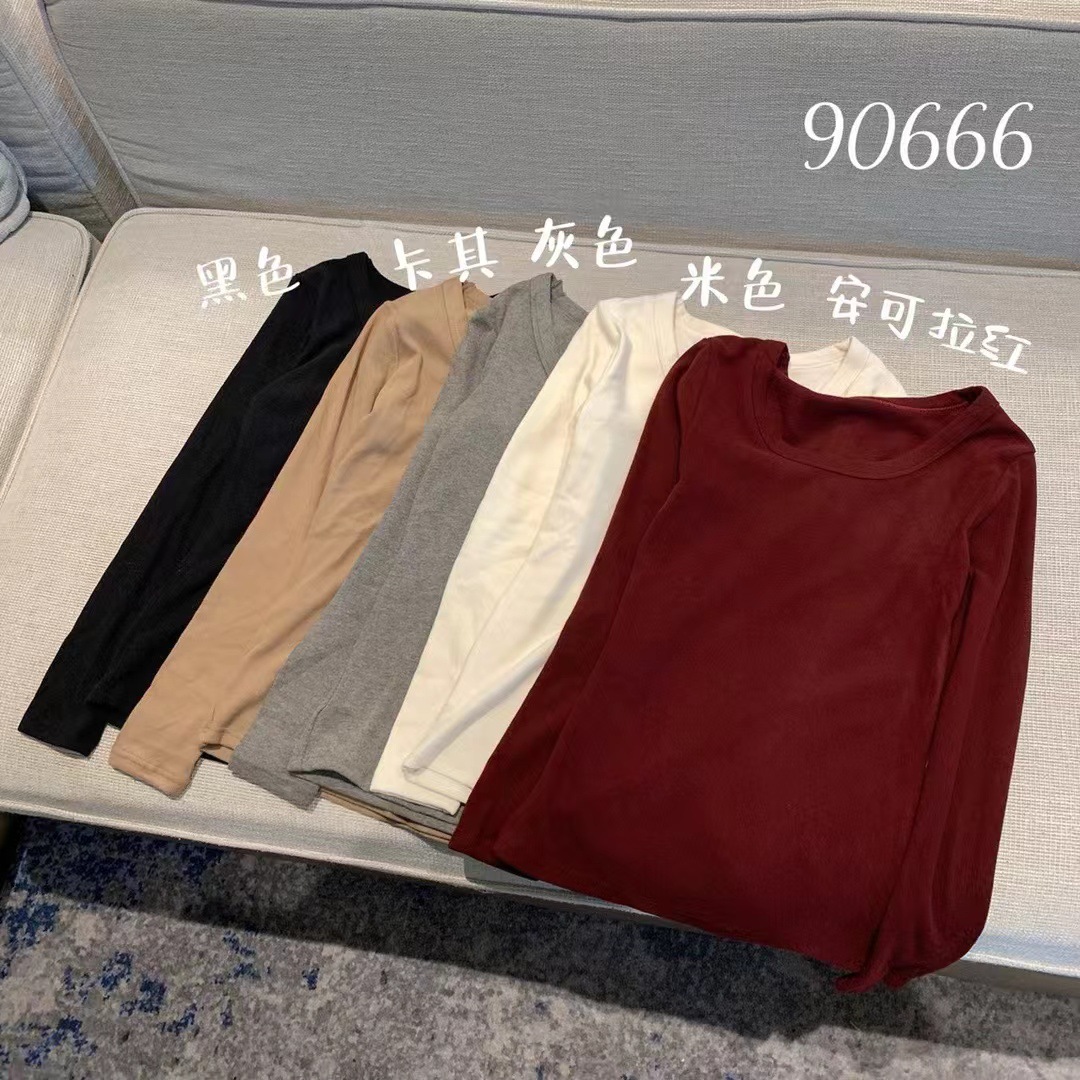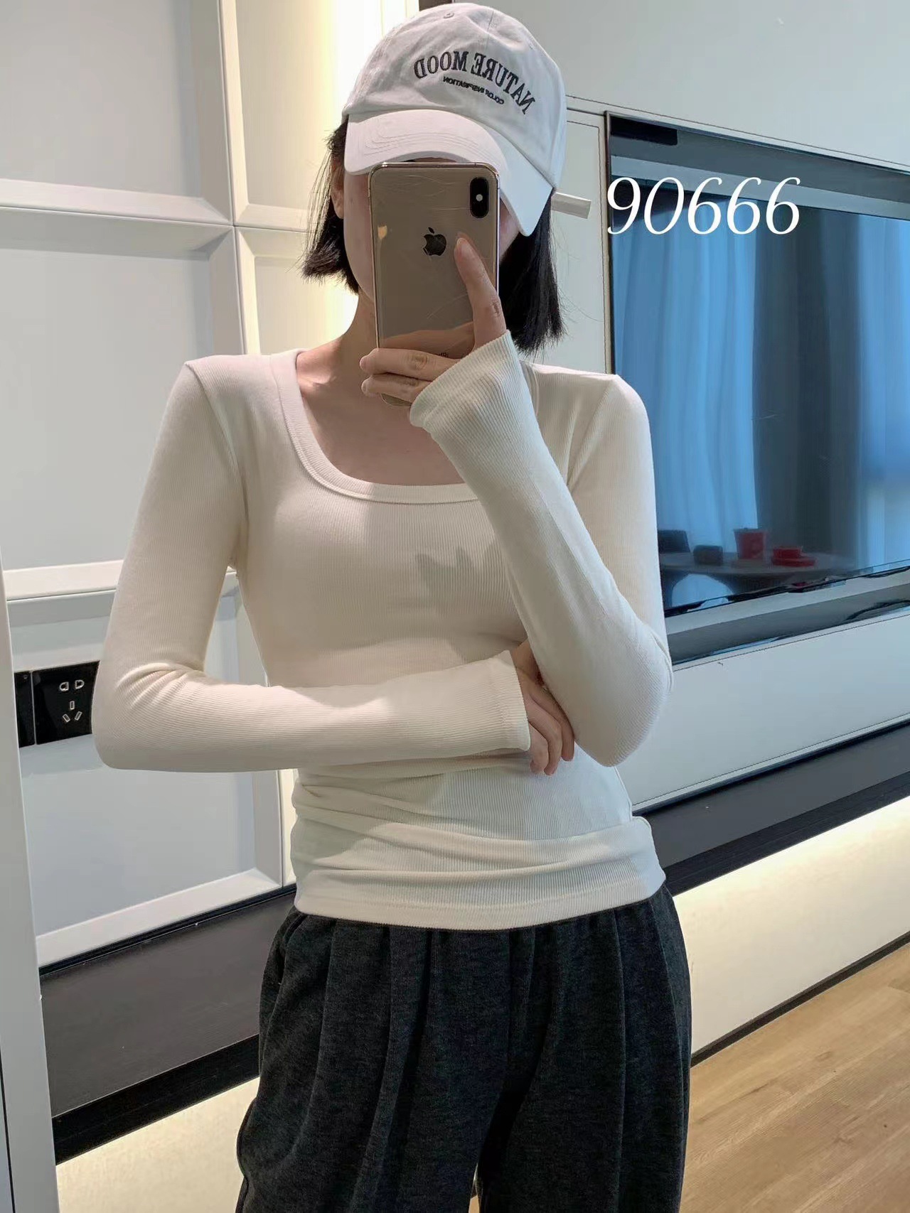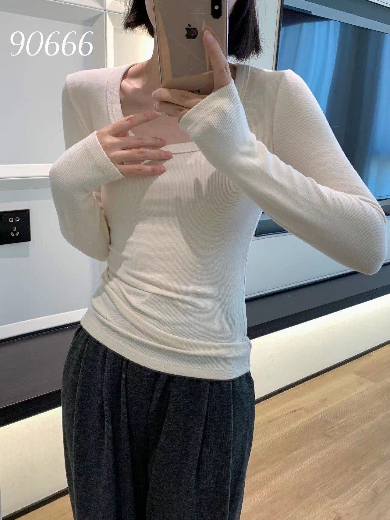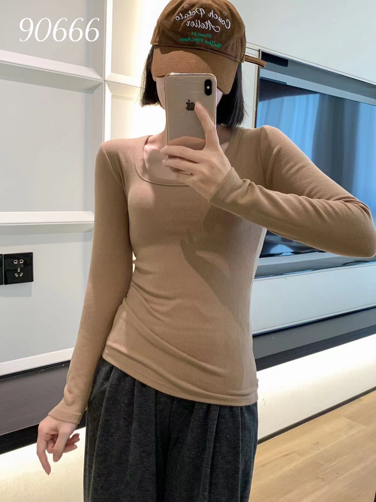 90666 스퀘어 칼라 얇은 벨벳 스레드베이스 셔츠 여성용 가을과 겨울 긴팔 티셔츠 내부 착용 긴팔 탑