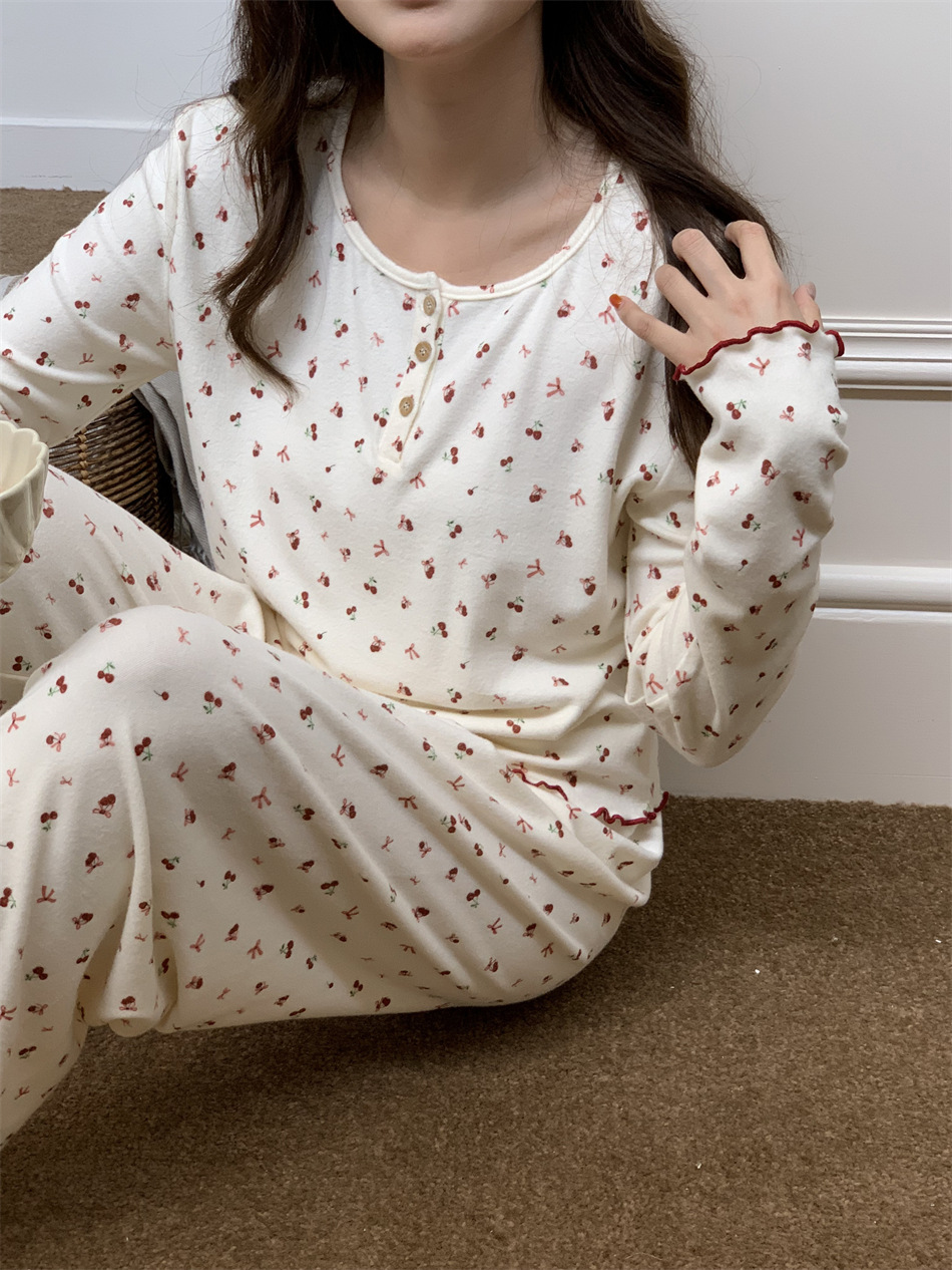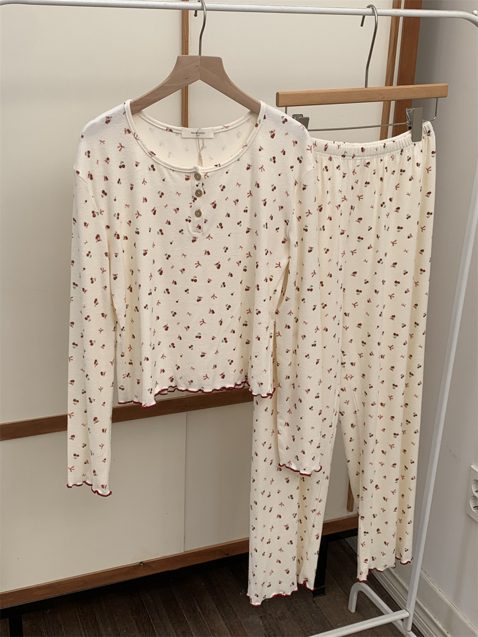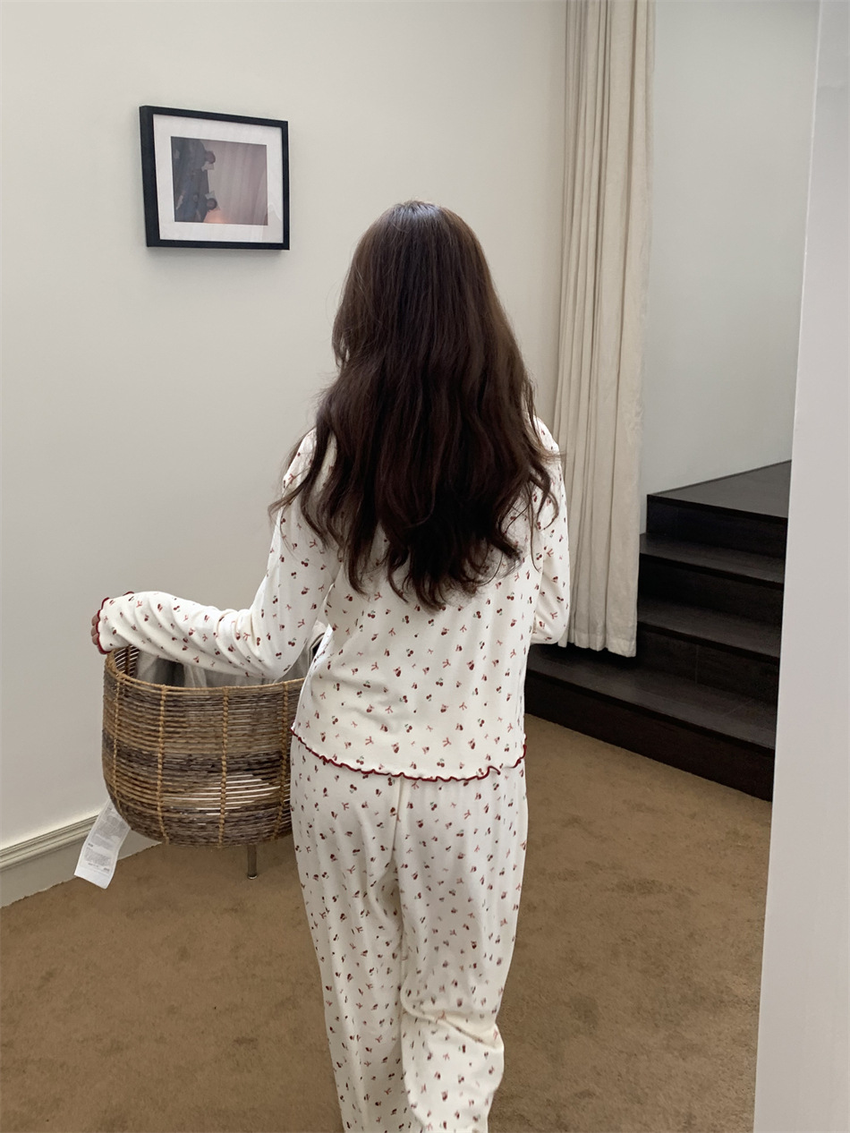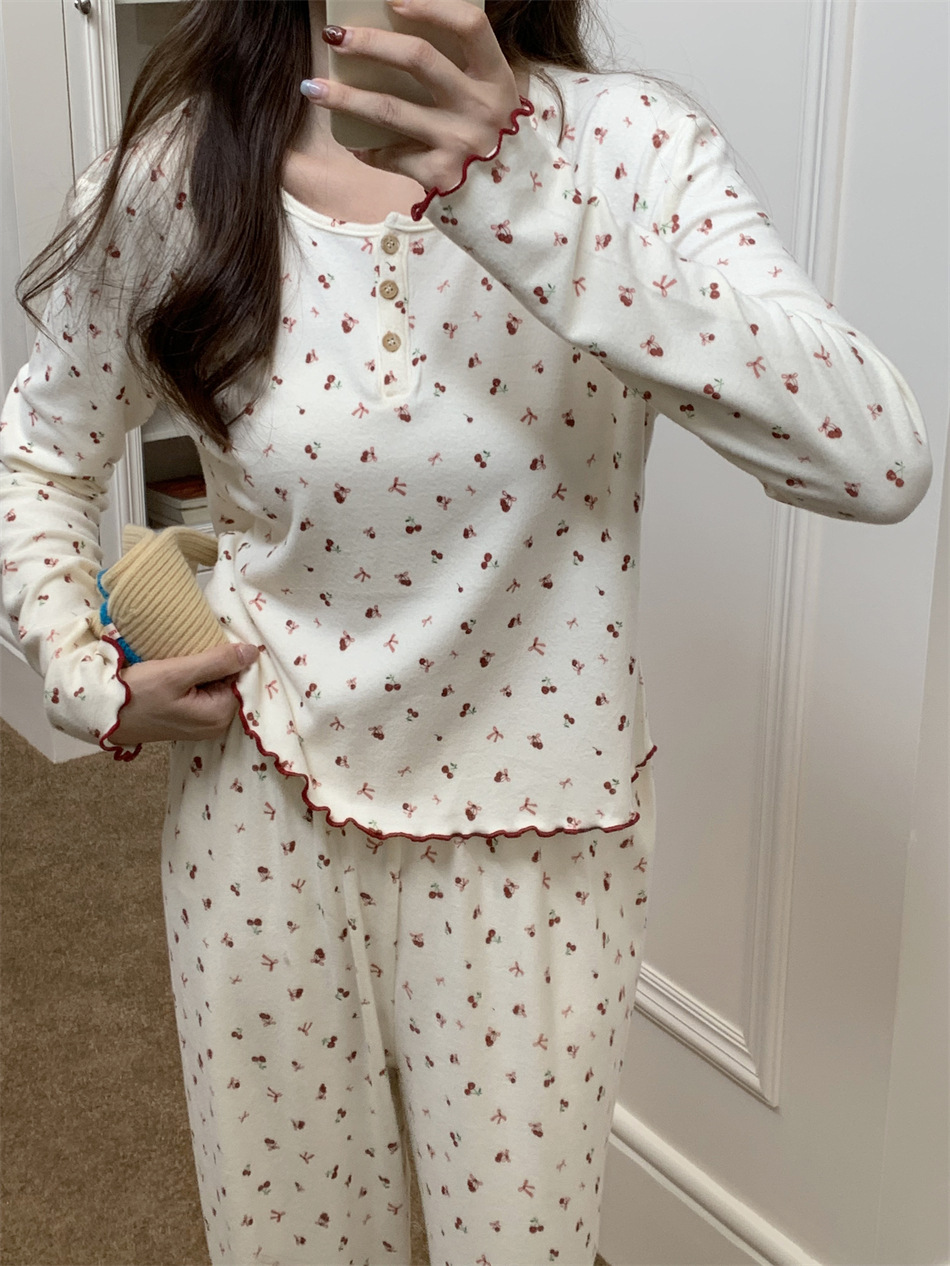여성용 샌딩을위한 국경 간 스페셜 두꺼운 니트 우드 이어 엣지 체리 활 크루 넥 풀오버 홈 의류 파자마 세트