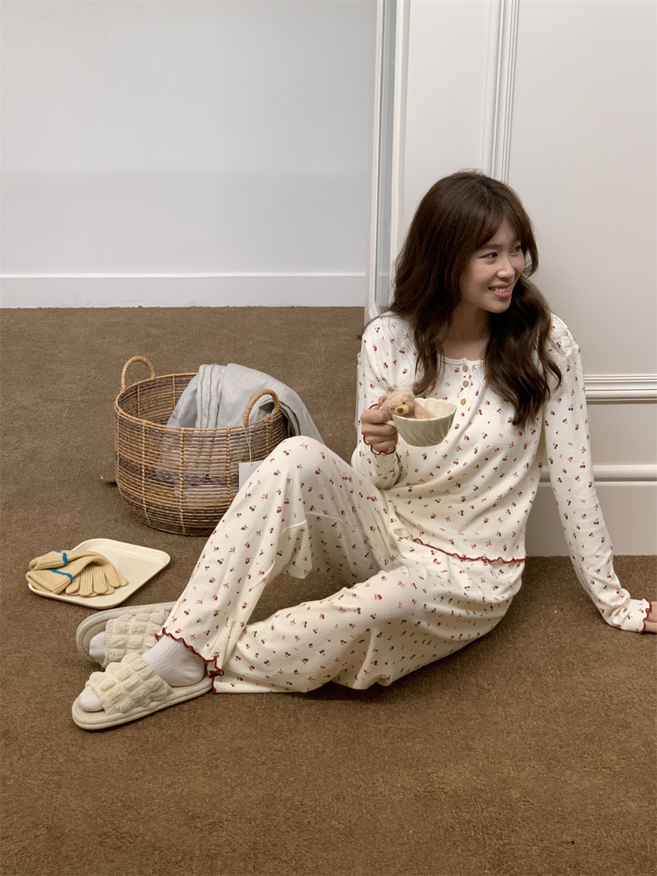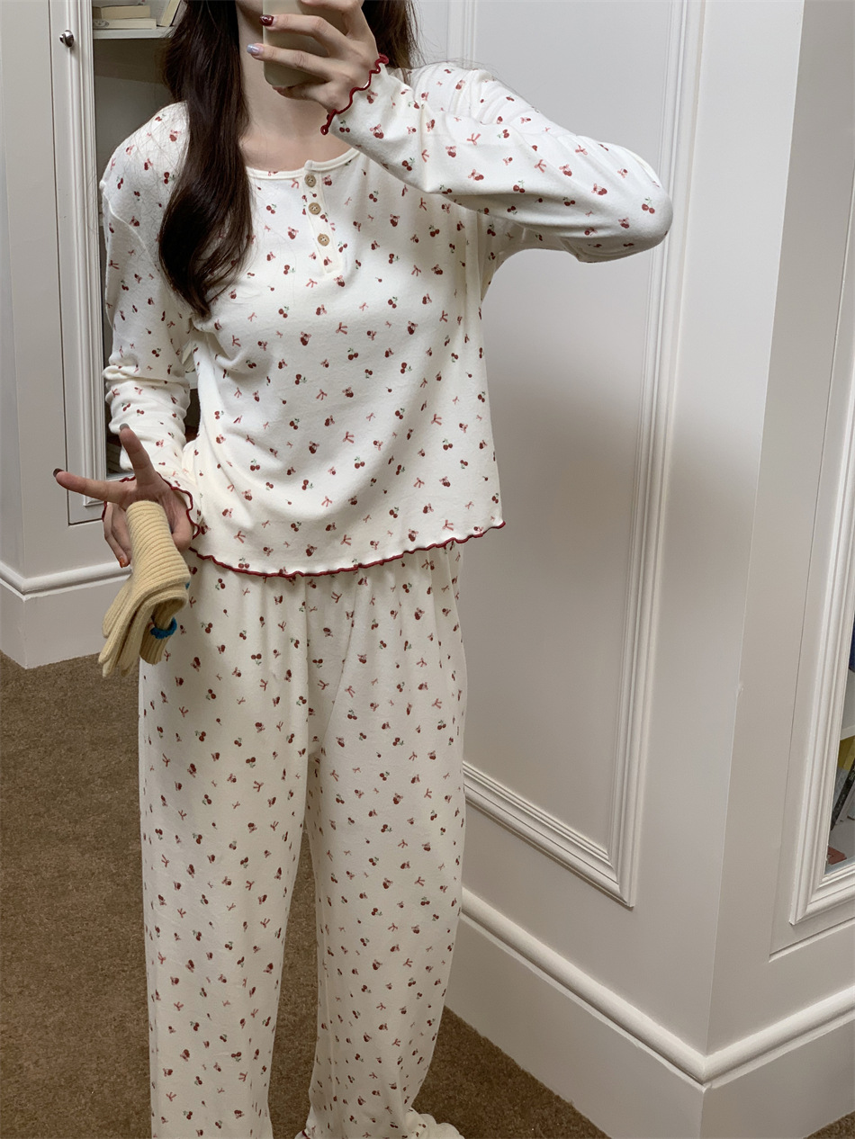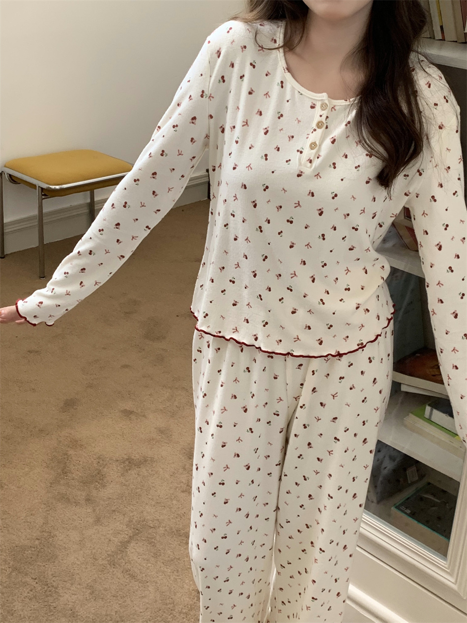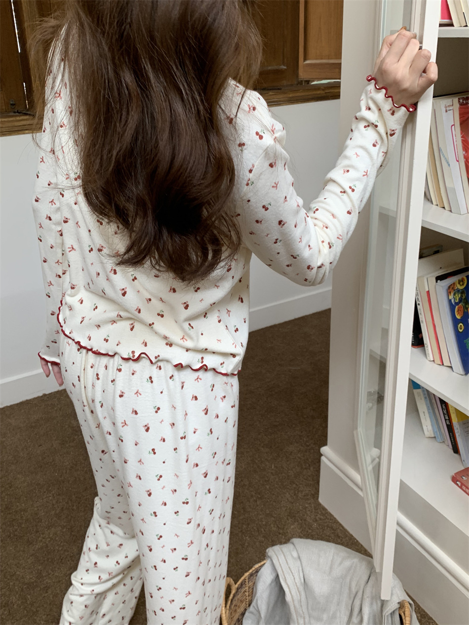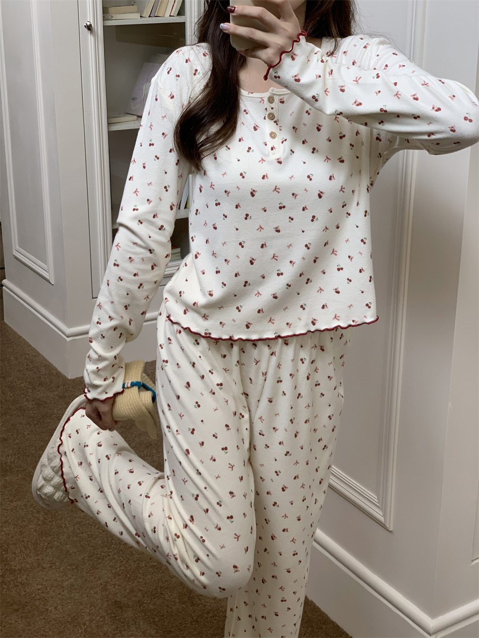 여성용 샌딩을위한 국경 간 스페셜 두꺼운 니트 우드 이어 엣지 체리 활 크루 넥 풀오버 홈 의류 파자마 세트