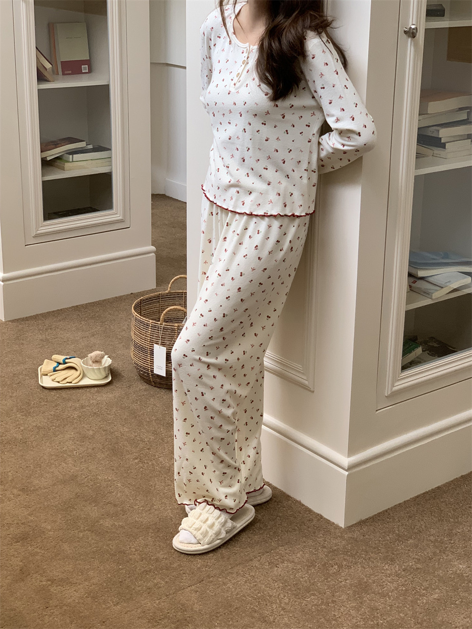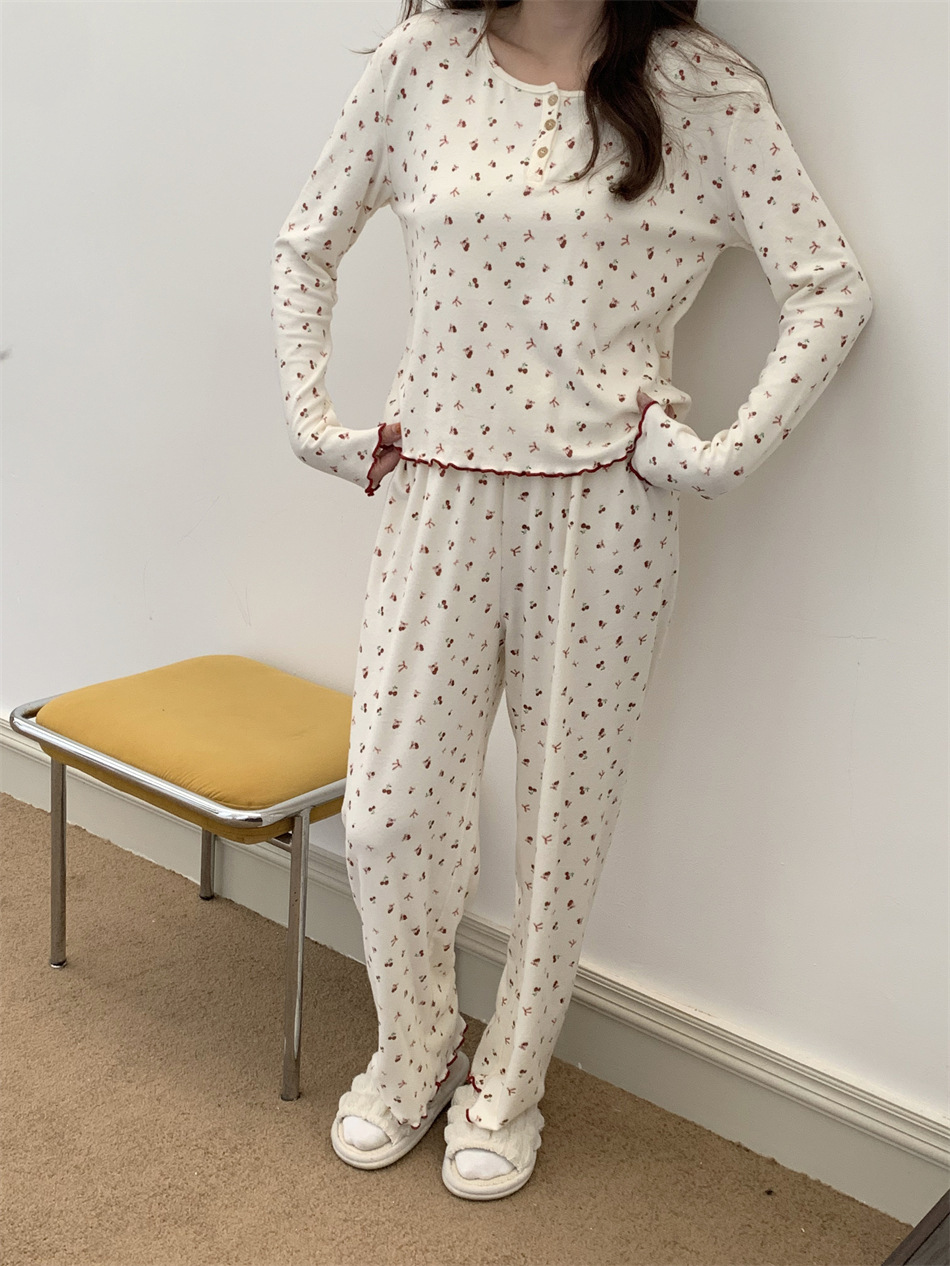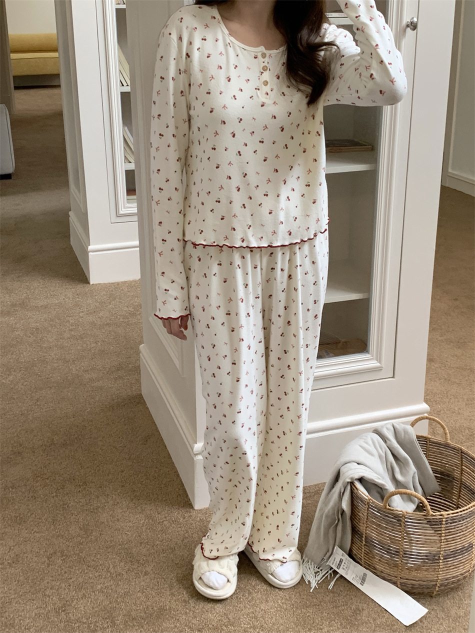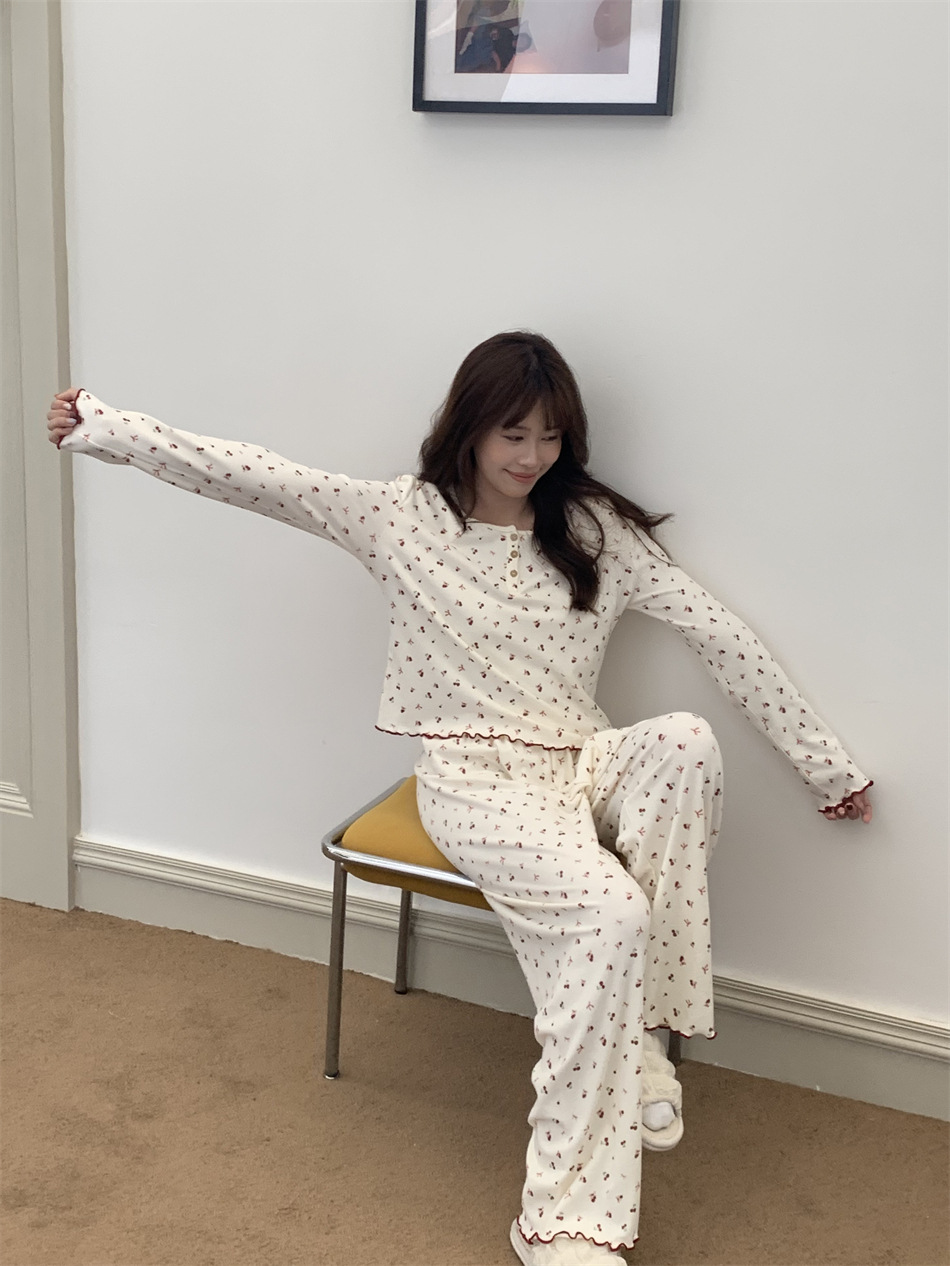 여성용 샌딩을위한 국경 간 스페셜 두꺼운 니트 우드 이어 엣지 체리 활 크루 넥 풀오버 홈 의류 파자마 세트