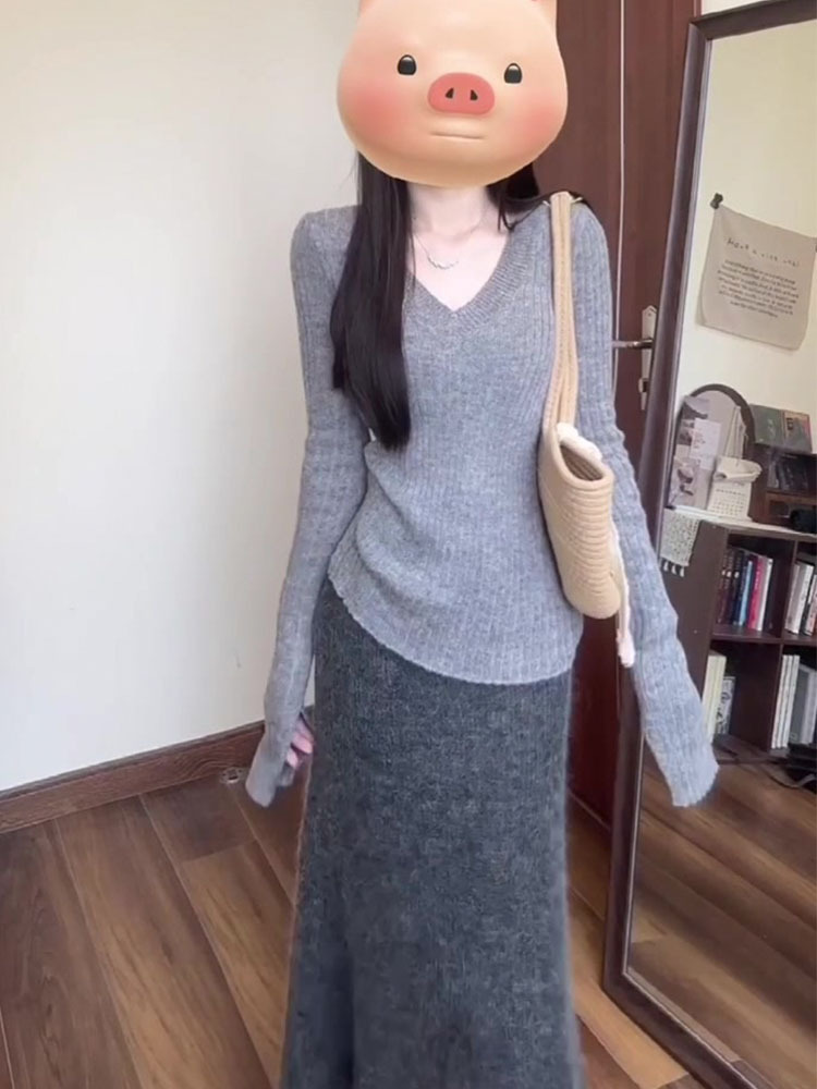 2024 년 한국 게으른 회색 스웨터 스웨터 하프 길이 원피스 투피스 원피스 여성 세트와 함께 이른 가을