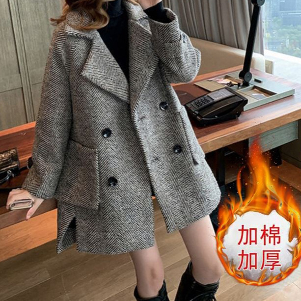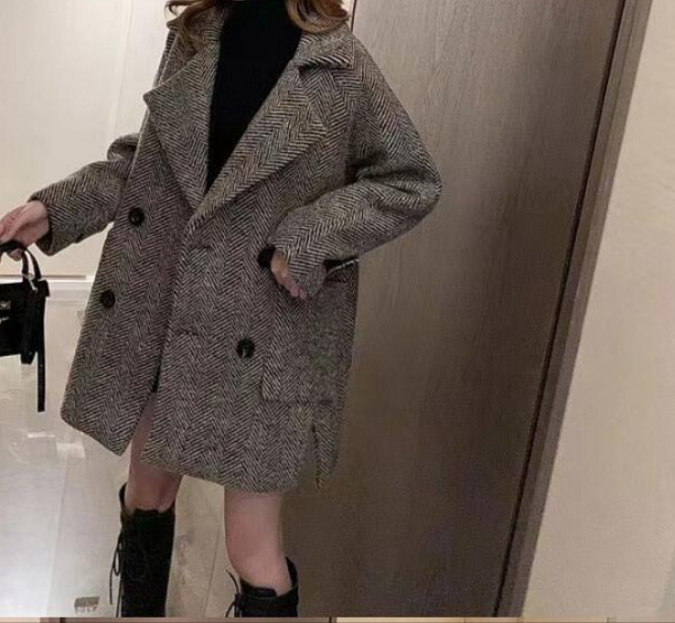 새로운 느슨한 영국 레트로 세트 칼라 퀼트 양모 코트 여자 중간 길이의 더블 브레스트 모직 코트스토어 가기