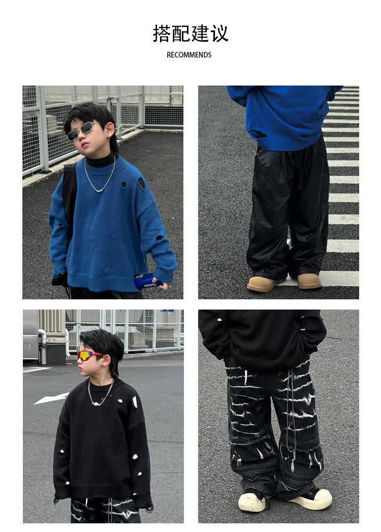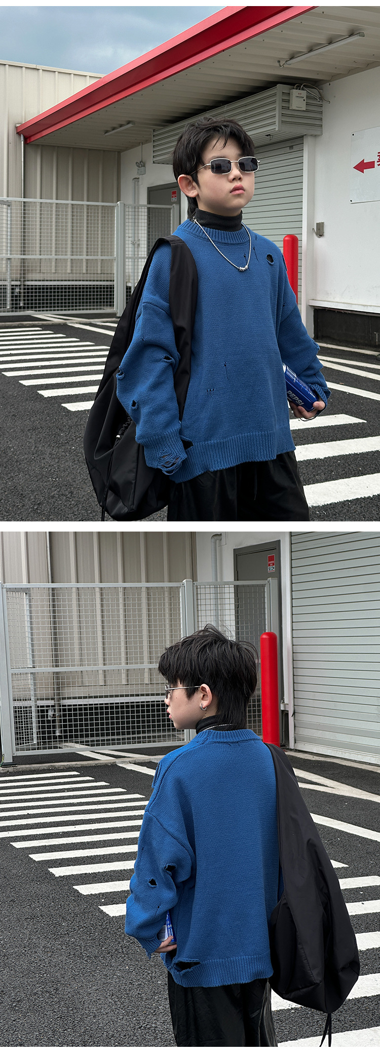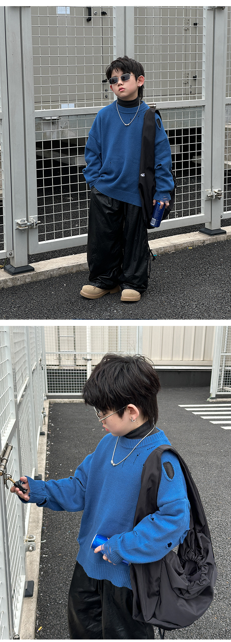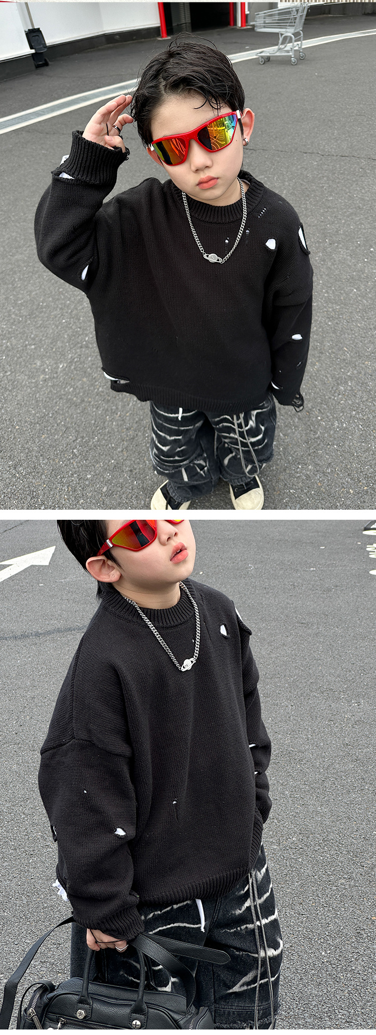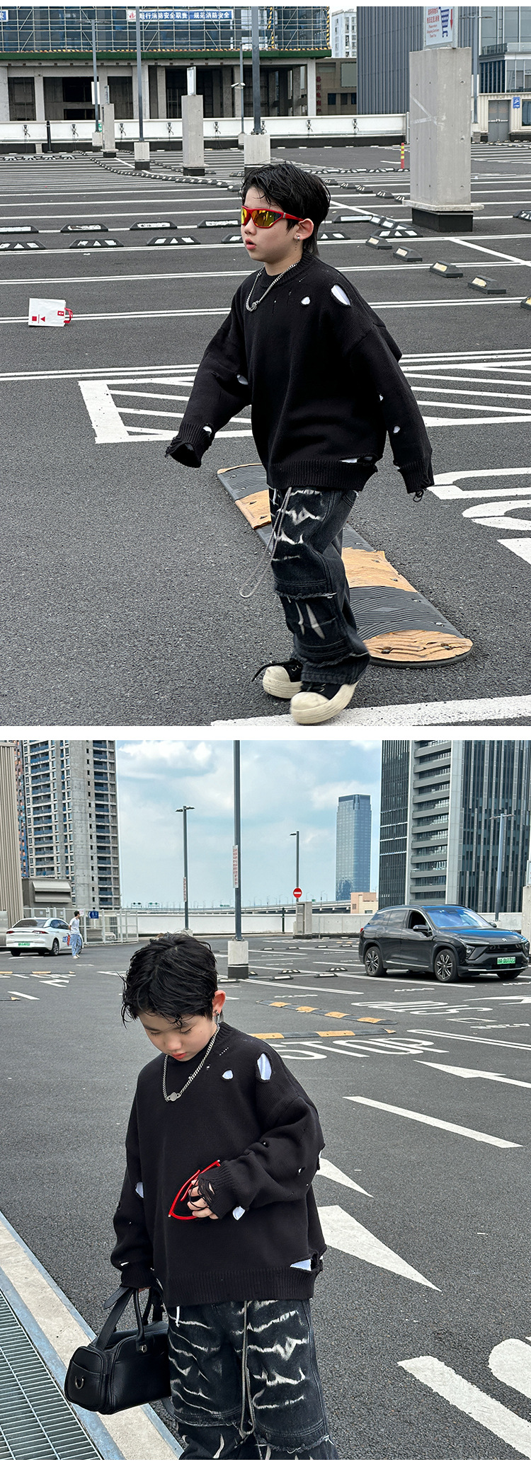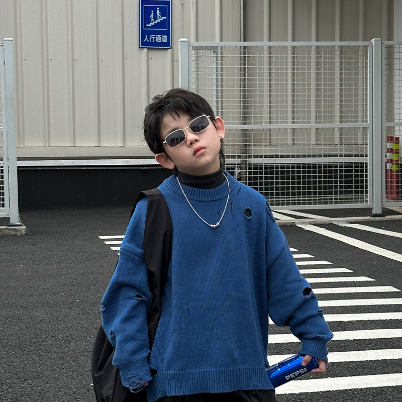 Yihong 의류 소년 스웨터 2025 가을, 겨울 새로운 어린이 찢어진 스웨터 긴팔 아동 의류 기본 의류 유행스토어 가기