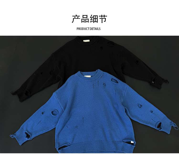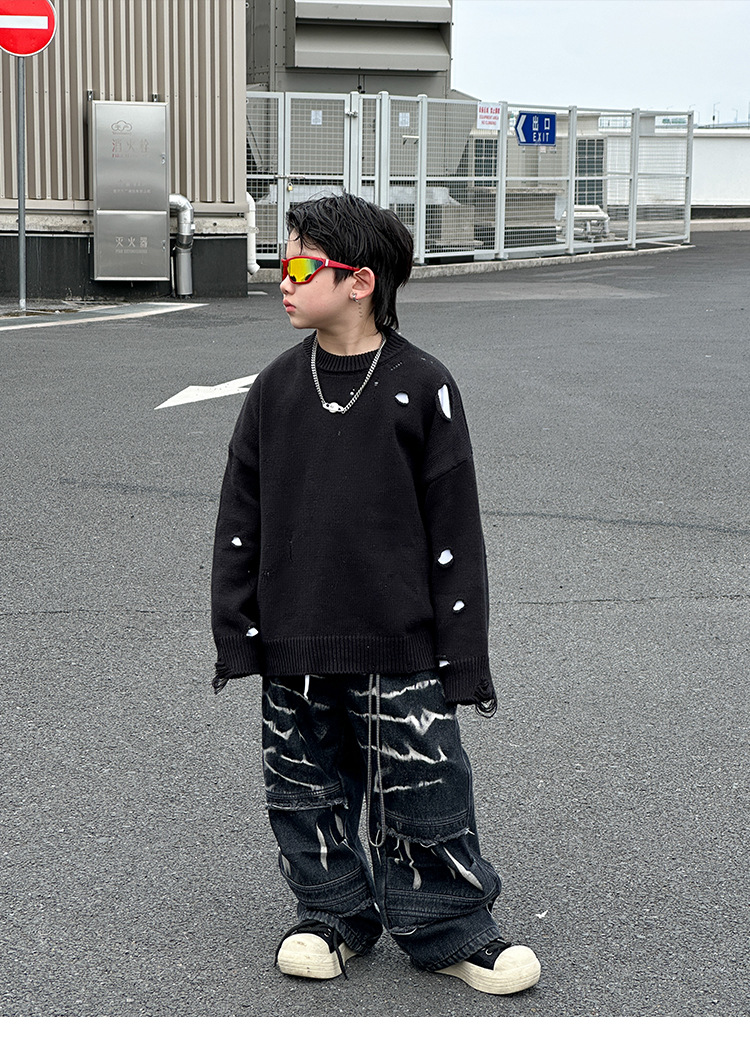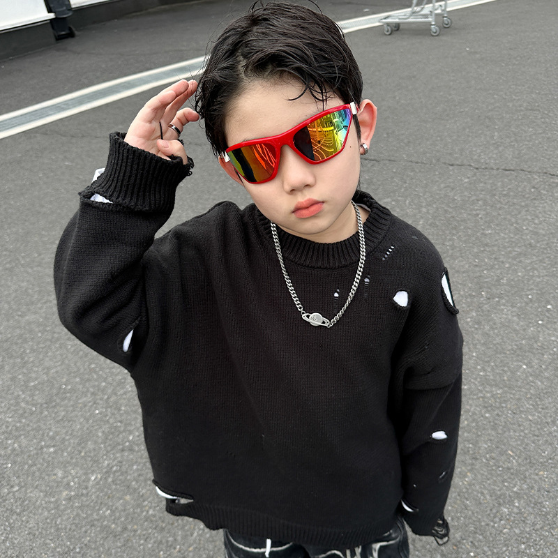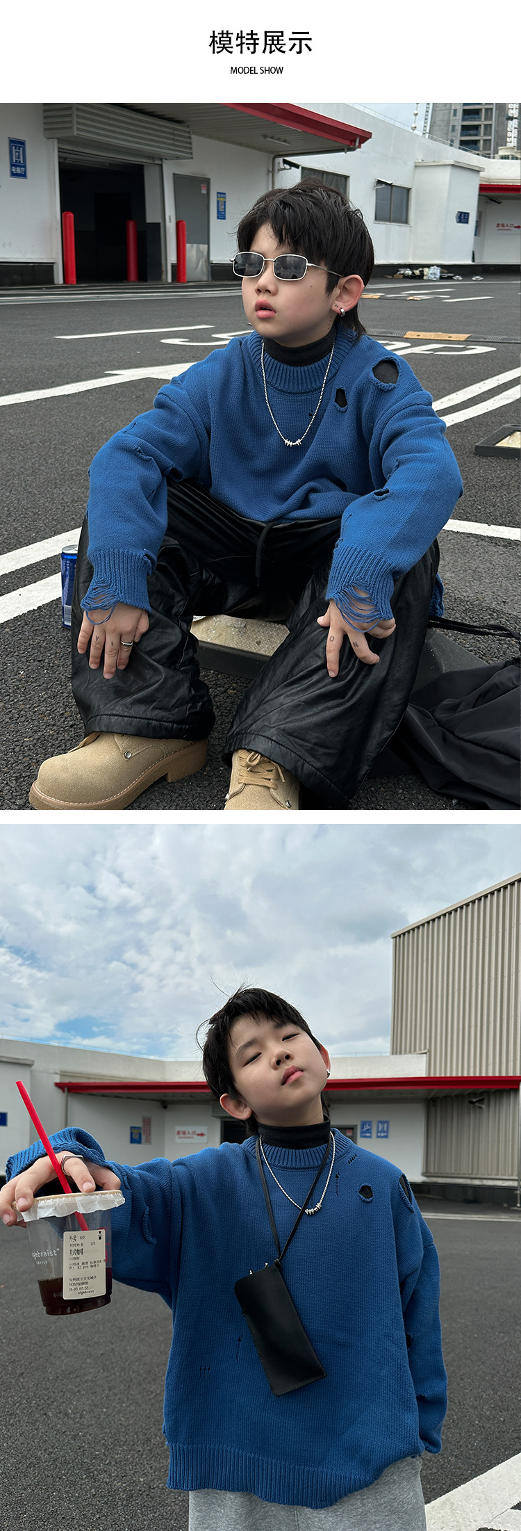 Yihong 의류 소년 스웨터 2025 가을, 겨울 새로운 어린이 찢어진 스웨터 긴팔 아동 의류 기본 의류 유행