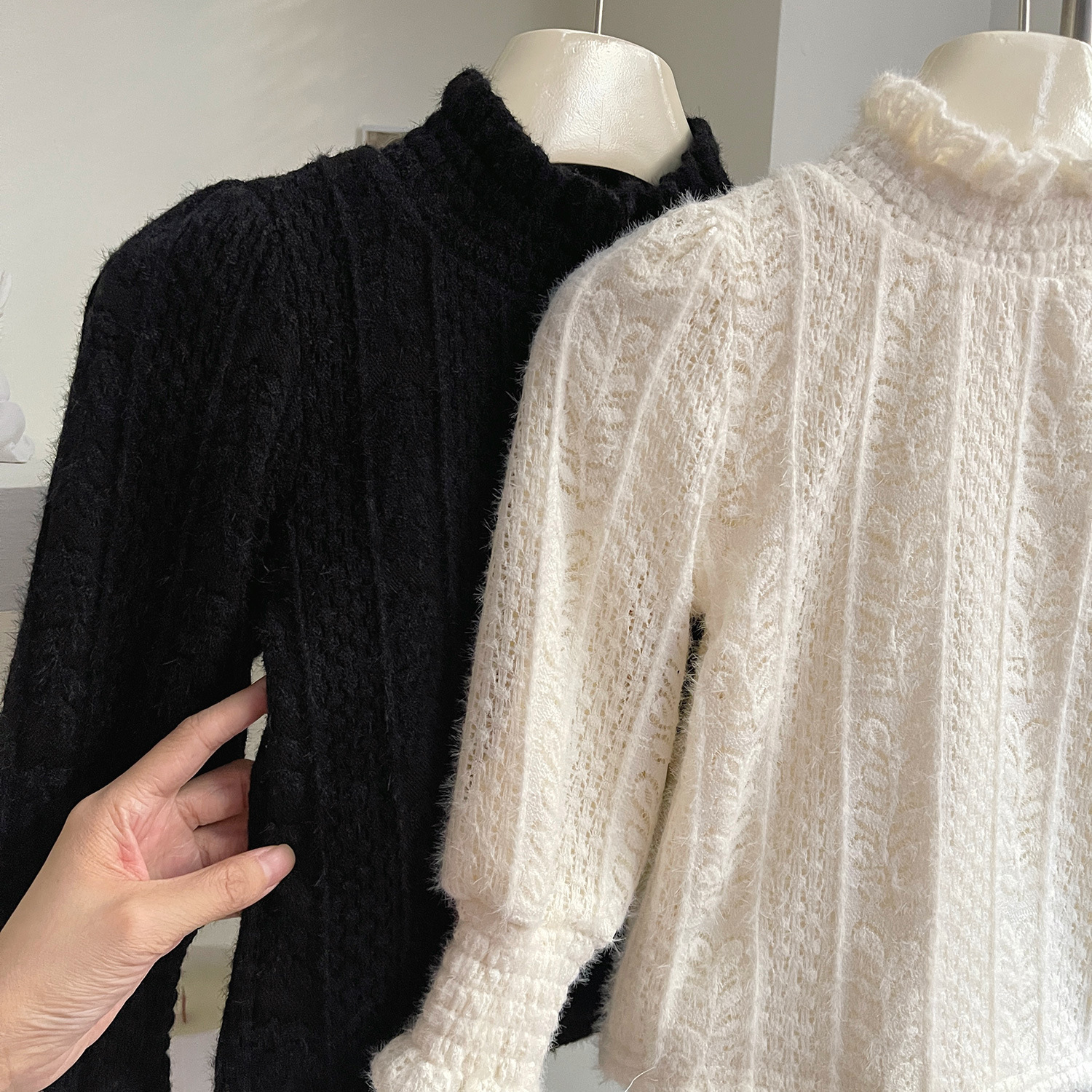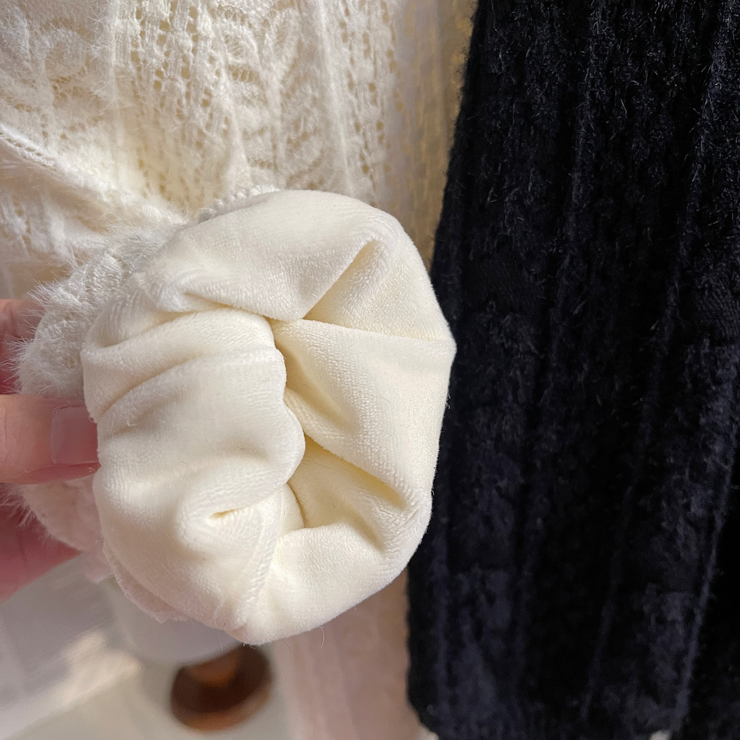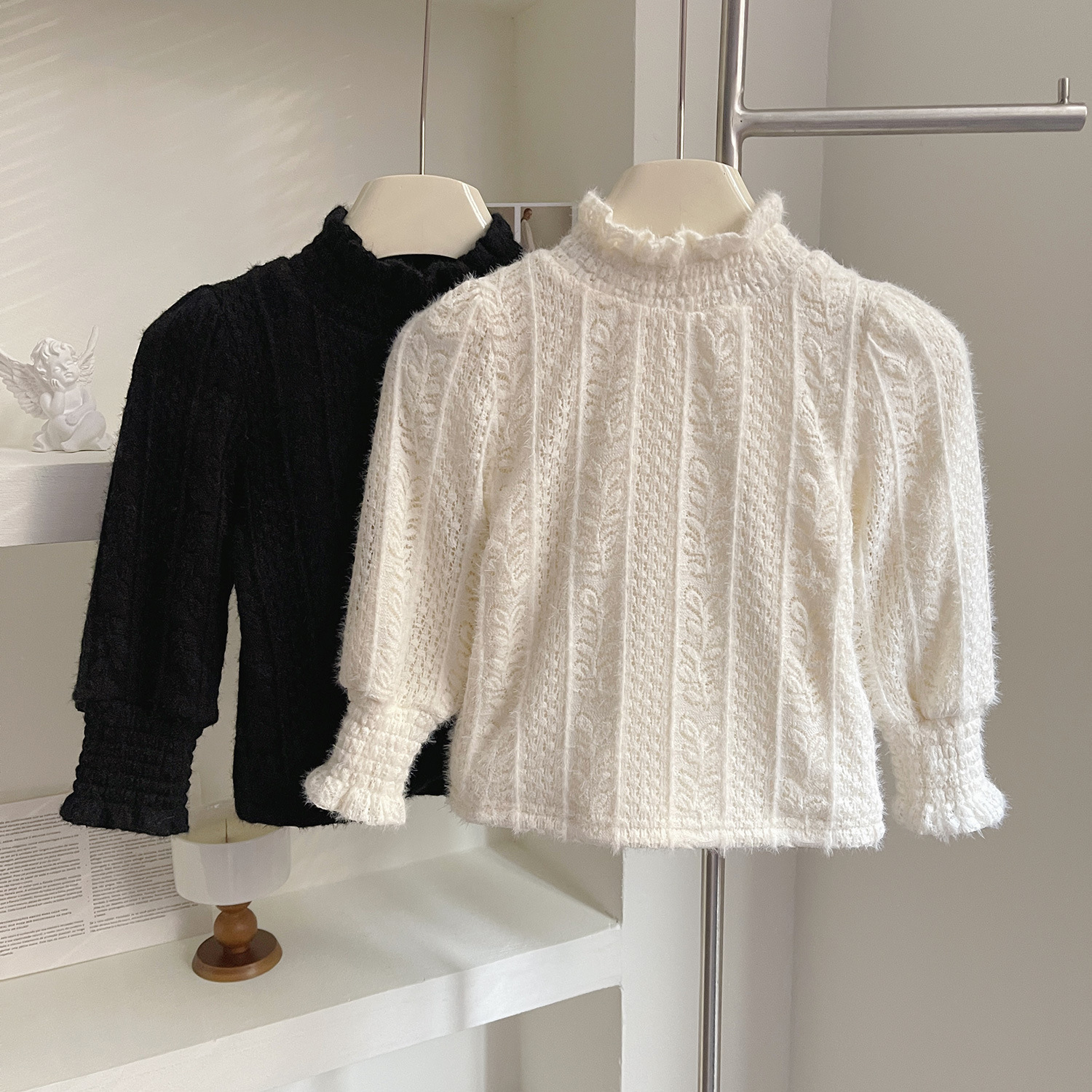 한국 스타일 패션 2025 겨울 여아용 플리스 안감 이너웨어 여아용 반하이넥 티셔츠 세련된 레이스 두꺼운 상의