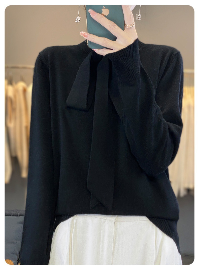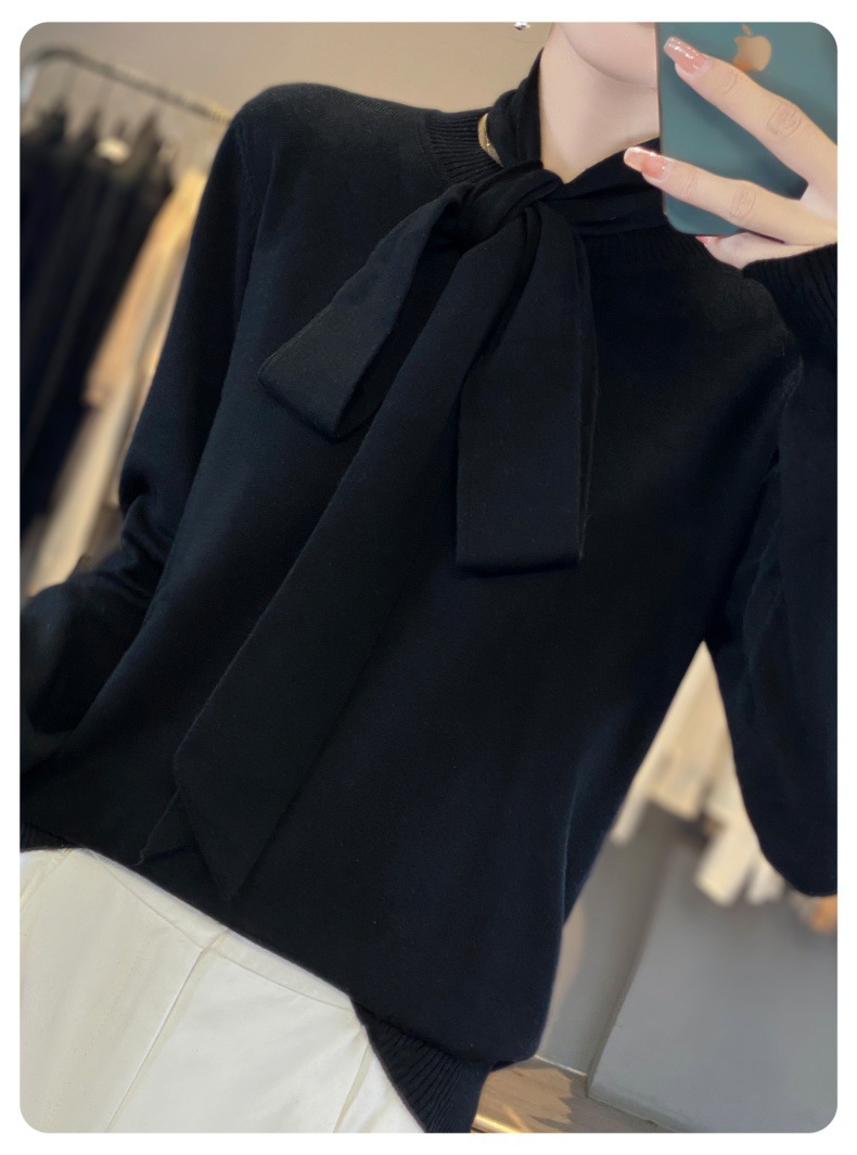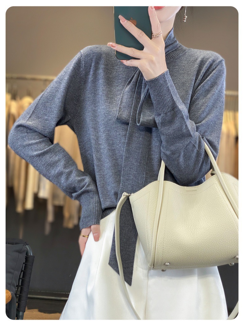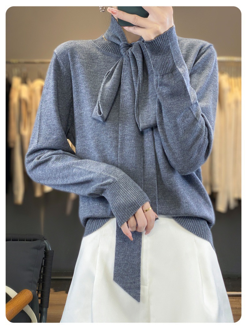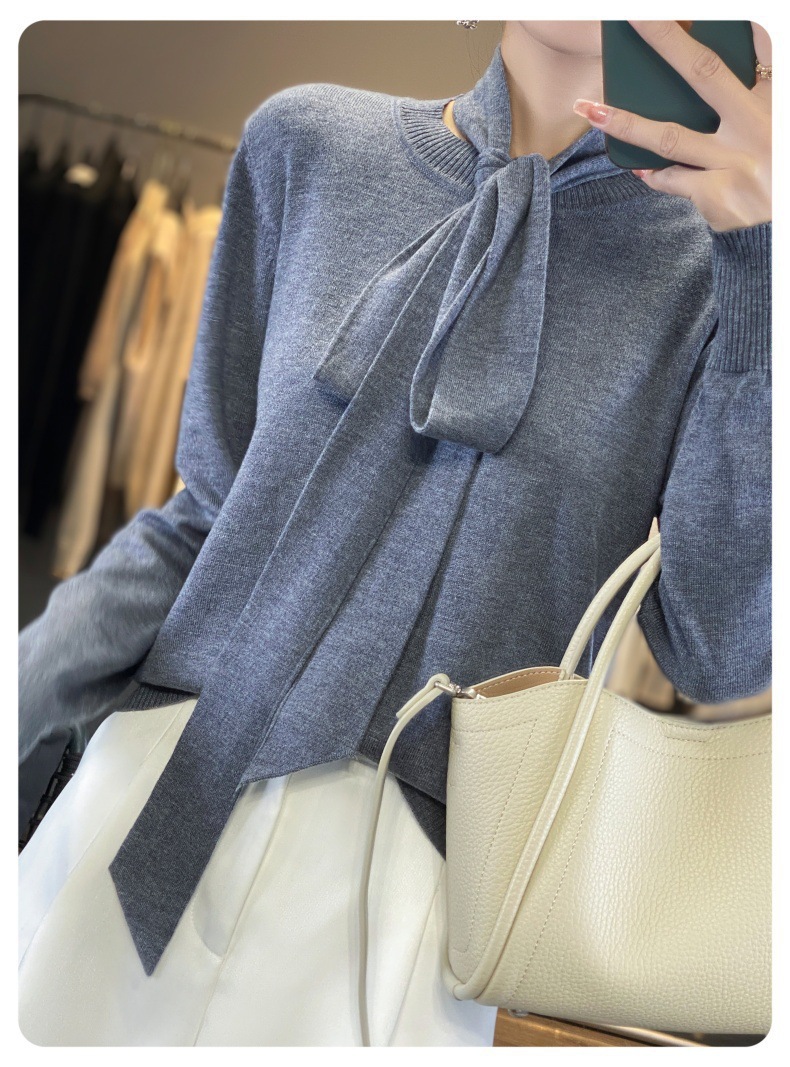 봄과 가을 우아한 여성 리본 양모 블렌드 스웨터 유행 외신베이스 그레이 크루 넥 스웨터