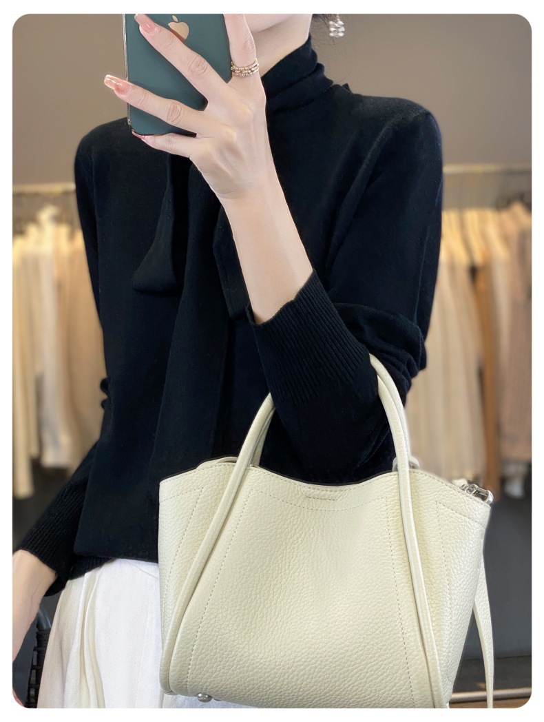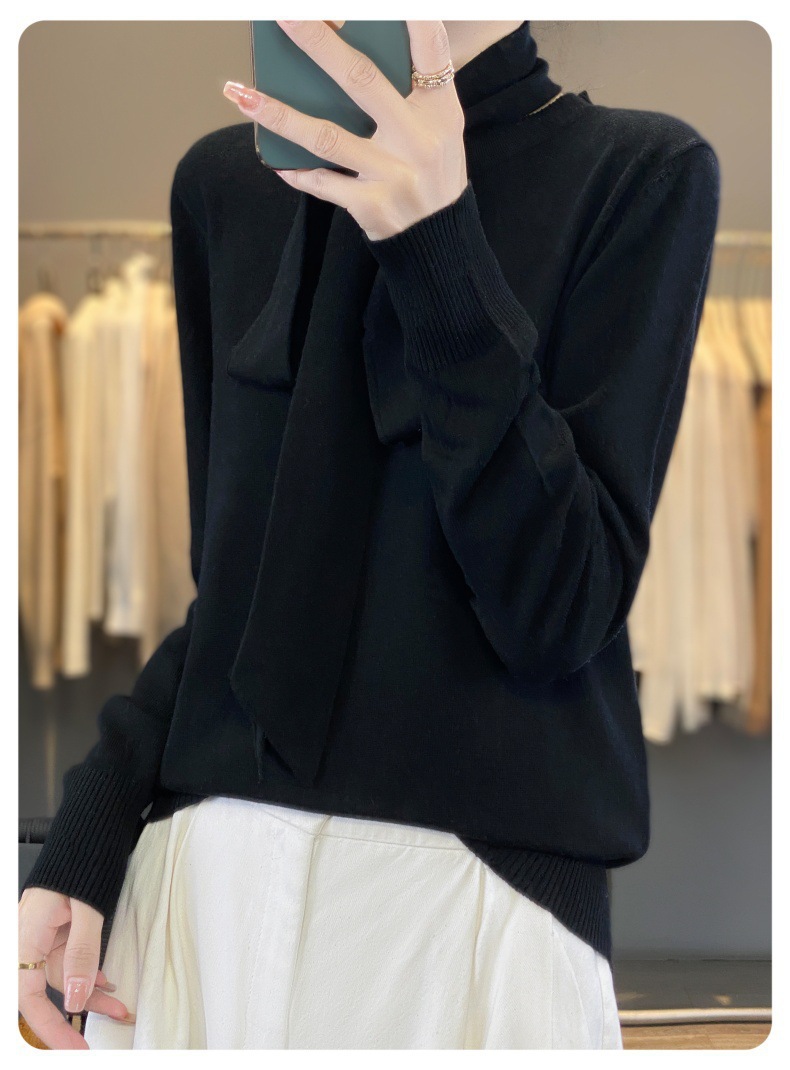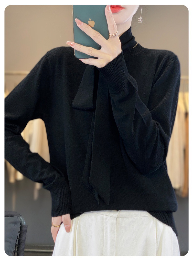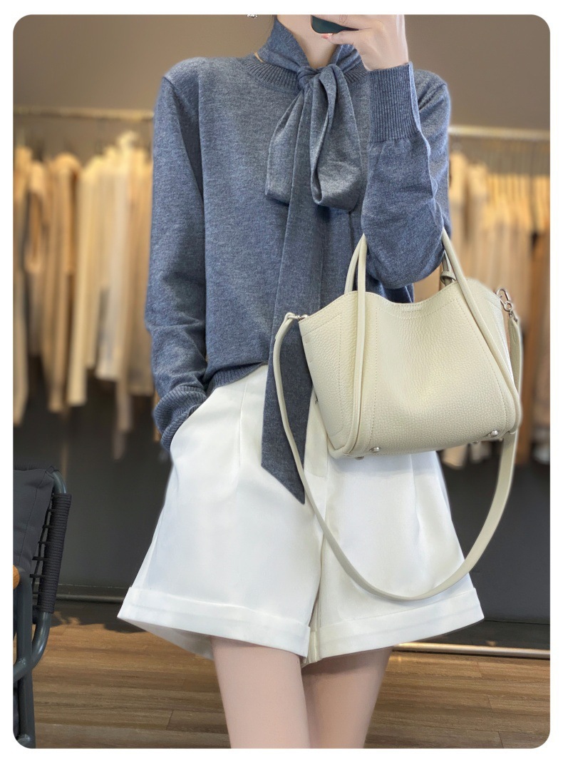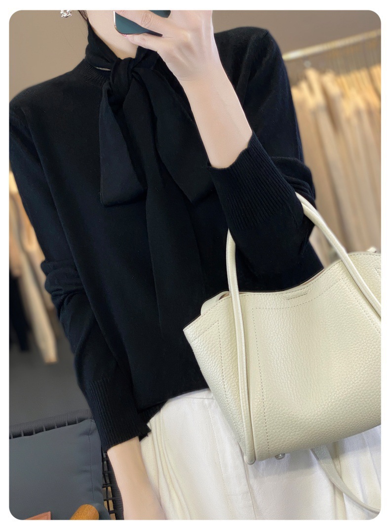 봄과 가을 우아한 여성 리본 양모 블렌드 스웨터 유행 외신베이스 그레이 크루 넥 스웨터