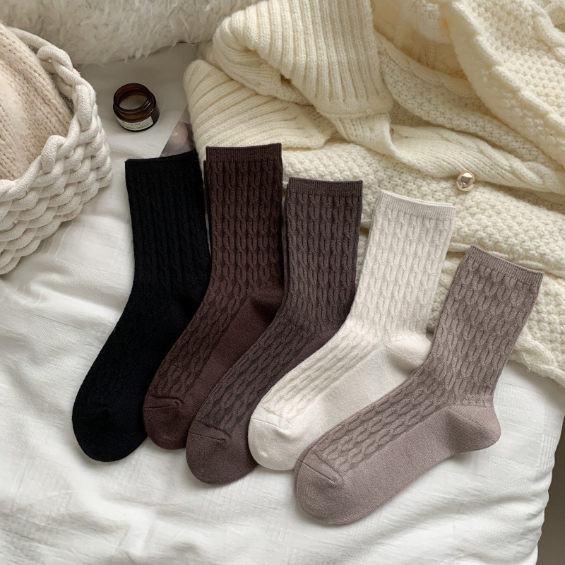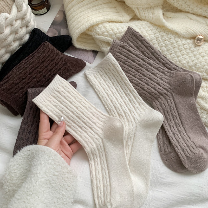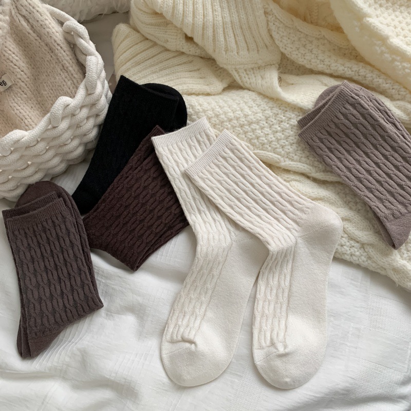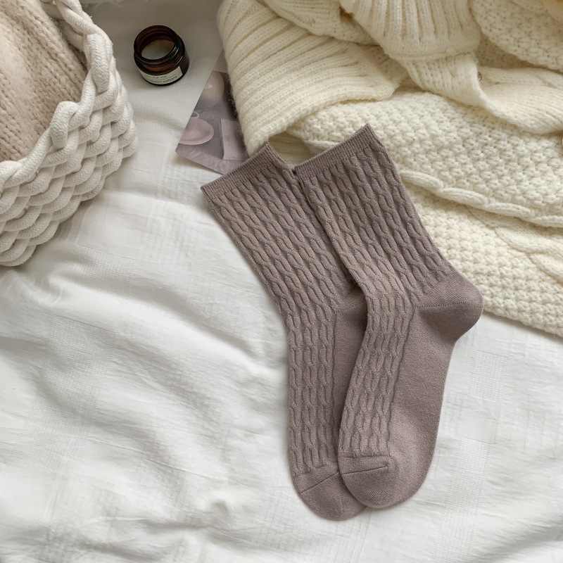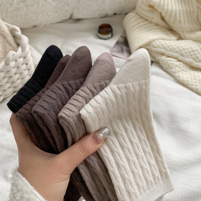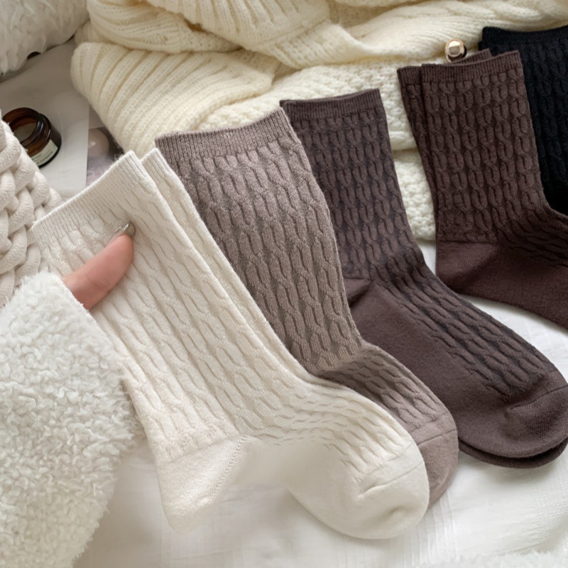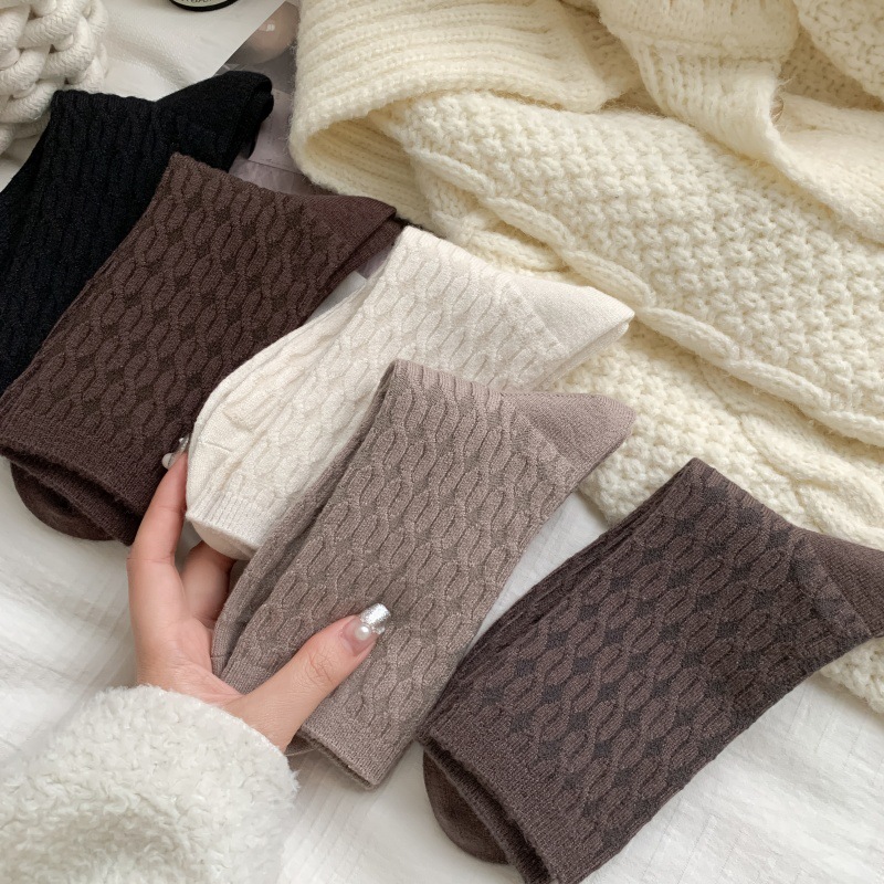 따뜻한 가을과 겨울 다크 브라운 스타일 작은 트위스트 캐시미어 여성용 미드 튜브 양말 부드러운 양말 두껍고 섬세한 일본 스택 양말