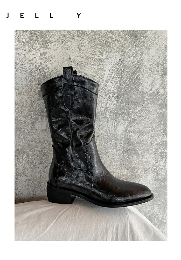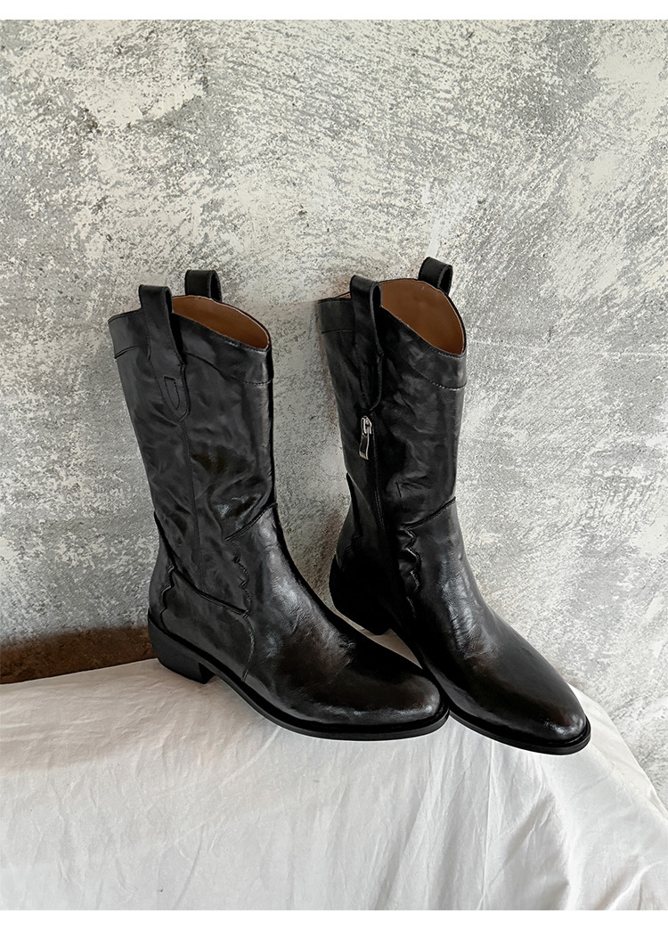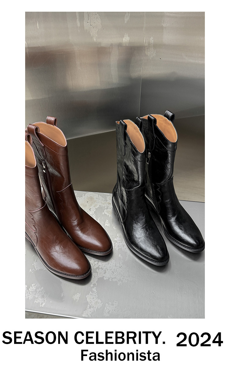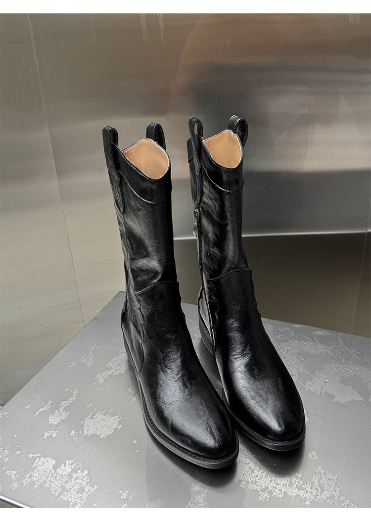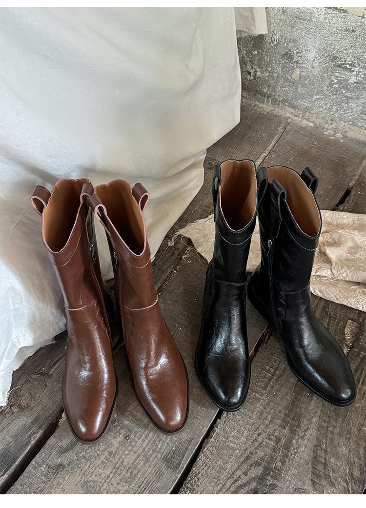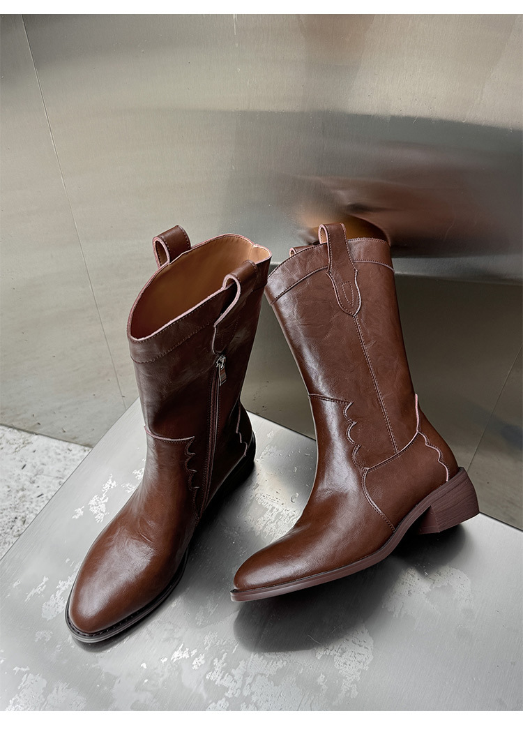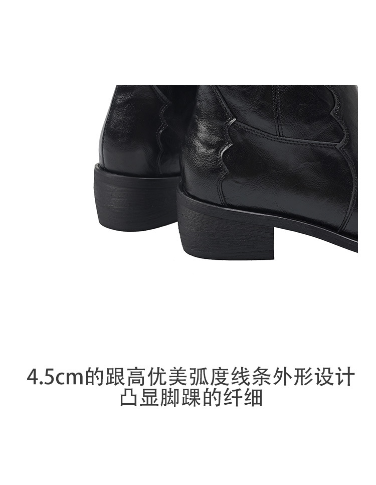 Kmeizu Skinny 4.5cm 두꺼운 힐 미들 부츠 여성용 가을 및 겨울 V-입 웨스턴 부츠 달콤한 쿨 미들 힐 송아지 기사 부츠스토어 가기