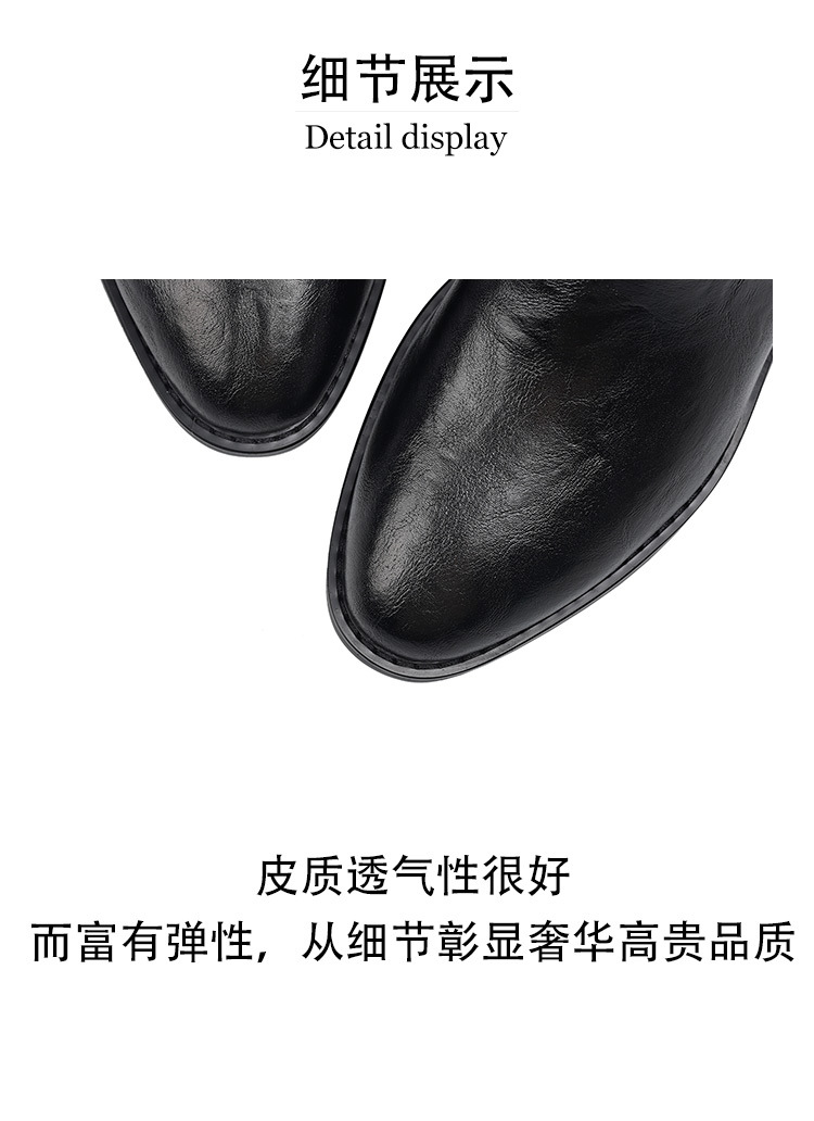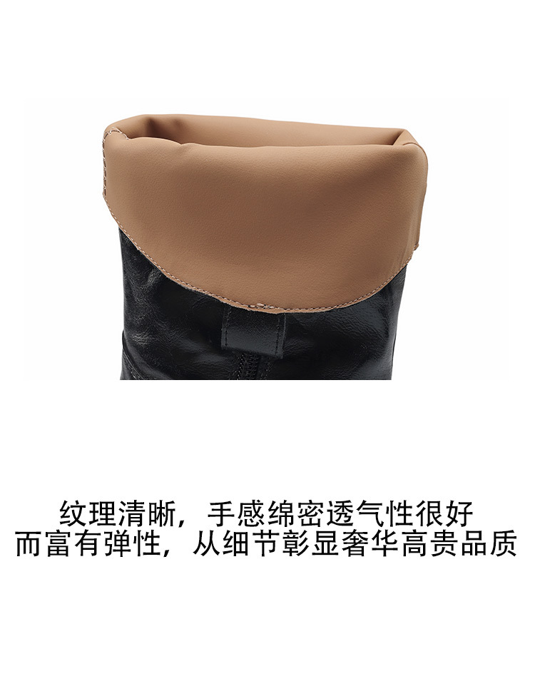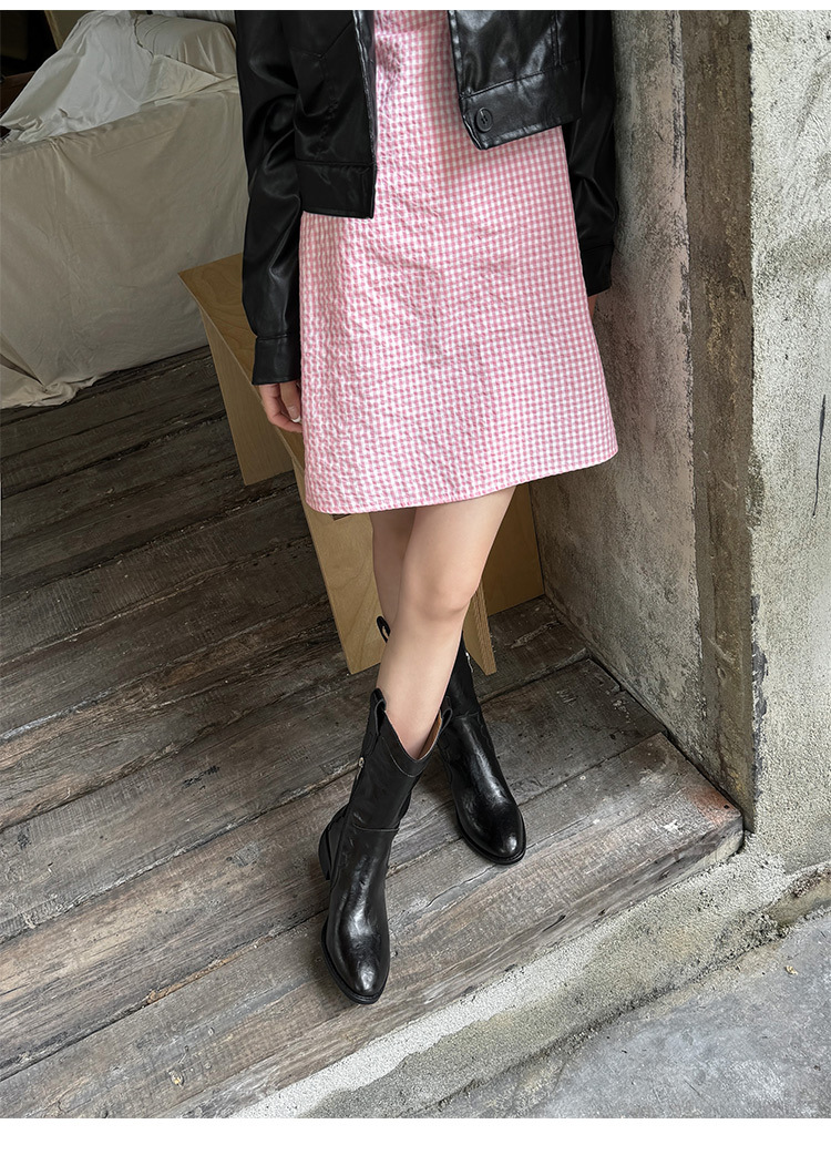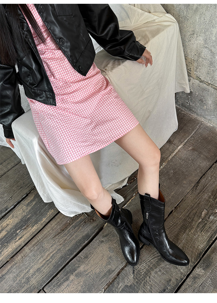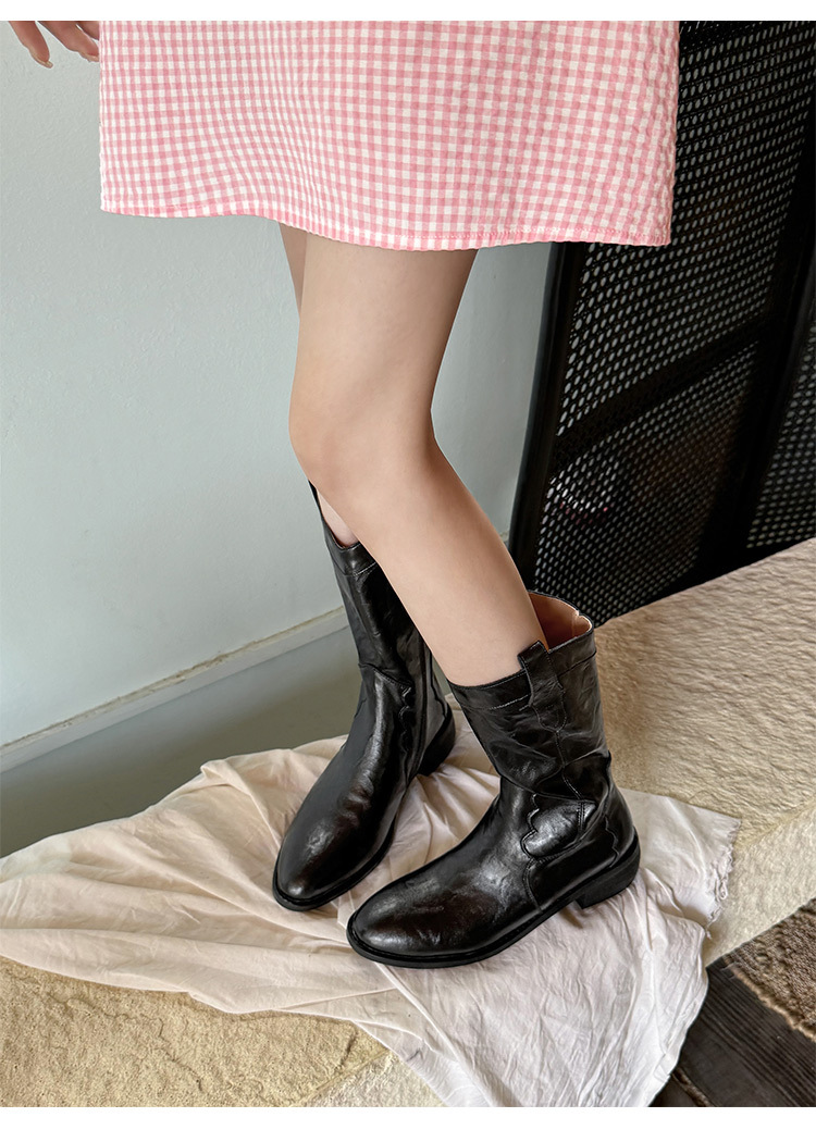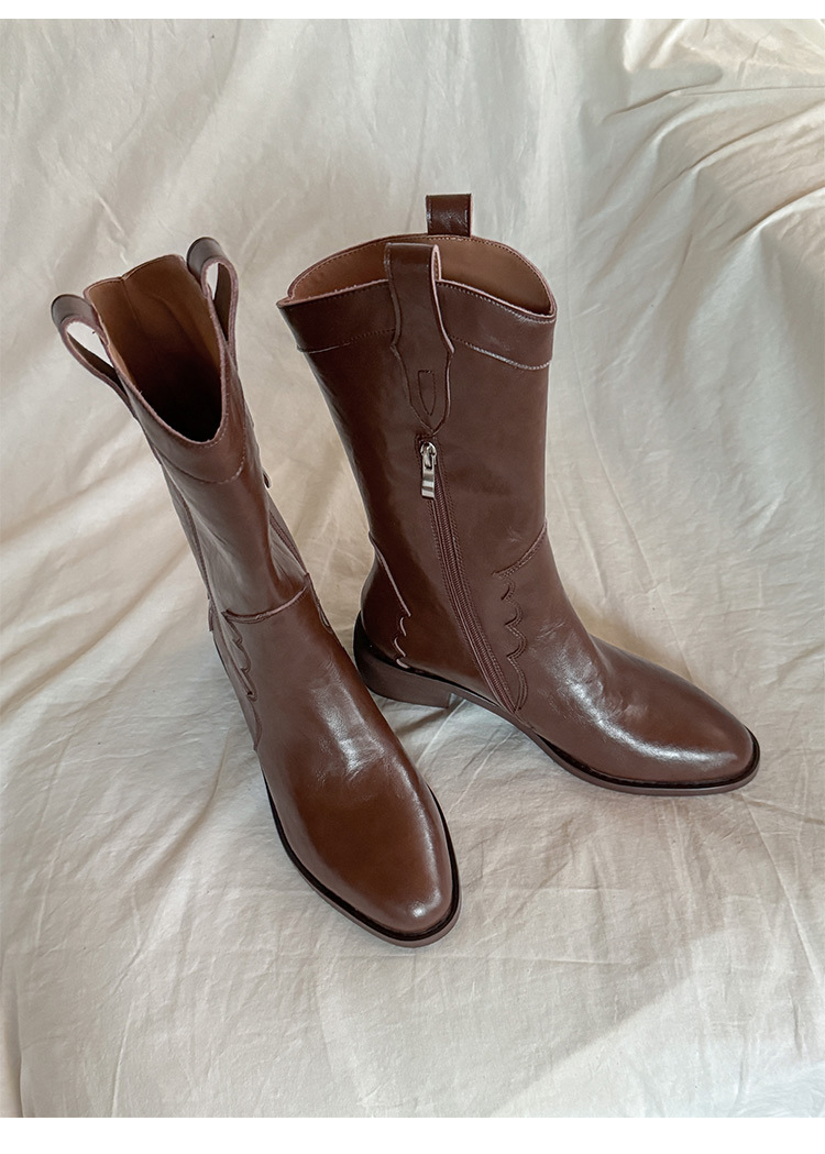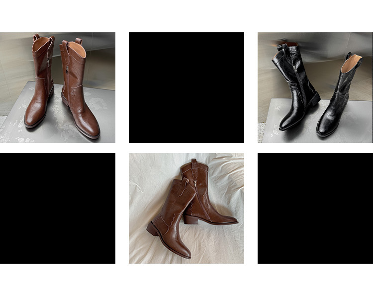 Kmeizu Skinny 4.5cm 두꺼운 힐 미들 부츠 여성용 가을 및 겨울 V-입 웨스턴 부츠 달콤한 쿨 미들 힐 송아지 기사 부츠스토어 가기