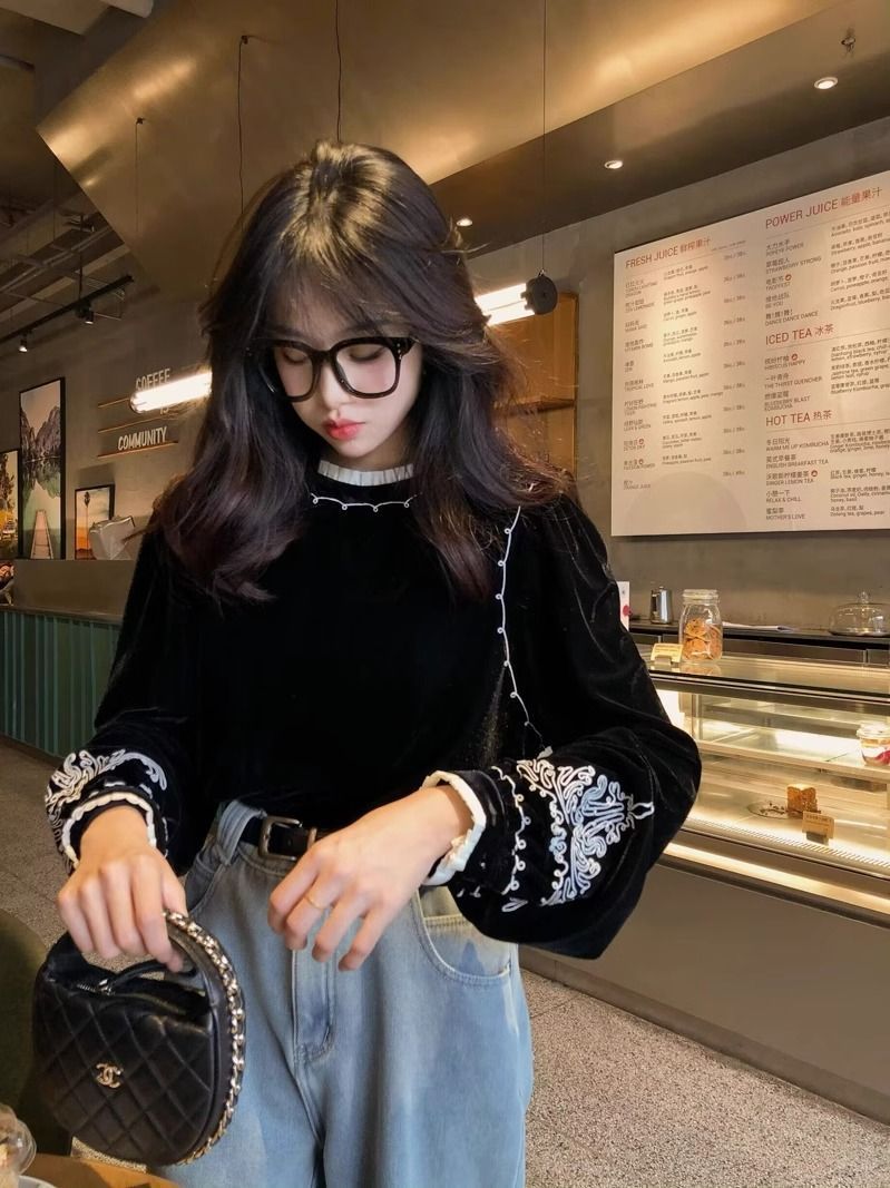 봄 2024 레트로 패션 새로운 중국 스타일 흑백 자수 우아한 올 매치 랜턴 슬리브 벨벳 셔츠스토어 가기
