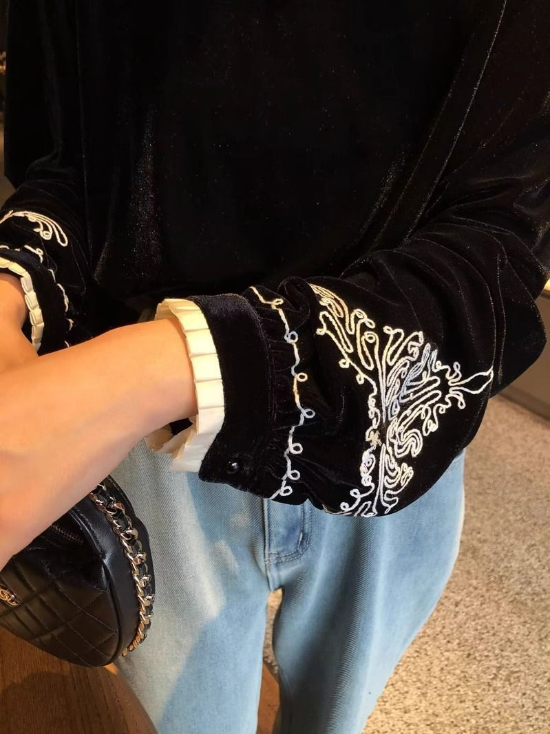 봄 2024 레트로 패션 새로운 중국 스타일 흑백 자수 우아한 올 매치 랜턴 슬리브 벨벳 셔츠