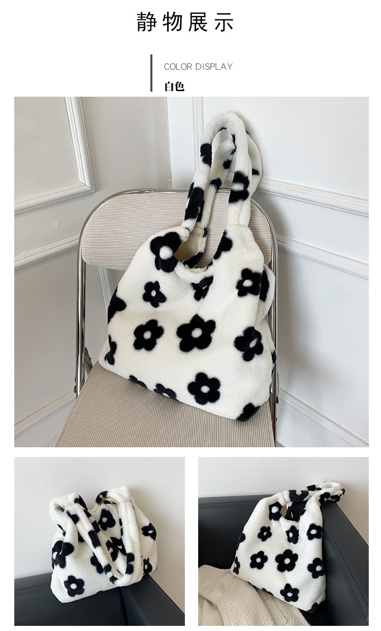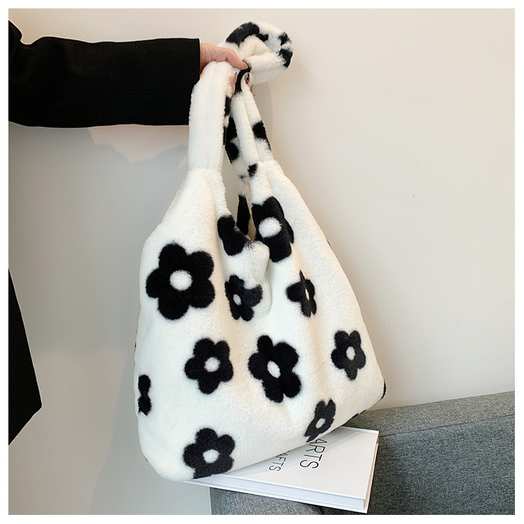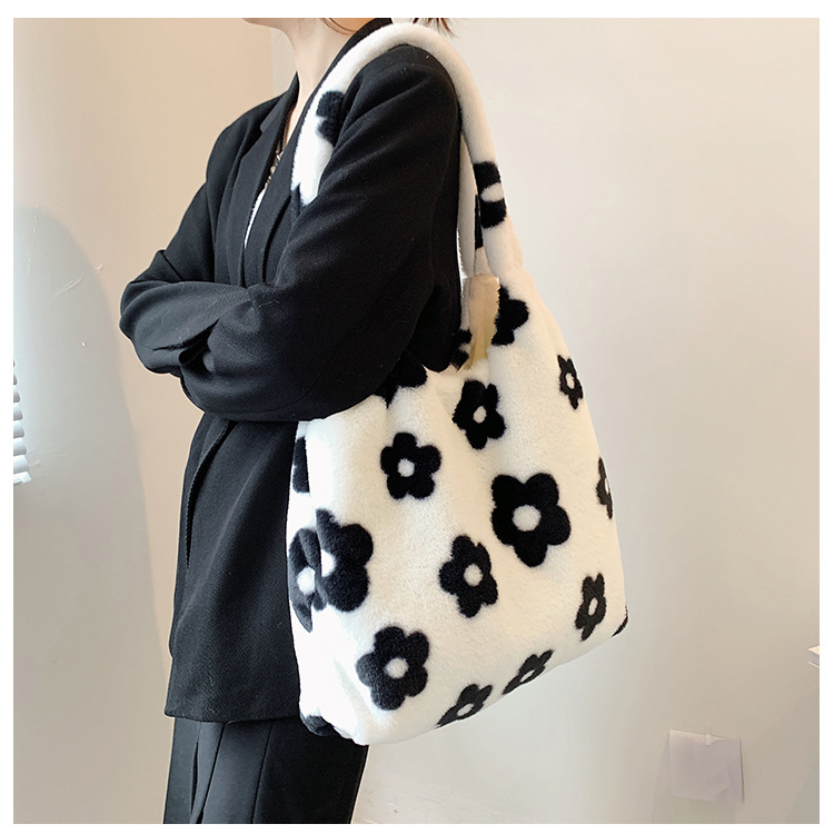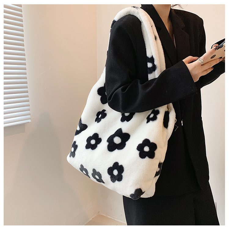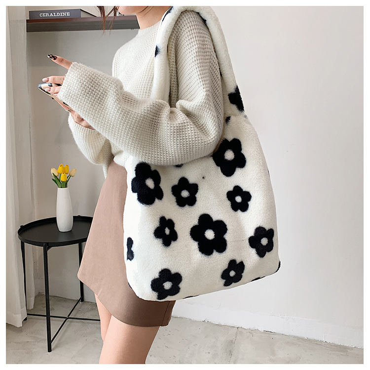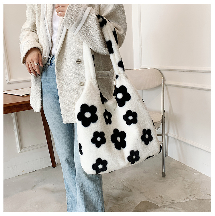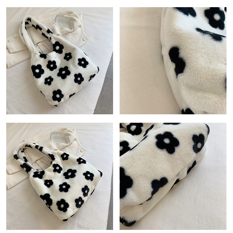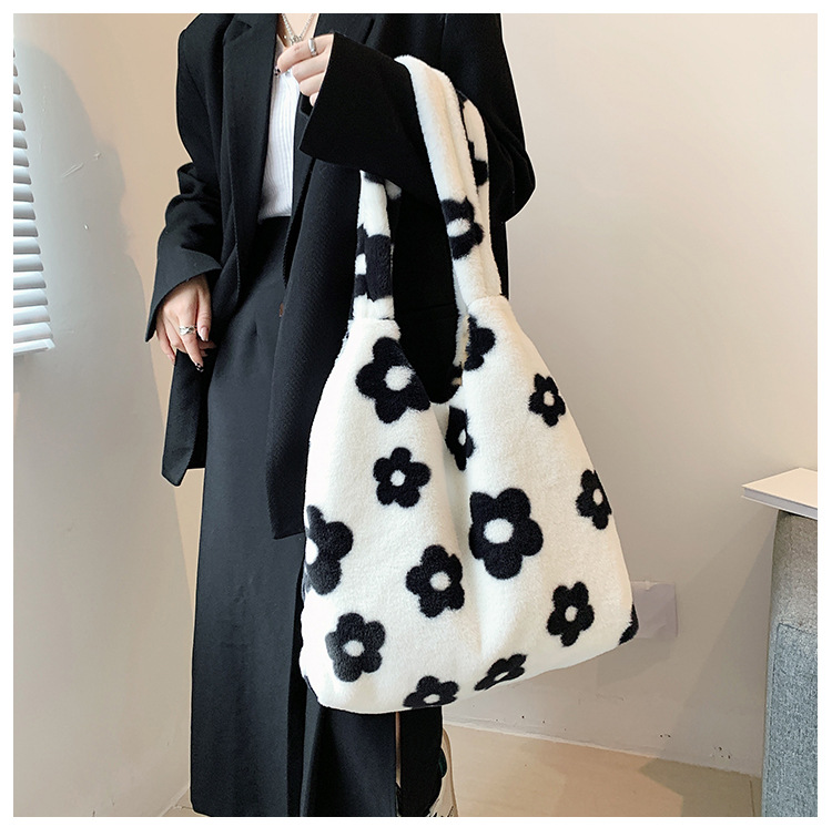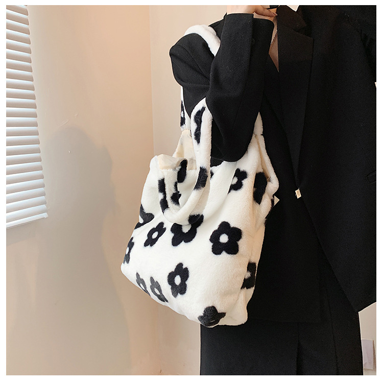 가방 여성의 2024 가을과 겨울 일본 귀여운 흑백 꽃 봉제 가방 어깨 통근 크로스 바디 토트 백 트렌디스토어 가기